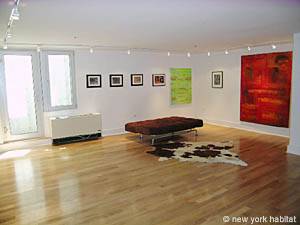 - NY-12201 is a studio accommodation in East Village that has two sleeping spaces — a loft and a futon — in the living room. The apartment also has a retro feel with its teal chair, carpet and curtains.