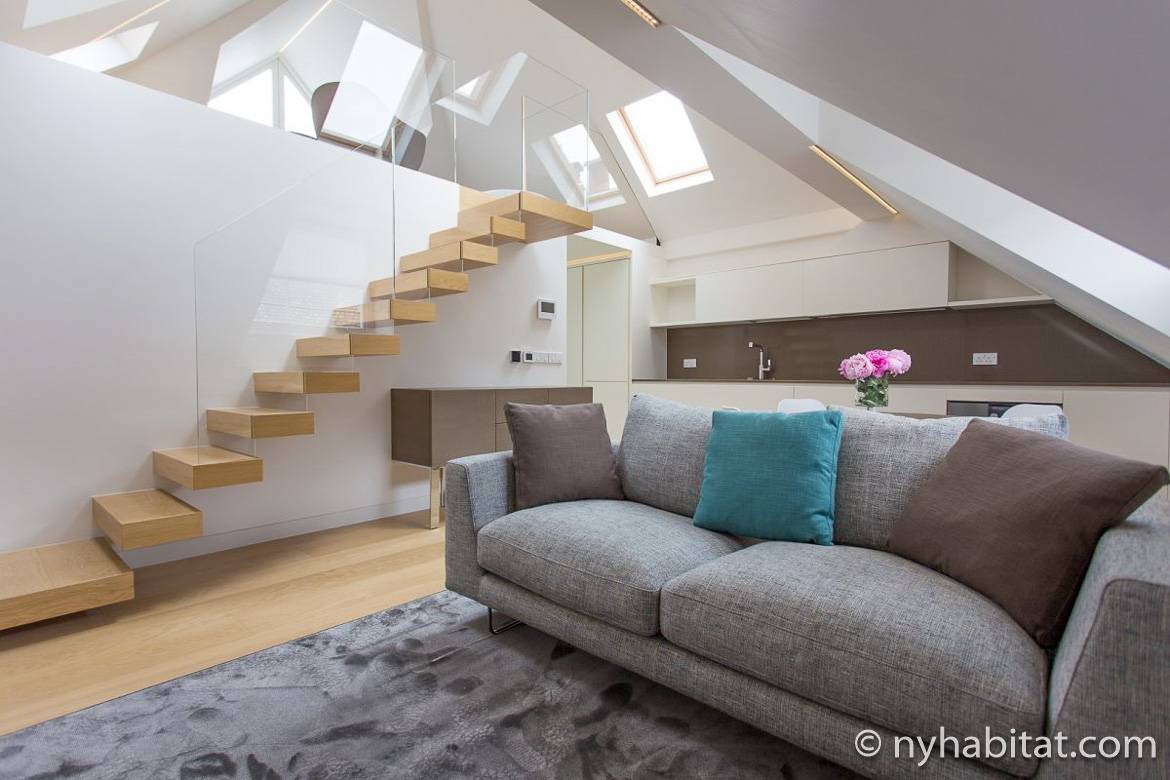 À 10 minutes de marche de Covent Garden, vous pourrez louer ce penthouse T3 dans le quartier de Soho. Cet appartement à la fois chic et moderne dispose de parquet et d’un plafond mansardé avec des fenêtres de toit qui permettent à la pièce d’être baignée de lumière naturelle (et du clair de lune). Des escaliers suspendus vous conduisent de la pièce à vivre au coin salon de la mezzanine. La cuisine complètement équipée comprend un lave-vaisselle, tandis qu’une table à manger pour quatre personnes vous permet de dîner confortablement. La chambre possède un lit double, une armoire en bois encastrée ainsi qu’une table de nuit. Et si vous manquez de lumière, vous pouvez toujours vous rendre sur le toit-terrasse qui offre une magnifique vue sur la ville !