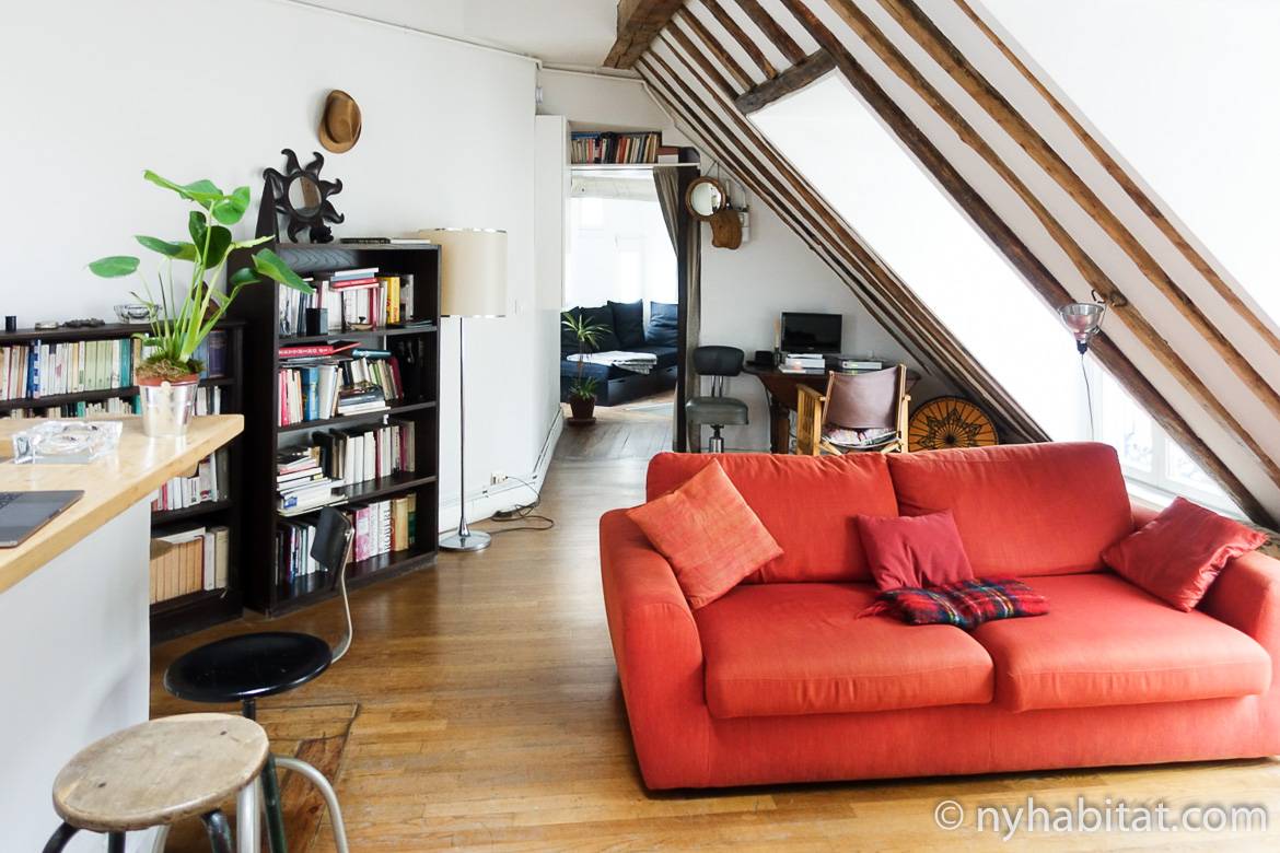 Depuis cet appartement T2 situé à la Bourse, vous pourrez tout à la fois profiter des attractions principales et d’une détente sans pareil. À deux pas du jardin des Tuileries, cette location meublée sera aussi pittoresque que centrale pour organiser une balade automnale vivifiante à travers la ville. Vous y apprécierez les aménagements parisiens classiques, tels que les poutres apparentes au plafond et les portes-fenêtres, ainsi qu’une mansarde dans la partie supérieure de ce duplex. Ceux qui recherchent calme et relaxation au cœur de Paris trouveront ici de quoi se régaler, profitant des nombreuses bibliothèques du salon pour prendre un livre et s’enfermer dans le petit cocon de l’alcôve, le coin lecture idéal ! Vous profiterez également du confort d’une baignoire dans la salle de bain ainsi que d’un lit double et d’un futon afin de vous relaxer dans la chambre. Enfin, lorsque vous vous sentirez prêts à replonger dans l’activité grouillante des plus célèbres attractions parisiennes, n’oubliez pas que vous n’êtes qu’à deux pas du Louvre !