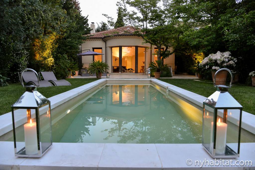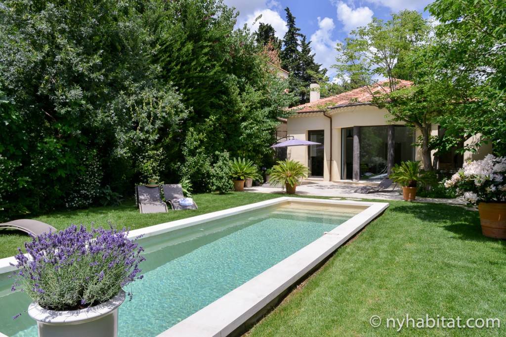 It isn’t just swanky interior amenities and creature comforts that make the Villa Cézanne a great choice for a stay in the South of France: the terrace and pool outside are stunning! A dining table for eight lets you enjoy your meals en plein air, soaking up the warm Provençal sun during the day or enjoying cool breezes in the evenings. A gas grill makes cooking Provençal cuisine outdoors a fun experience for the whole family. Head to one of our favorite Provence markets to stock up on fresh ingredients.