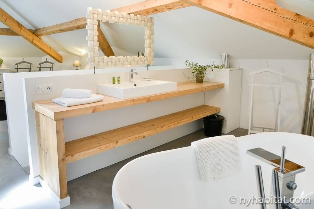 With one full bathroom, three French-style salles d’eau, and one separate toilet, this villa ensures there will never be a line for the bathroom during your stay! Bathroom 1 is downstairs and connected to one of the bedrooms. It offers a toilet, a tub with a handheld shower attachment, and a large mirror. Bathrooms 2 and 3 are located upstairs and are open to the villa’s exposed wooden rafters that contrast their gleaming white tubs. Bathroom 4 has a rainfall-style shower that opens to the rest of the bathroom and two sinks, making it perfect for couples! Bathroom 5 is a separate toilet, with a washer and dryer for your convenience.
