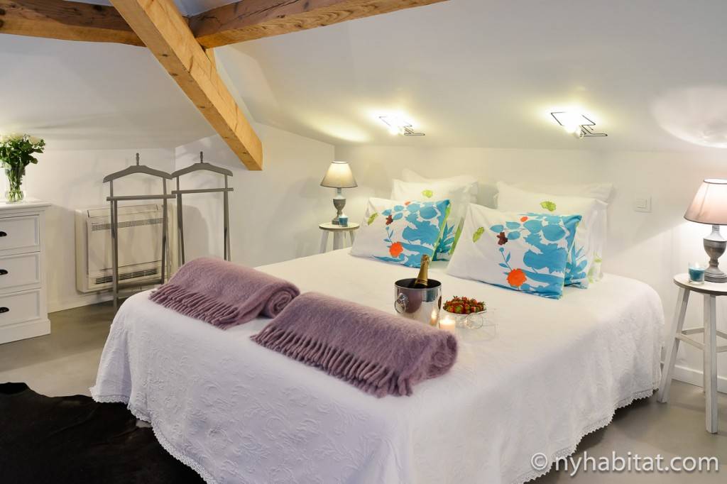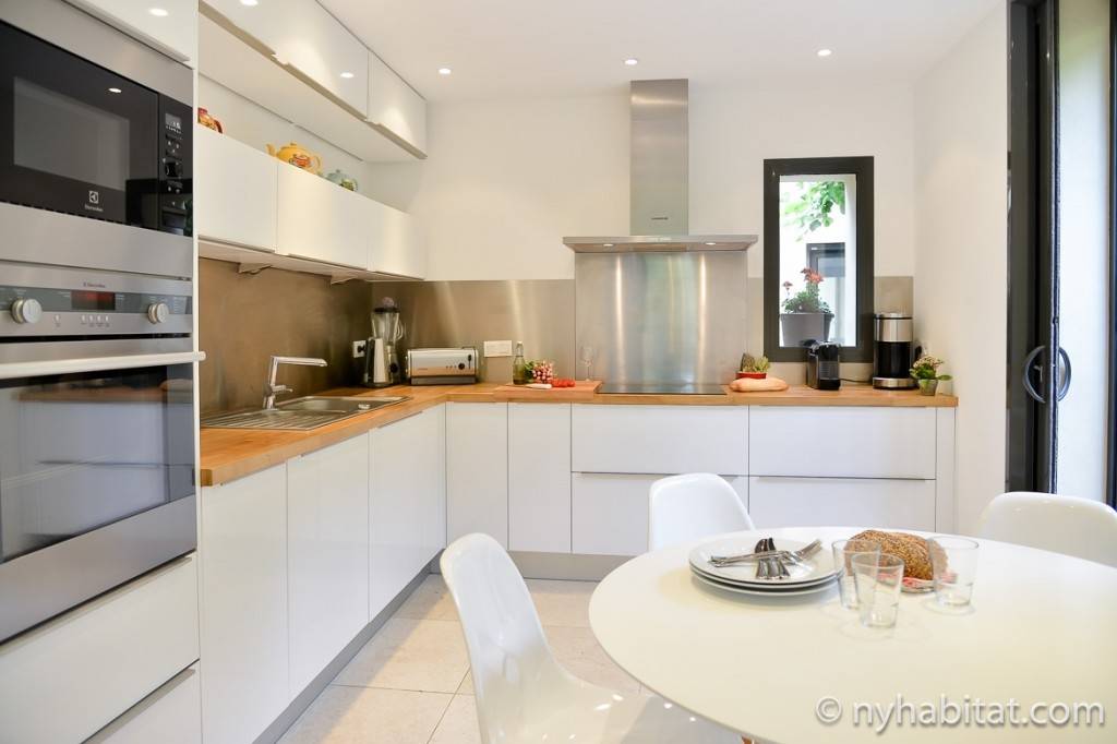 Far from the open hearths that were once used in preparing traditional Provençal cuisine, the cooking space in this rental is state-of-the-art! After entering through the doorway from the dining area, you’ll find a breakfast table with four chairs surrounded by an L-shaped counter space. The white of the cabinets contrasts with the warm natural-wood tones on the countertops, and it’s all complemented by the brushed aluminum and stainless steel appliances.