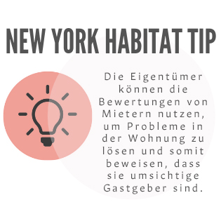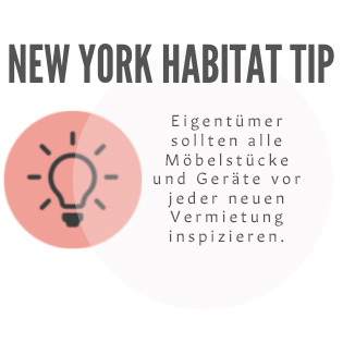 Bei Ihrem Auszug werden Sie von New York Habitat hinsichtlich einer Beurteilung über Ihre Erfahrungen und Ihr Feedback kontaktiert. Manchmal kommt es vor, dass wir erst zu spät davon erfahren, dass ein Kunde Probleme mit defekten Geräten, Klempnerarbeiten oder defekten Lampen hatte. Lassen Sie nicht zu, dass Ihnen Gleiches passiert! Vergessen Sie nicht, dass Ihr Makler da ist, um zu helfen, und Eigentümer glücklich über derlei Informationen sind – es ist schließlich deren Eigentum und sie wollen dieses pflegen! Den Eigentümer Ihrer Wohnungsvermietung zu informieren, ist die einzige Möglichkeit, um eine Problemlösung zu gewährleisten. Zudem wird bei Wartungsarbeiten, außer der Gegenstand wird aufgrund von absichtlicher Nachlässigkeit oder Missbrauch beschädigt, nur in seltenen Fällen Ihre Kaution belastet.