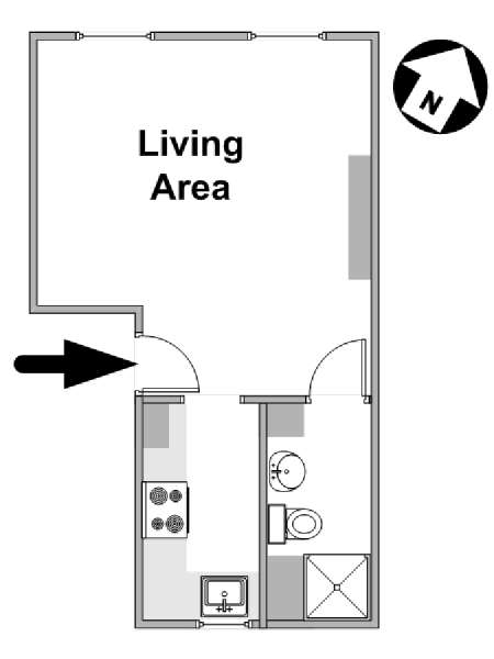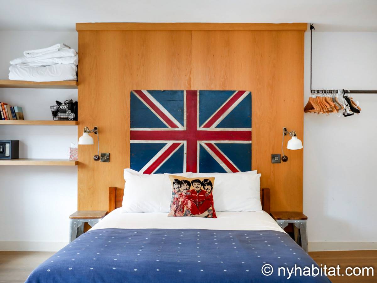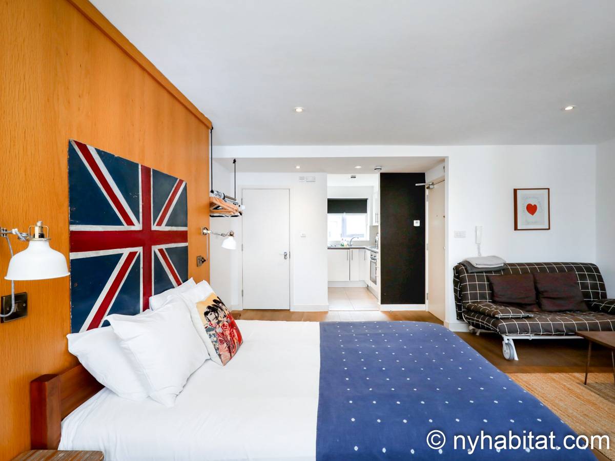 Zwei große doppelt verglaste Fenster erleuchten den offen-konzipierten Wohnbereich, der durchgängig mit Hartholzfußboden ausgelegt ist. Ein Doppelbett ist auf den wandmontierten Flachbildfernseher hin ausgerichtet, welcher internetfähig ist und damit Streaming ermöglicht, wenn Sie die passenden Accounts besitzen. Das Sofa kann auch als Bett benutzt werden und bietet somit weitere Schlafmöglichkeiten. Die separate und stilvolle Küche der Wohnung ist komplett eingerichtet und beinhaltet ein elektrisches Kochfeld, einen Backofen, einen Kühl-/Gefrierschrank, eine Mikrowelle, einen Toaster, einen Wasserkocher und eine Waschmaschine. Das Badezimmer ist modern und komplett gefliest und besitzt eine begehbare Dusche, WC und Waschbecken.
