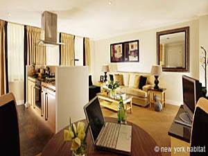 Diese 2-Zimmer-Wohnung ist vollständig möbliert, besitzt eine offene Küche zum Wohnzimmer hin, die eine Spülmaschine, Herd/Ofen, Toaster, Kaffeemaschine und Mikrowelle enthält. Kochgeschirr und sonstige Utensilien, um Ihre eigenen Gerichte zu kochen, werden zur Verfügung gestellt. In der gemütlichen Mischung aus Lounge und Wohnzimmer können Sie sich mit Geschäftspartnern treffen oder an Ihrem Laptop der Arbeit nachgehen. (Breitband WLAN ist gegen eine zusätzliche Gebühr verfügbar) Zudem besitzt Ihre Londoner Wohnung zwei Fernseher mit Satellitenprogrammen (einer im Wohnzimmer und einer in Ihrem Schlafzimmer). Falls Sie gerne Sport treiben, können Sie den Zugang zu einem der lokalen Fitnessstudios nutzen und gegen besonders ermäßigte Preise, den City Golf und den Health Club besuchen.