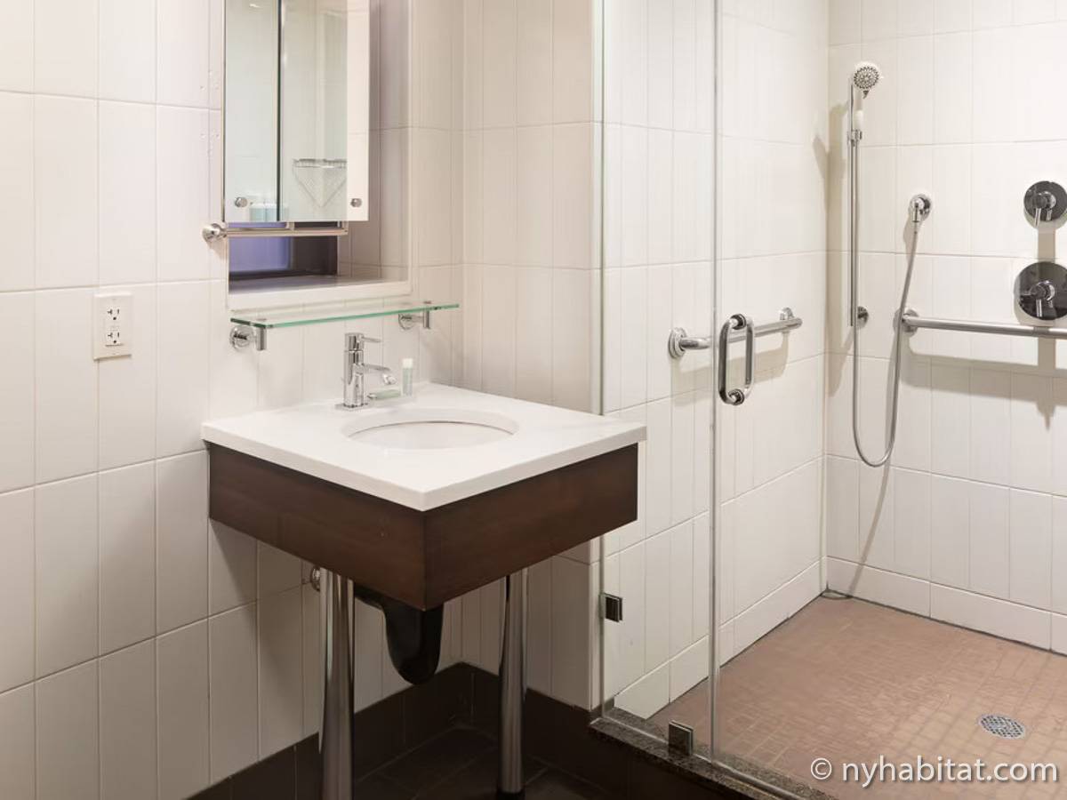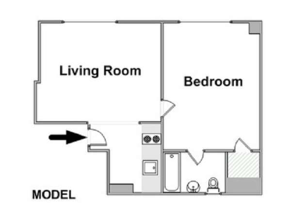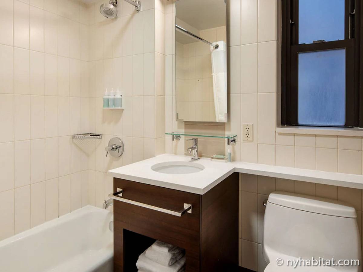 Die geschmackvoll dekorierte Ferienwohnung beabsichtigt, Ihren Aufenthalt in New York so komfortabel und angenehm wie möglich zu gestalten. Mit drei separaten Bereichen und einem Badezimmer kann die Unterkunft mit einer größeren Wohnfläche als die meisten Wohnungen in Manhattan glänzen – und gewährleistet somit angenehme Tage innerhalb des Hauses! Im Wohnzimmer liegt ein moderner Teppich, auf dem einladende Möbel verteilt stehen. Ebenfalls gibt es ein Bettsofa, einen Schreibtisch mit Stuhl und ein Schrank mit Schubladen, einen Flachbildfernseher mit Kabelanschluss, eine Klimaanlage und genügend Lampen, die für eine ausreichende Beleuchtung sorgen. Ein großes Fenster bietet Sicht auf die New Yorker Landschaft und ermöglicht den Einfall von Sonnenlicht, das die lindgrünen und weißen Wände zum Leuchten bringt. Die offene Küche ist an das Schlafzimmer angebunden und bietet die allgemeine Küchenausstattung, unter anderem eine Mikrowelle, Kaffeemaschine, Geschirrspülmaschine, Kühlschrank und einen Esstisch – dieser ermöglicht es Ihnen, Mahlzeiten in der Privatsphäre des eigenen Wohnbereichs zu essen. Zwei Queen-Betten mit frischen Laken nehmen den Großteil des Schlafzimmers ein und dienen Ihnen während Ihres Aufenthalts in New York als Schlafquartier. Gegenüber dieser Betten befindet sich ein zweiter Fernseher mit Kabelanschluss auf einer Kommode mit Schubladen für das Verstauen von persönlichen Gegenständen. Die Fenster im Schlaf- und Wohnzimmer ermöglichen optimale Belüftung. Ebenfalls stehen im Badezimmer der Unterkunft frische Handtücher und eine Dusche zu Verfügung.