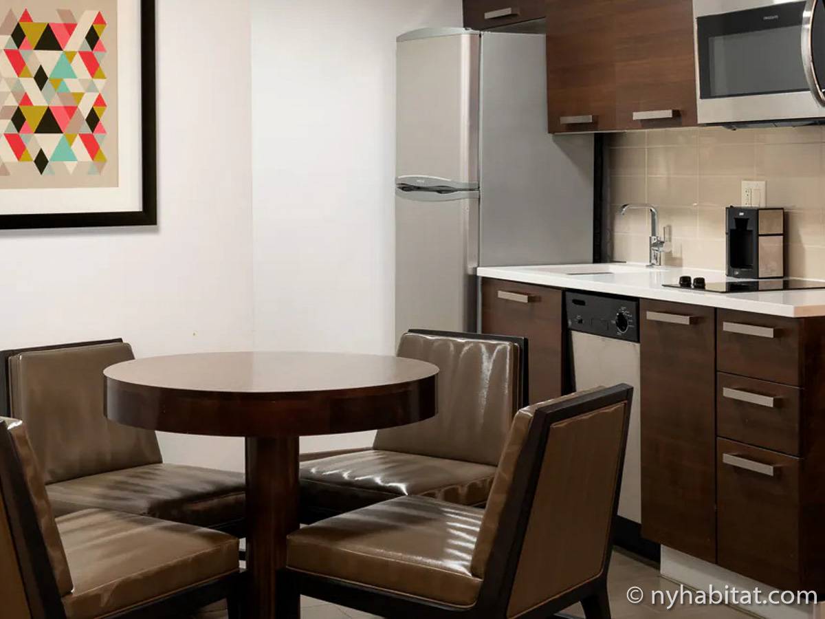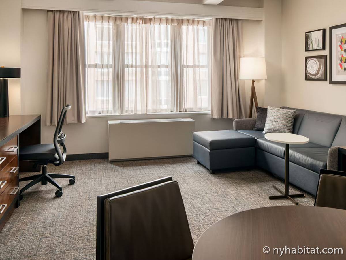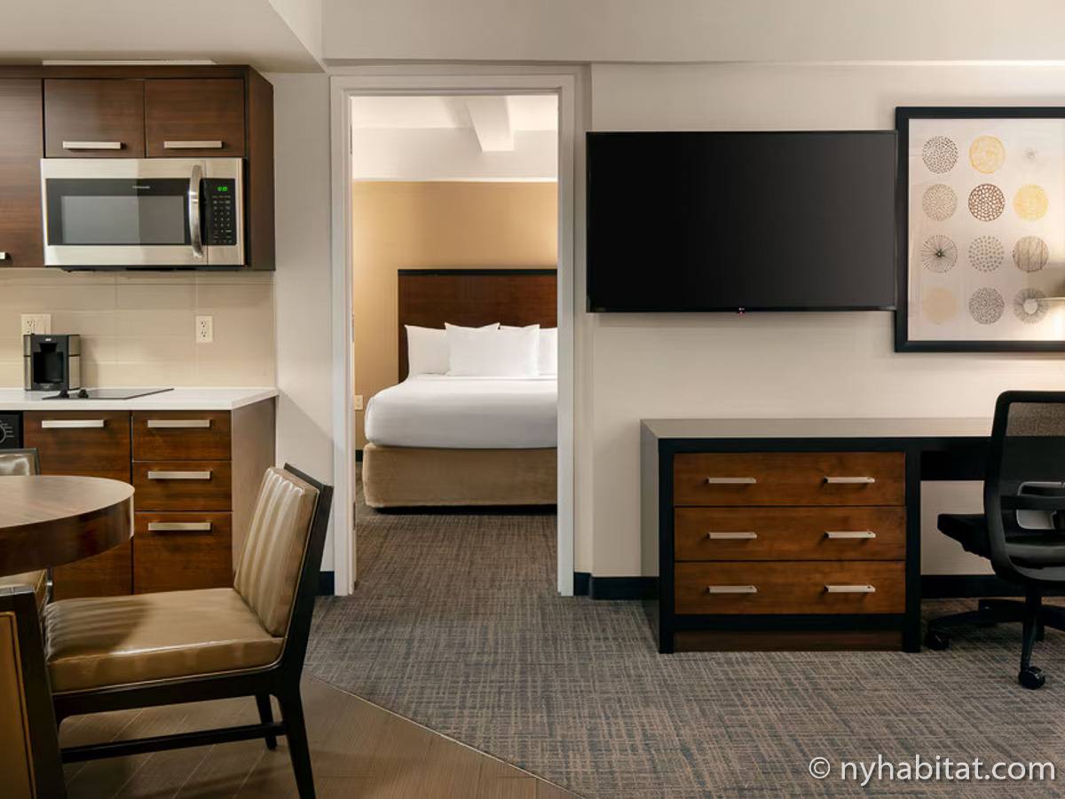 Diese vollmöblierte 2-Zimmer-Wohnung befindet sich in Midtown East und ist ideal geeignet für Familien oder kleine Gruppen. Die Ferienwohnung liegt auf der 48th Street und Lexington Avenue und bietet ein Schlafzimmer mit zwei Queen-Betten, sowie ein separates Wohnzimmer und einen Küchenbereich. Dieses 17-stöckige Gebäude mittlerer Höhe mit Fahrstuhl kann alle Annehmlichkeiten eines Hotels vorweisen, unter anderem ein Fitnessstudio, Internetcafé und einen ganztägigen Portier, der Sie begrüßt und Ihnen immer zur Hilfe bereitsteht. Während Ihres Aufenthalts in diesem kleinen Luxushotel können Sie das Frühstück im Essbereich und eine kostenlose Ausgabe der USA Today oder des Wall Street Journals in der Lobby genießen!