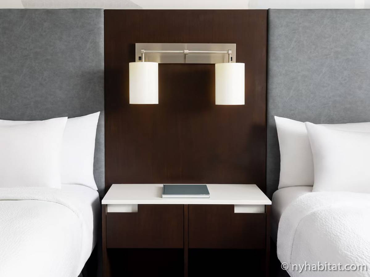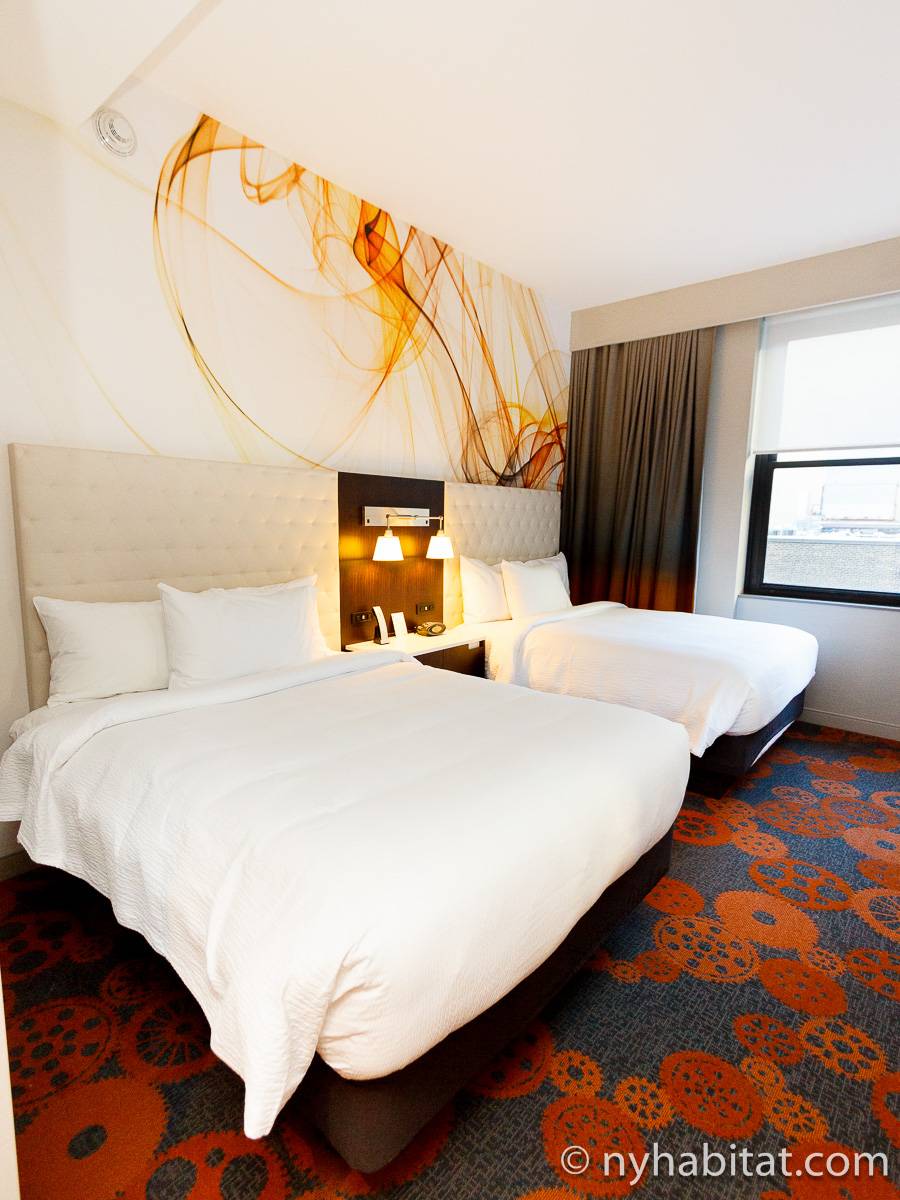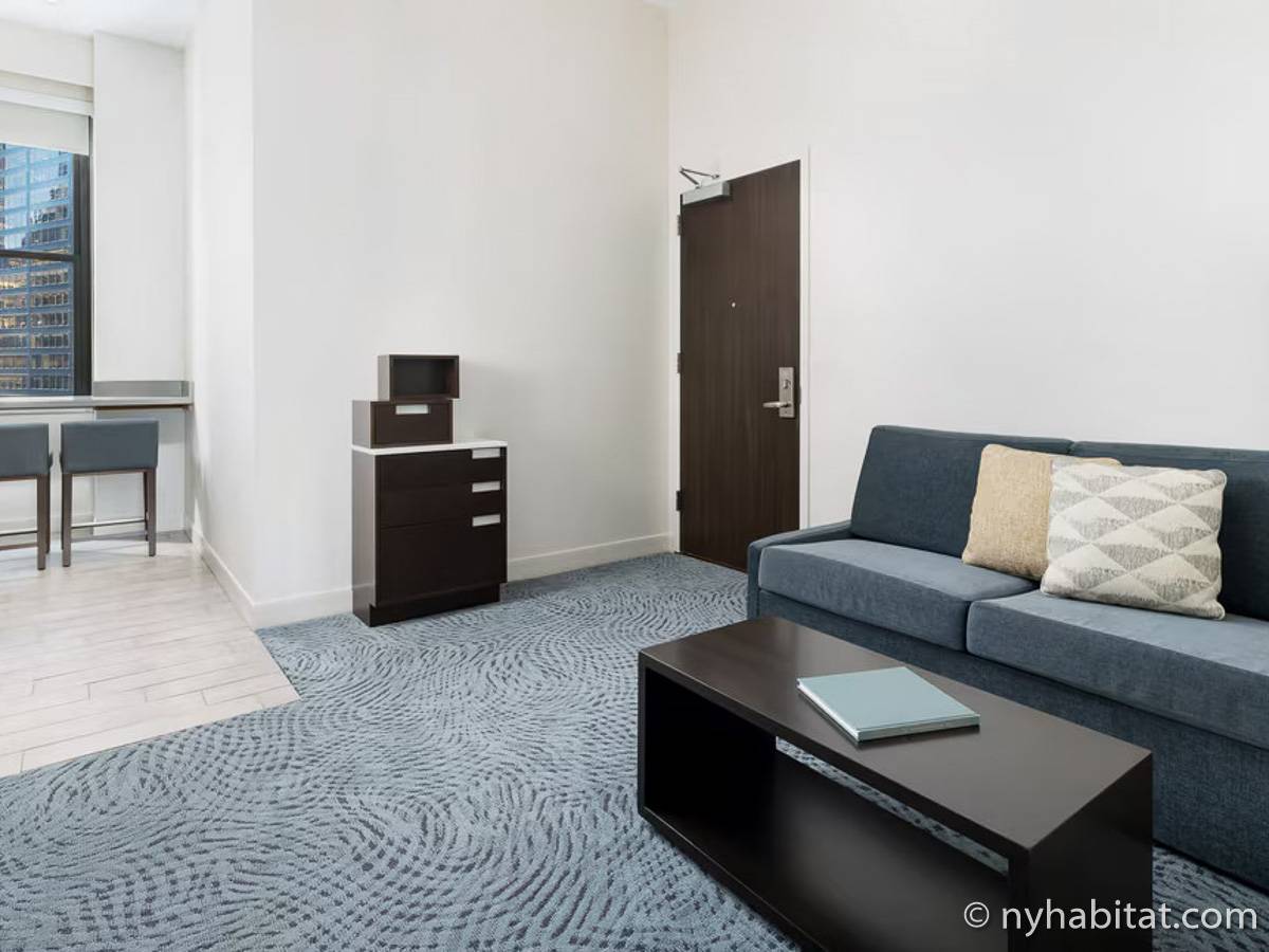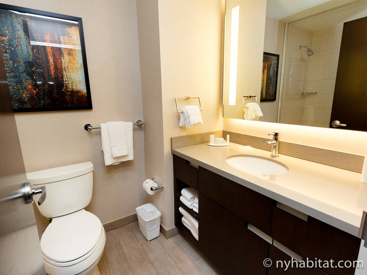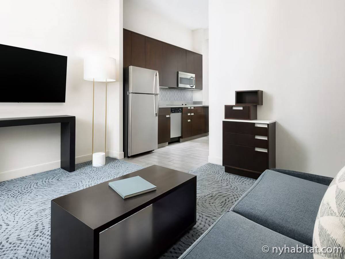Wenn Sie die Unterkunft betreten, werden Sie gleich von einem Flachbildfernseher, einem Schlafsofa und einem modernen Design empfangen. Vom Wohnzimmer der 2-Zimmer-Wohnung gelangen Sie in die offene Küche, die mit einem Kühlschrank, einer Gefriertruhe, einer Mikrowelle, einer Spülmaschine und einem Fenster mit Blick auf die berühmten Wolkenkratzer Manhattans ausgestattet ist.