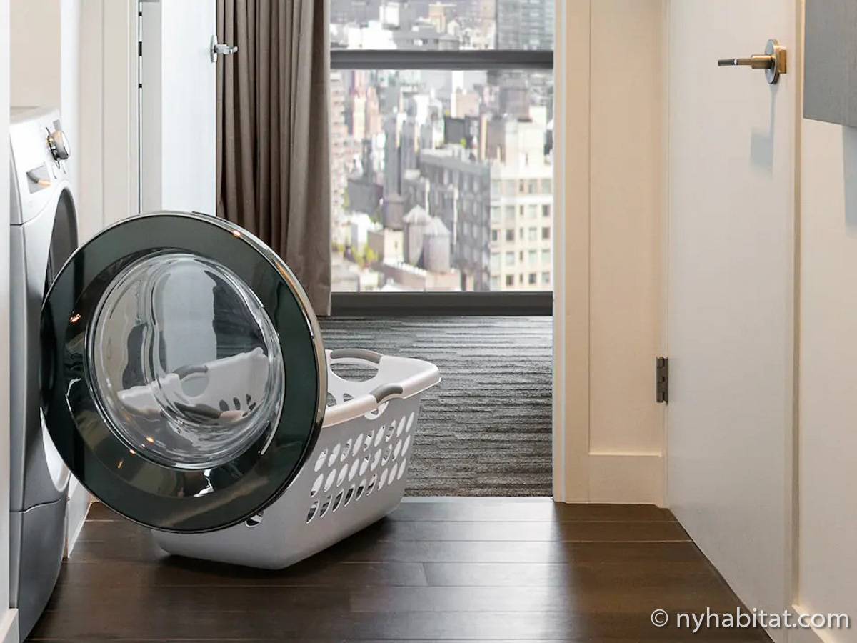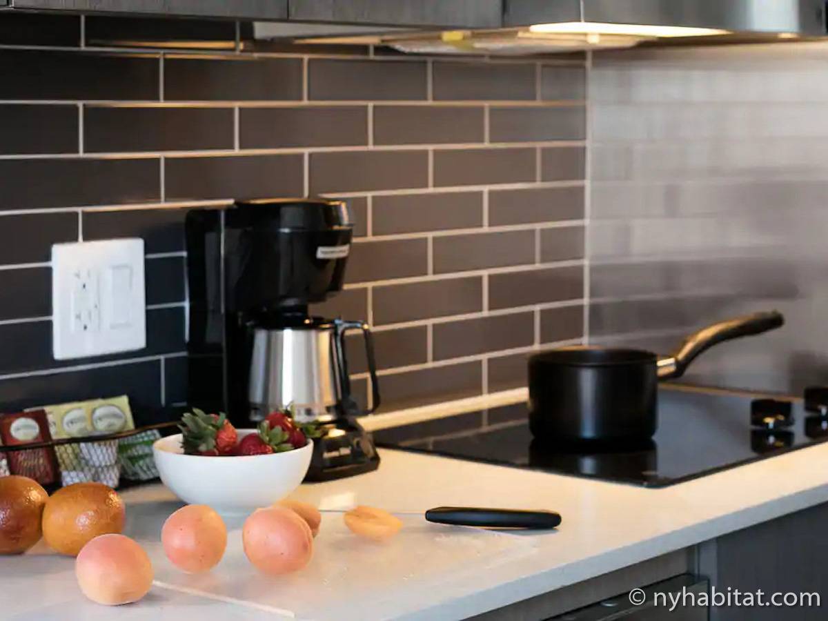 Diese 2-Zimmer-Wohnung verfügt über ein eigenes Schlafzimmer, ein Badezimmer, eine Küche und einen fantastischen Blick auf New York City. Das Schlafzimmer ist modern eingerichtet und umfasst ein Kingsize-Bett sowie deckenhohe Fenster, die sich an zwei Zimmerwänden befinden. Dank der Fenster fällt reichlich Tageslicht in den Raum und Sie haben eine Aussicht auf New York. Zur Küche gehören moderne Geräte, ein Elektroherd und die Küchenrückwand ist mit schwarzen Metrofliesen versehen. Das Badezimmer ist mit gefliesten Wänden, einer Dusche mit Glaswänden und einem abnehmbaren Duschkopf ausgestattet. In allen Räumen sind moderne Möbel zu finden. Darüber hinaus bietet das Gebäude selbst einen Aufzug, einen Wäscheservice vor Ort und ein Fitnessstudio.