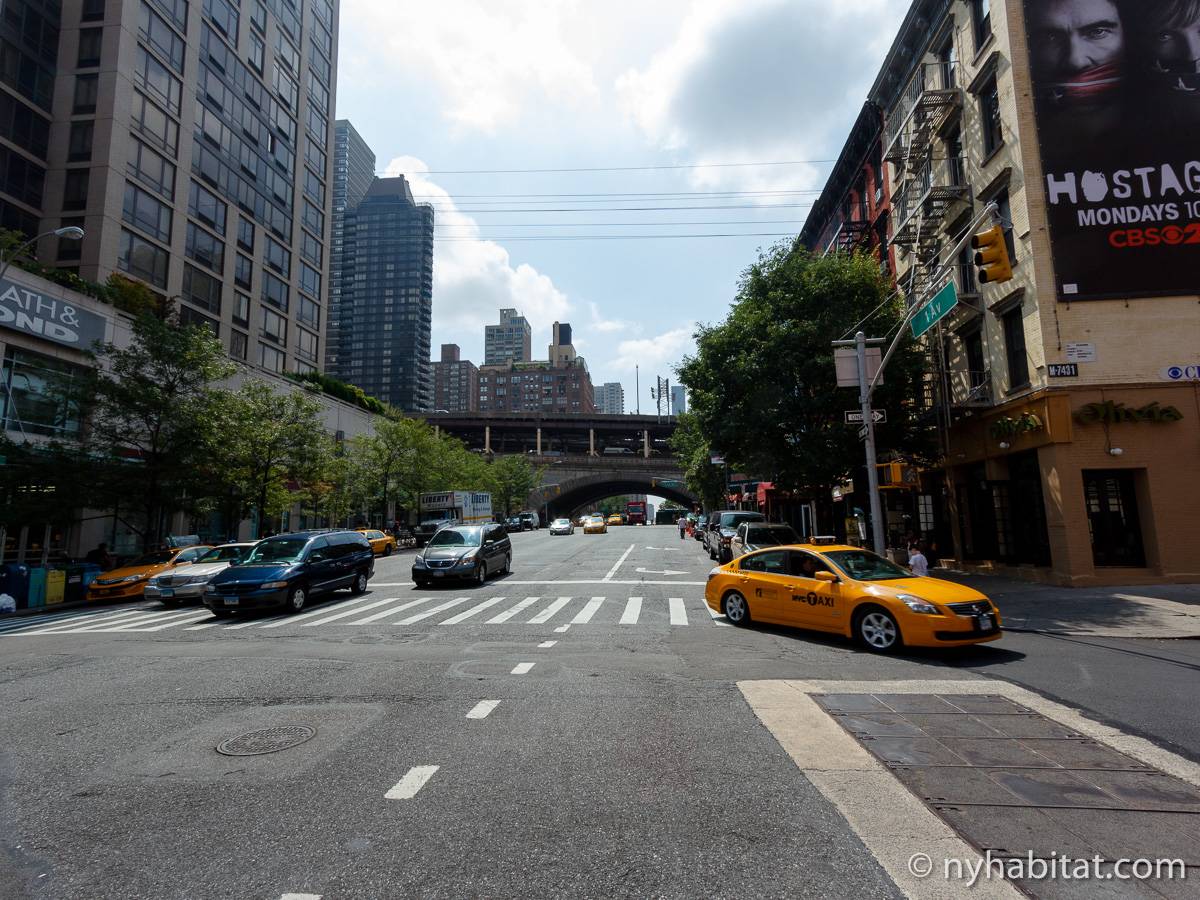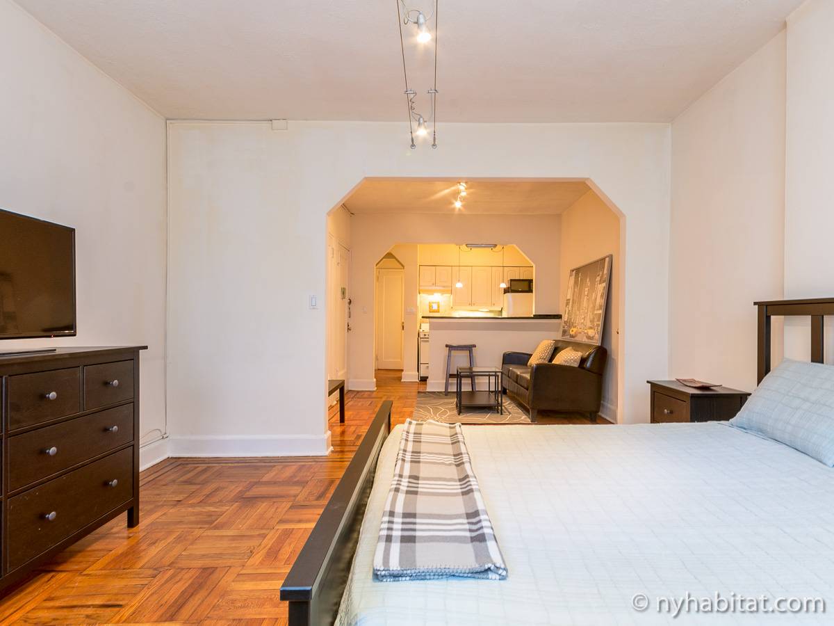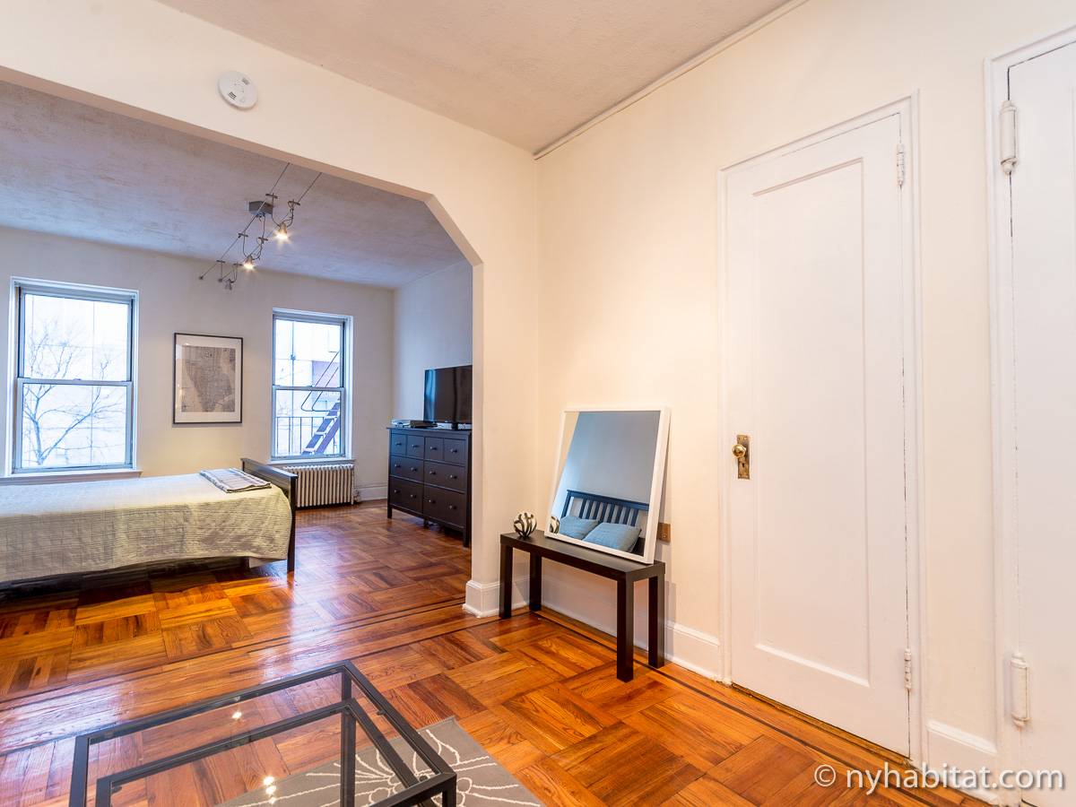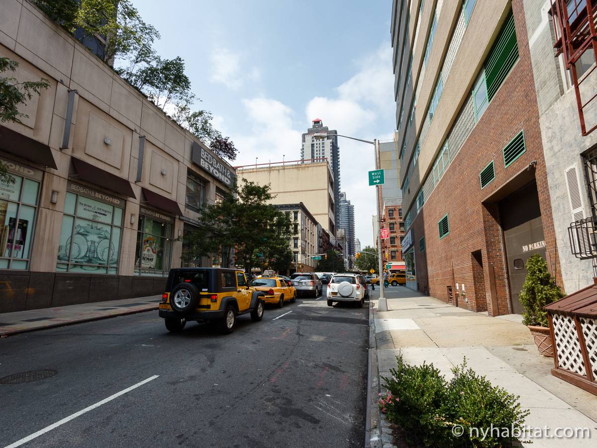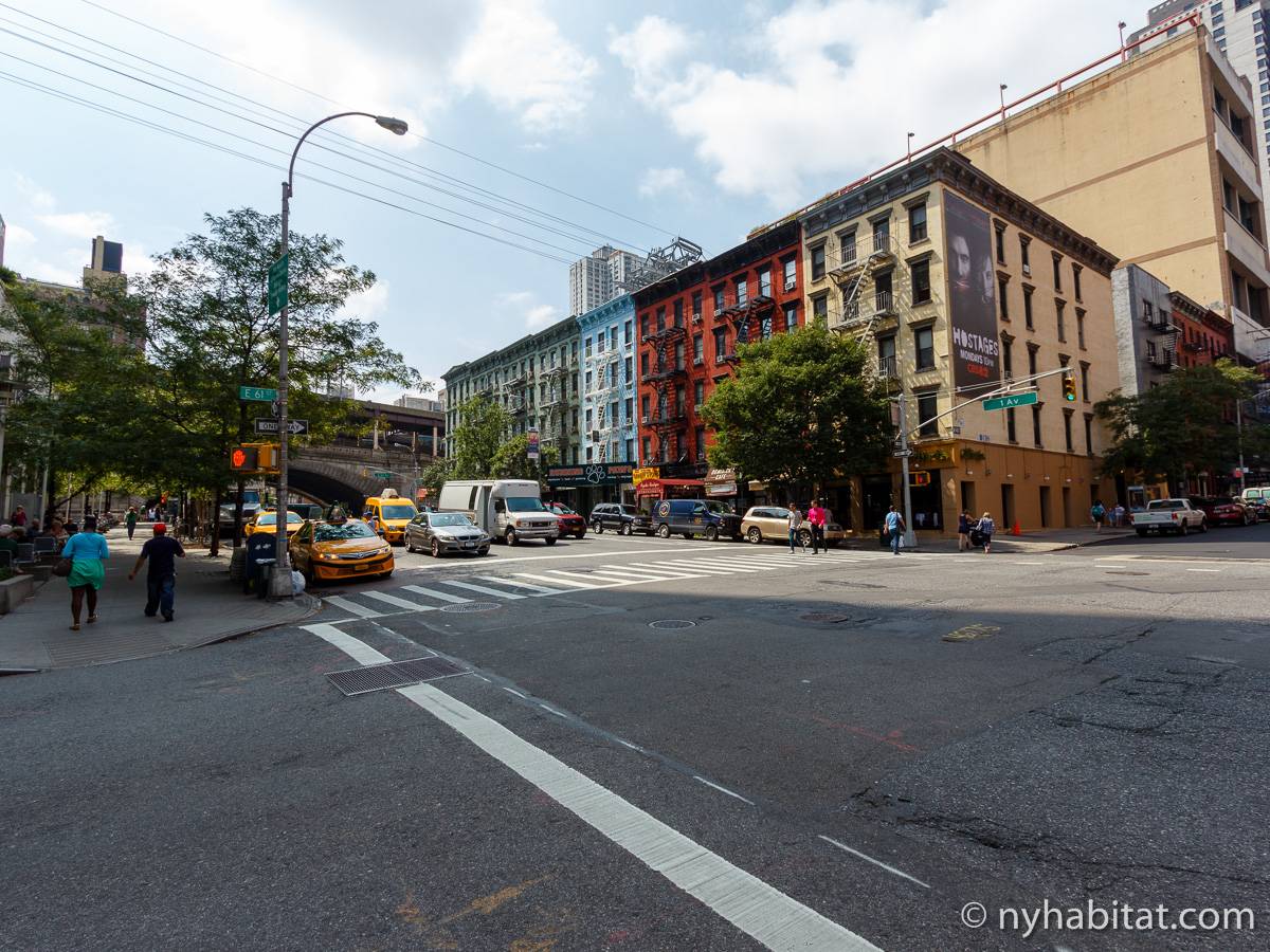 Diese Studiowohnung mit Alkoven befindet sich in der Upper East Side von Manhattan an der Kreuzung East 61st Street & First Avenue im 2. Stock (entspricht in Europa dem 1. Stock) eines 5-stöckigen Gebäudes aus dem Jahr 1920 ohne Aufzug. Die voll möblierte Wohnung verfügt über ein Sicherheitssystem und ist nach Süden hin zur Straße gerichtet.