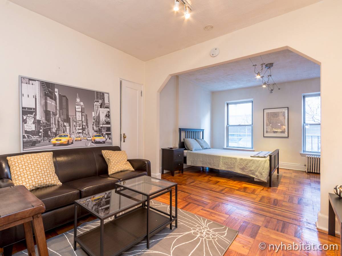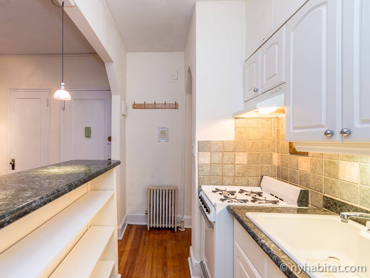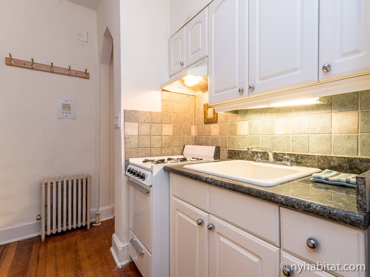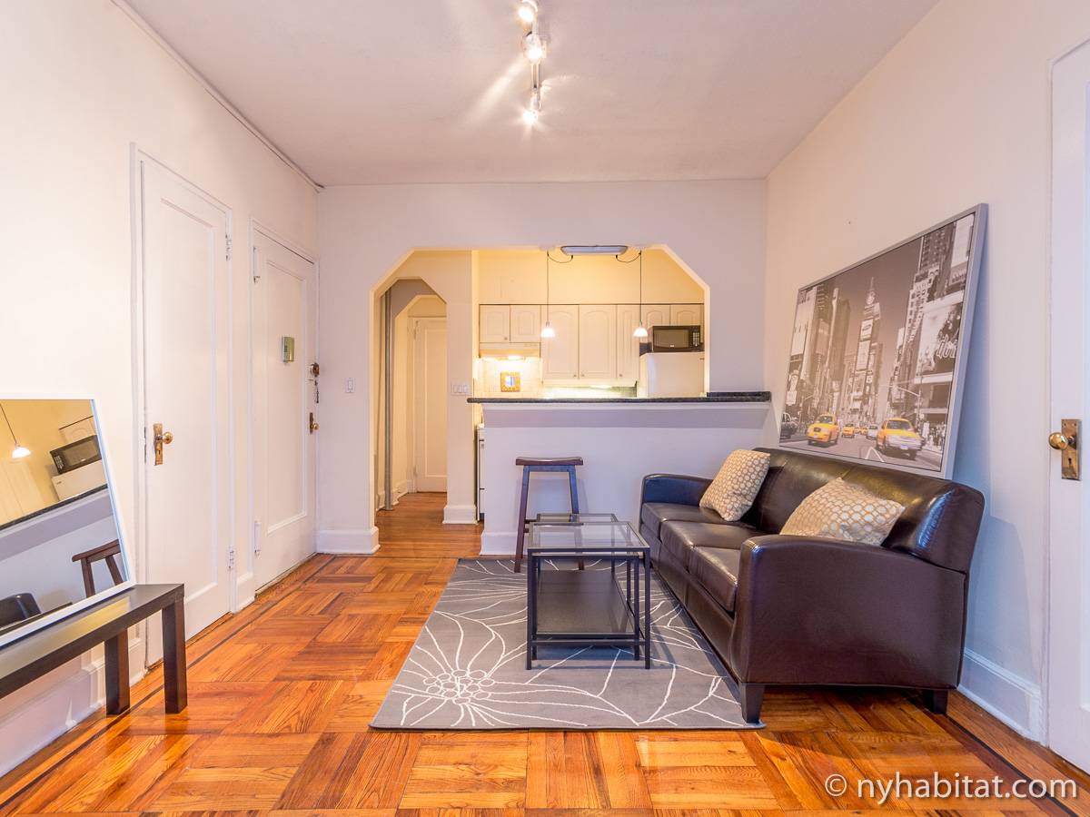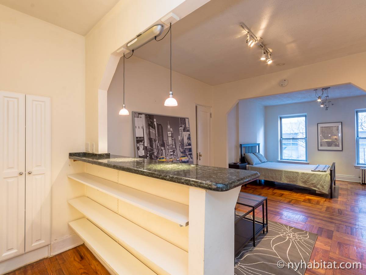 Diese Studiowohnung mit Alkoven befindet sich in der Upper East Side von Manhattan an der Kreuzung East 61st Street & First Avenue im 2. Stock (entspricht in Europa dem 1. Stock) eines 5-stöckigen Gebäudes aus dem Jahr 1920 ohne Aufzug. Die voll möblierte Wohnung verfügt über ein Sicherheitssystem und ist nach Süden hin zur Straße gerichtet.