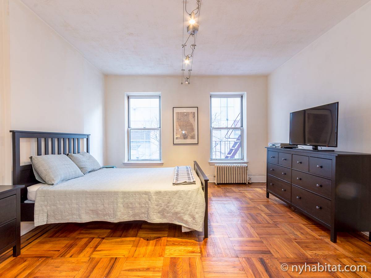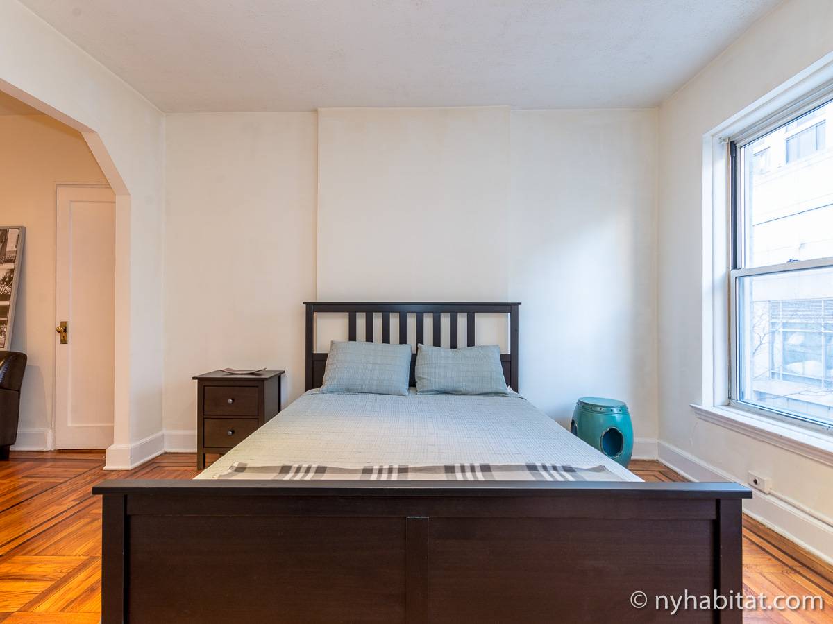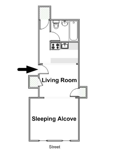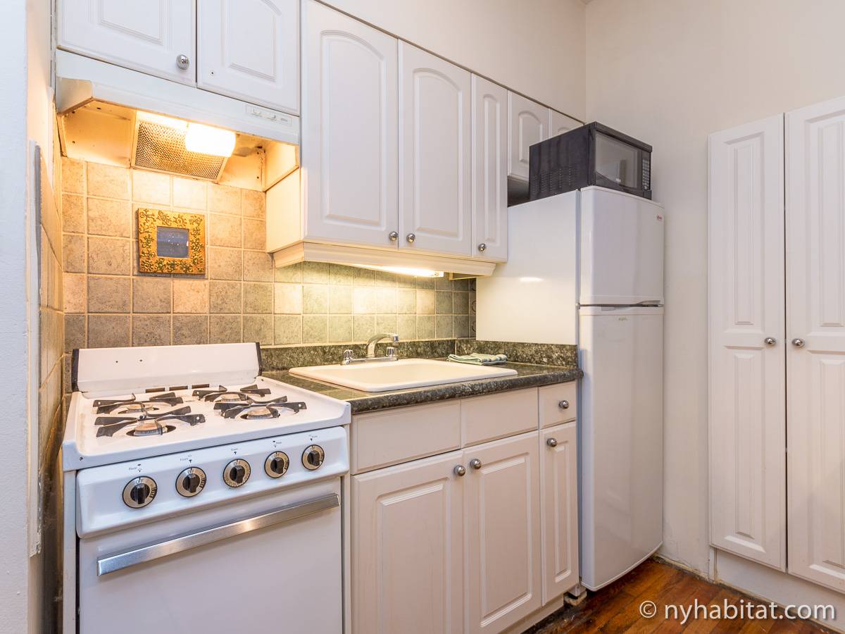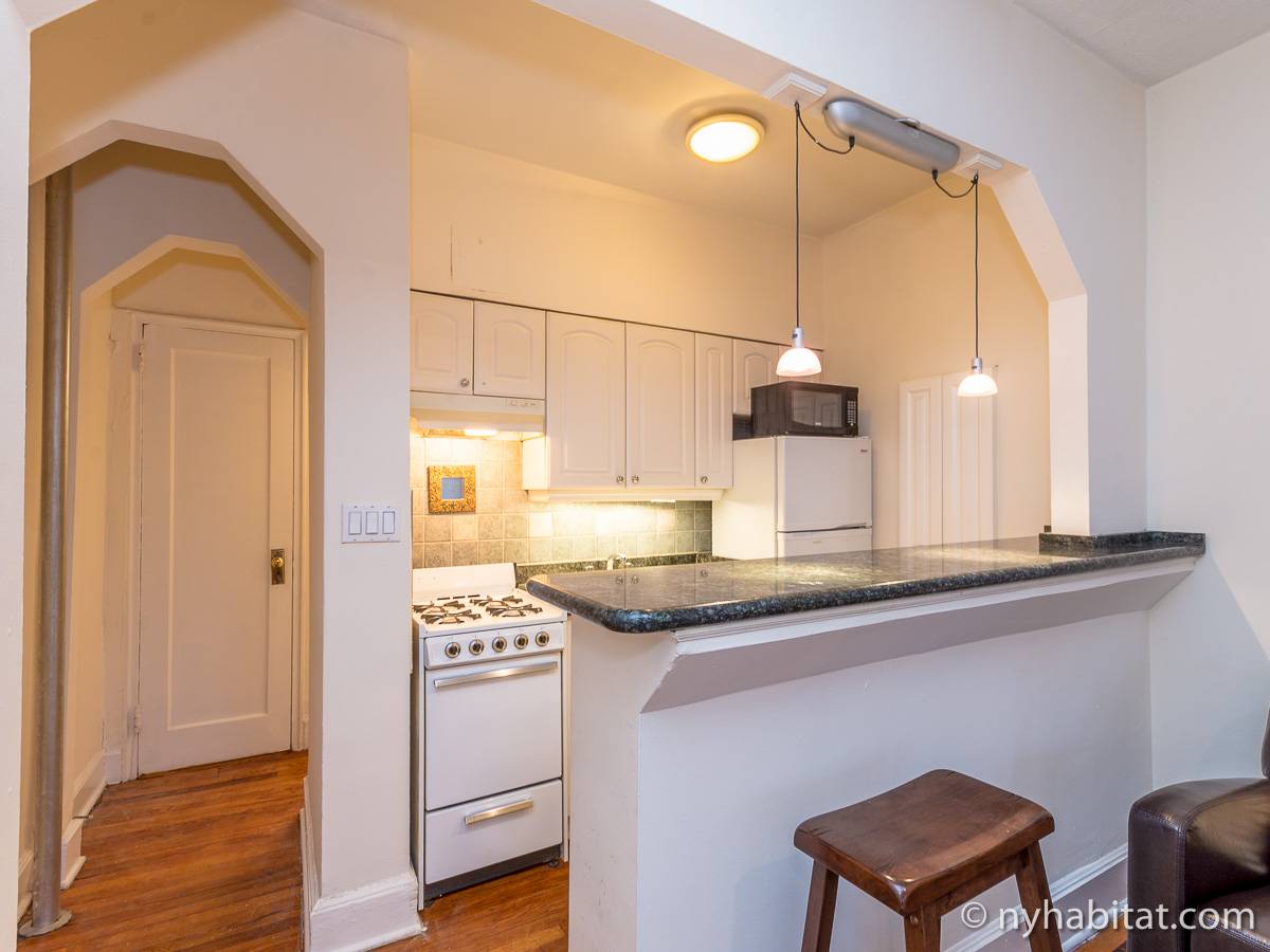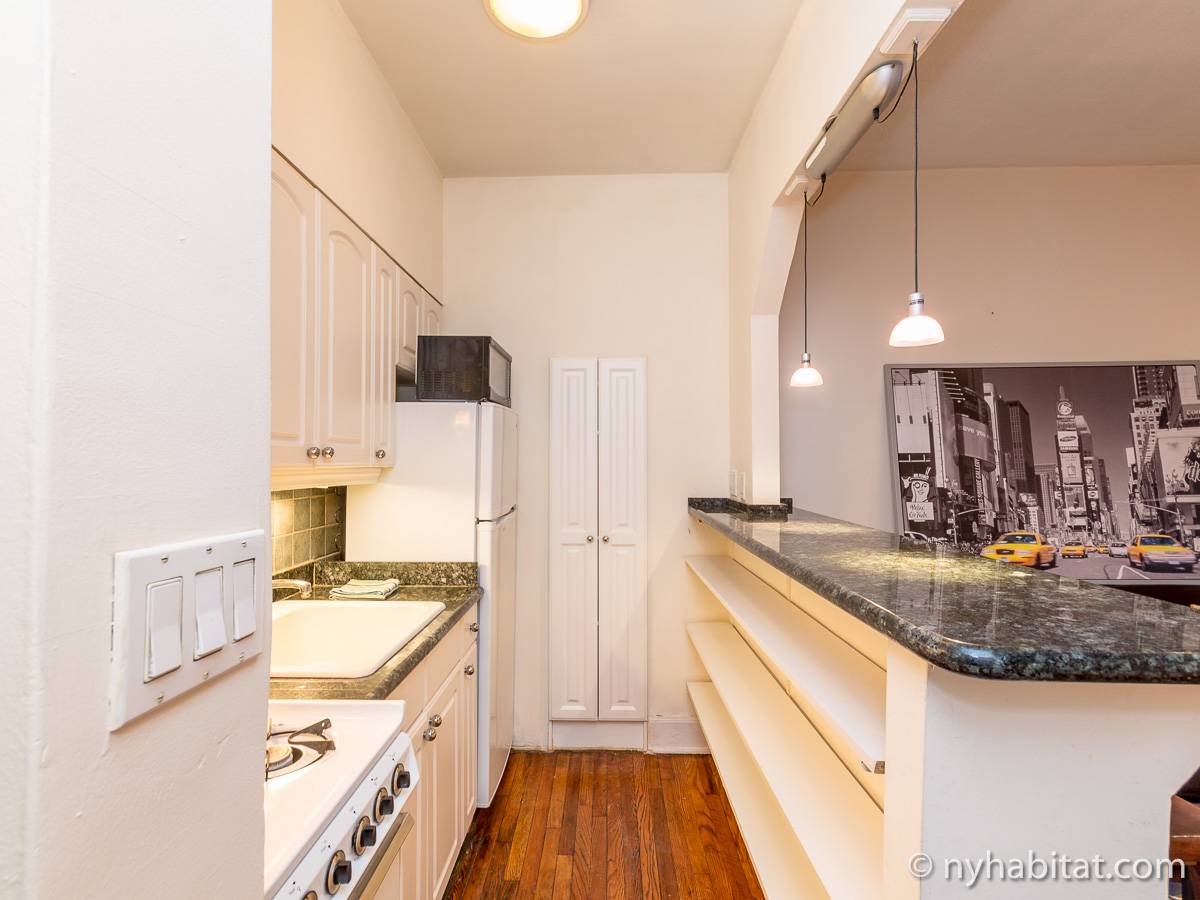 Diese Studiowohnung mit Alkoven befindet sich in der Upper East Side von Manhattan an der Kreuzung East 61st Street & First Avenue im 2. Stock (entspricht in Europa dem 1. Stock) eines 5-stöckigen Gebäudes aus dem Jahr 1920 ohne Aufzug. Die voll möblierte Wohnung verfügt über ein Sicherheitssystem und ist nach Süden hin zur Straße gerichtet.