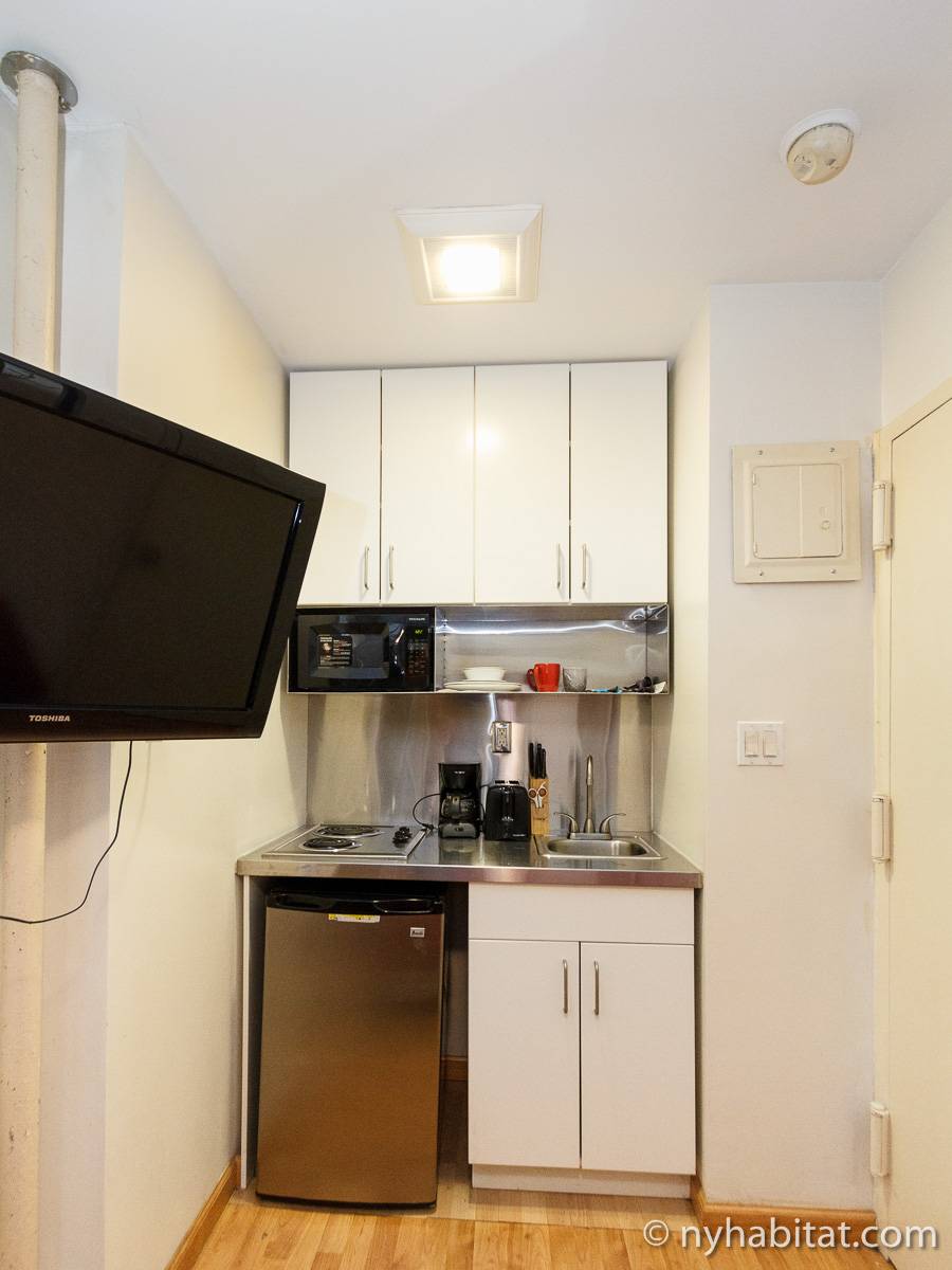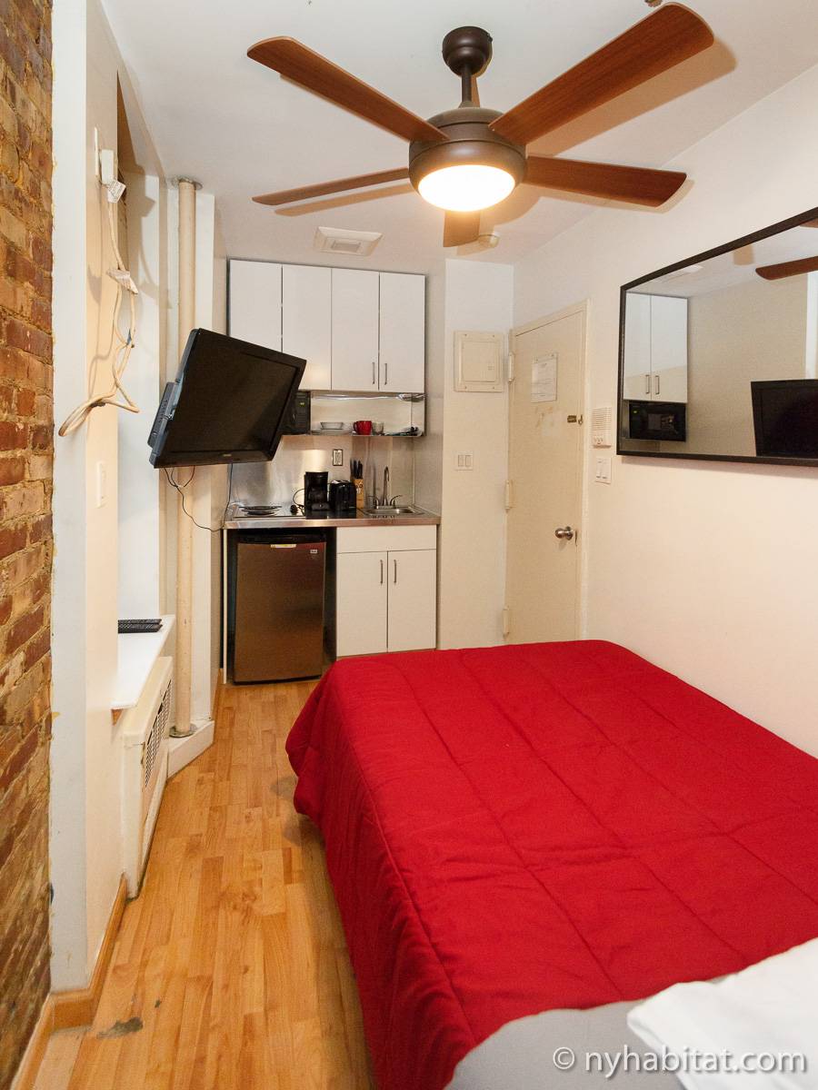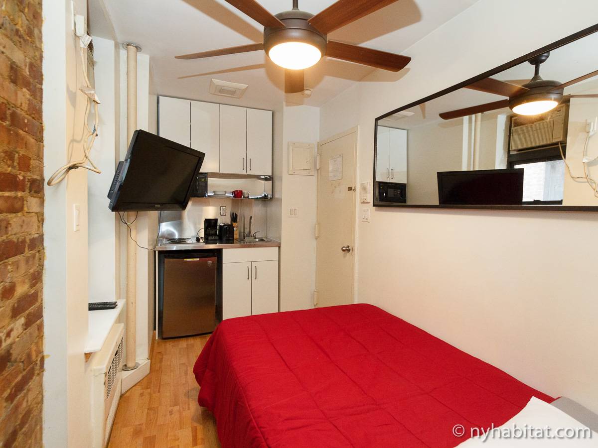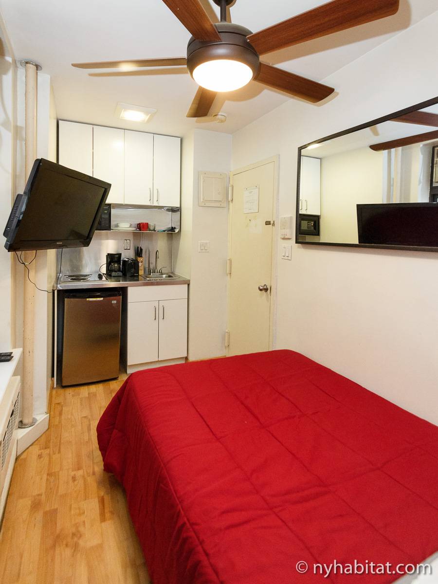 Die Wohnung ist eigentlich ein sehr kleines Schlafzimmer. Anders als auf dem Bild dargestellt, ist nur eine Seite des Betts zugänglich und es gibt weder einen Nachttisch noch einen Stuhl. Der Fernseher war ein altes Röhrenmodell mit sehr schlechtem Empfang. Der einzig benutzbare Teil der Küchenzeile war der Kühlschrank; es gibt kein Fenster im Schlafzimmer, daher wird man den Geruch nicht los, wenn man etwas in der Mikrowelle zubereitet. |