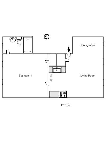 Die Räume dieser Wohnung wurden einfach und praktisch eingerichtet, um die klassischen Merkmale zu betonen und trotzdem besonderen Komfort zu bieten. Im Wohnzimmer befindet sich unter dem Licht eines Kronleuchters ein Schlafsofa und auf der anderen Seite eines bogenförmigen Durchgangs ein Esstisch. Drei Fenster sorgen dank ihrer Höhe für viel Tageslicht. Die Küche verbindet den Wohn- mit dem Schlafbereich und ist mit hellen Küchengeräten, einer Spülmaschine und Einbauschränken in Mahagoni-Optik ausgestattet. Im Schlafzimmer befinden sich ein Bett in der Größe Queensize und eine geräumige Kommode als Stauraum. Ein Schrank zum Aufhängen Ihrer Kleidung steht Ihnen ebenfalls zur Verfügung. Ein Deckenventilator sorgt für ausreichend Luftzirkulation und eine Klimaanlage ist ebenfalls verfügbar, um den Raum im Sommer zu kühlen (eine weitere befindet sich im Wohnzimmer). Das Badezimmer, zu guter Letzt, ist vom Schlafzimmer aus zugänglich und verfügt nicht nur über eine Whirlpool-Badewanne mit Dusche sondern auch über eine Waschmaschine und einen Trockner! Ein Fenster sorgt auch in diesem Raum für Tageslicht.