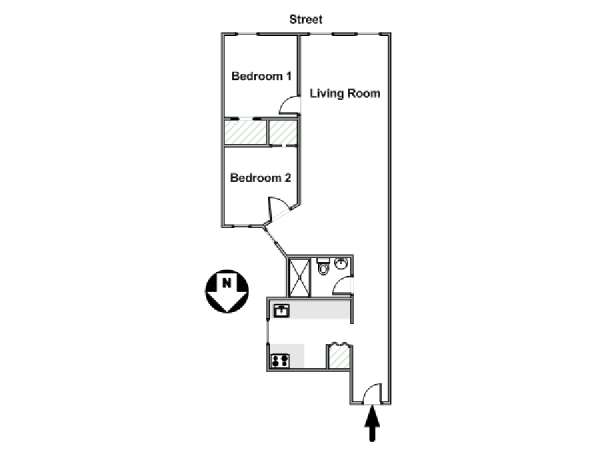 Das kleine Schlafzimmer (Schlafzimmer 1) ist nach Nordosten ausgerichtet und überblickt den Innenhof. Das Wohnzimmer und das große Schlafzimmer (Schlafzimmer 2) sind beide nach Südwesten ausgerichtet und blicken auf die Straße. Es gibt außerdem Fenster in der Küche, im Badezimmer und nahe dem Eingang zu Schlafzimmer 1, was für gute Luftzirkulation der gesamten Mietwohnung sorgt.