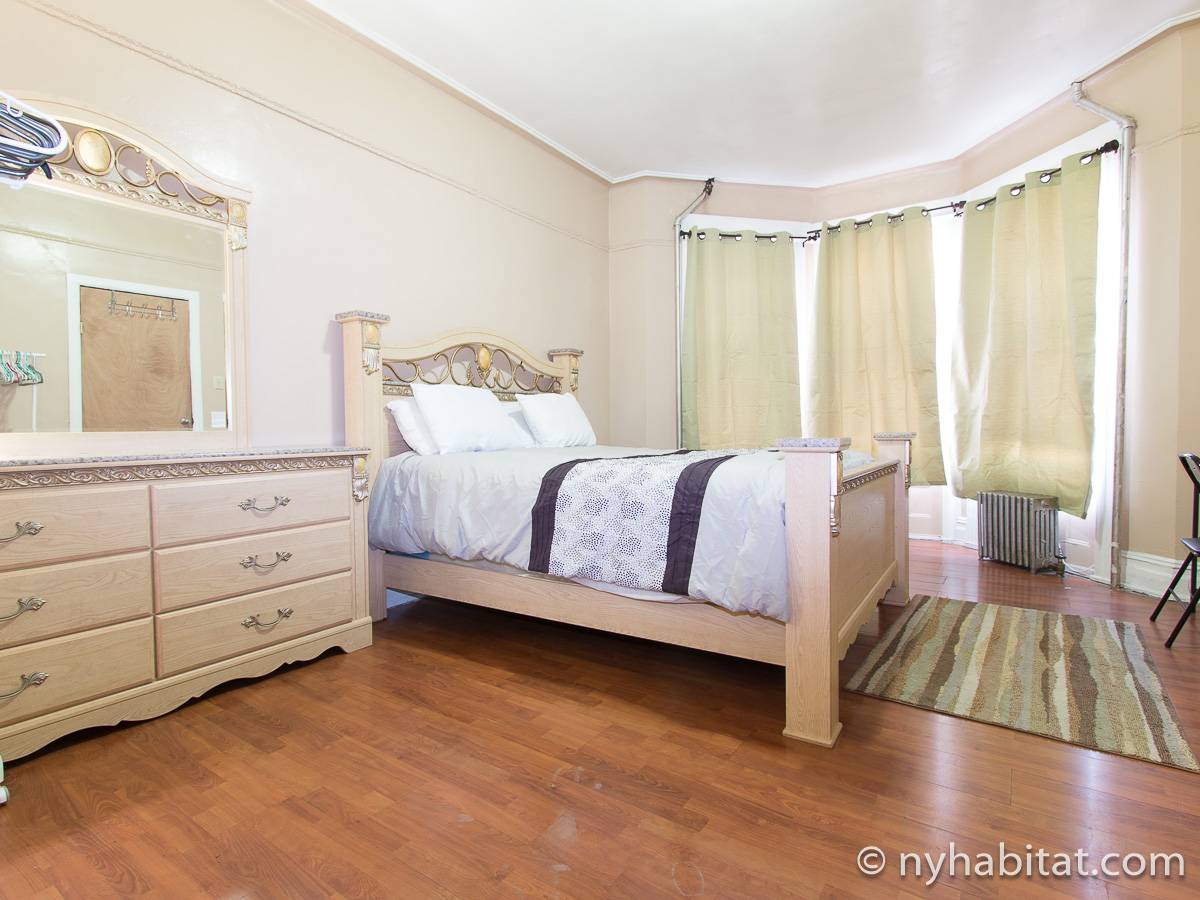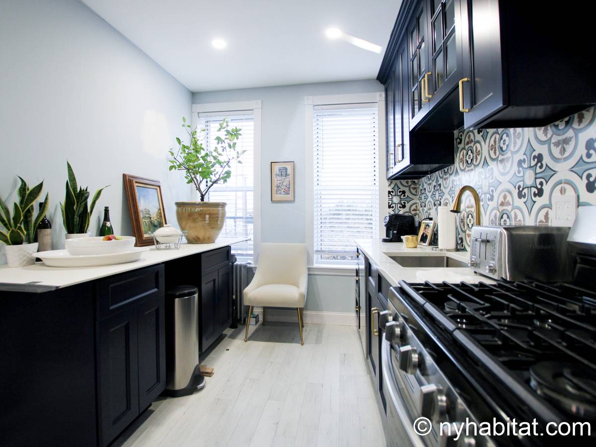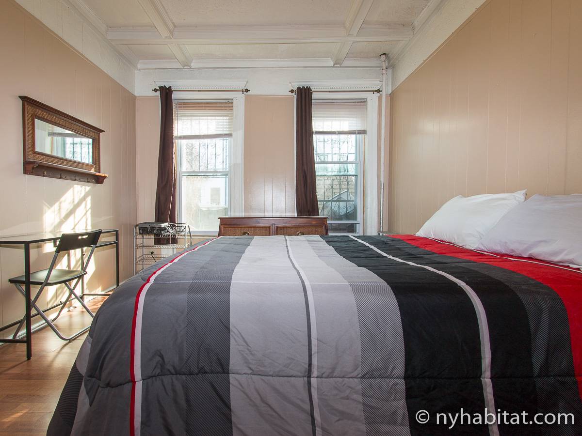 Das erste Wohnzimmer hat moderne Möbel mit zwei bequemen Sofas und einem passenden Teppich sowie einem Fernseher zur Unterhaltung, und das zweite wird mit einem Hochbett als Schlafnische genutzt. Die Schlafzimmer liegen praktisch an den gegenüberliegenden Enden der Wohnung: Das erste Schafzimmer hat ein Queen-Bett und drei hübsche Erkerfenster mit einem Blick auf eine für Brooklyn typische von Bäumen gesäumte Straße. Im zweiten Schlafzimmer gibt es ebenfalls ein Queen-Bett und zwei Fenster mit einem schönen Blick auf den Garten.