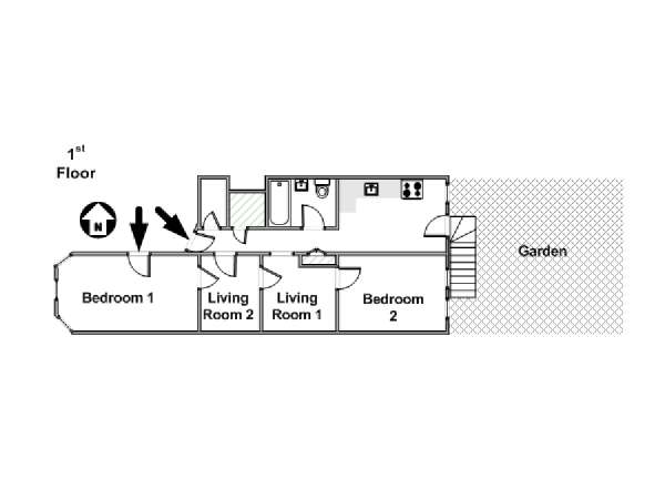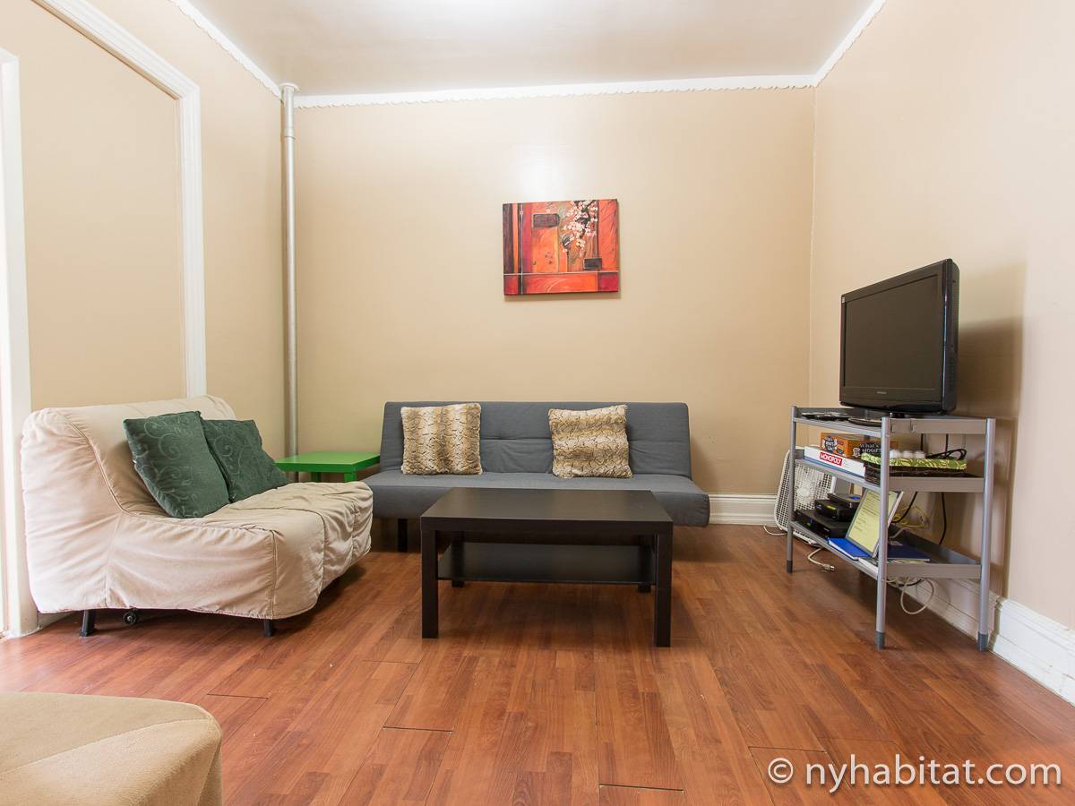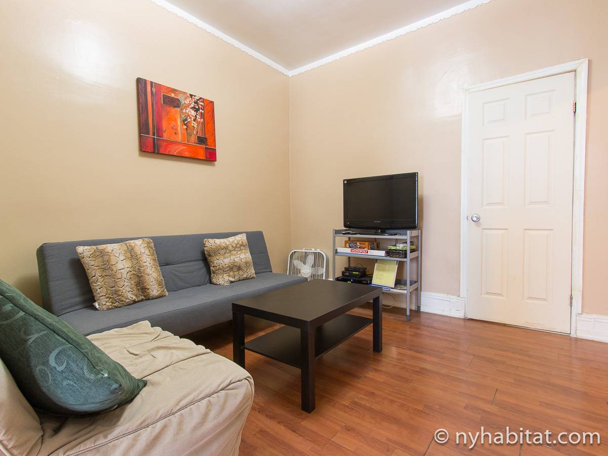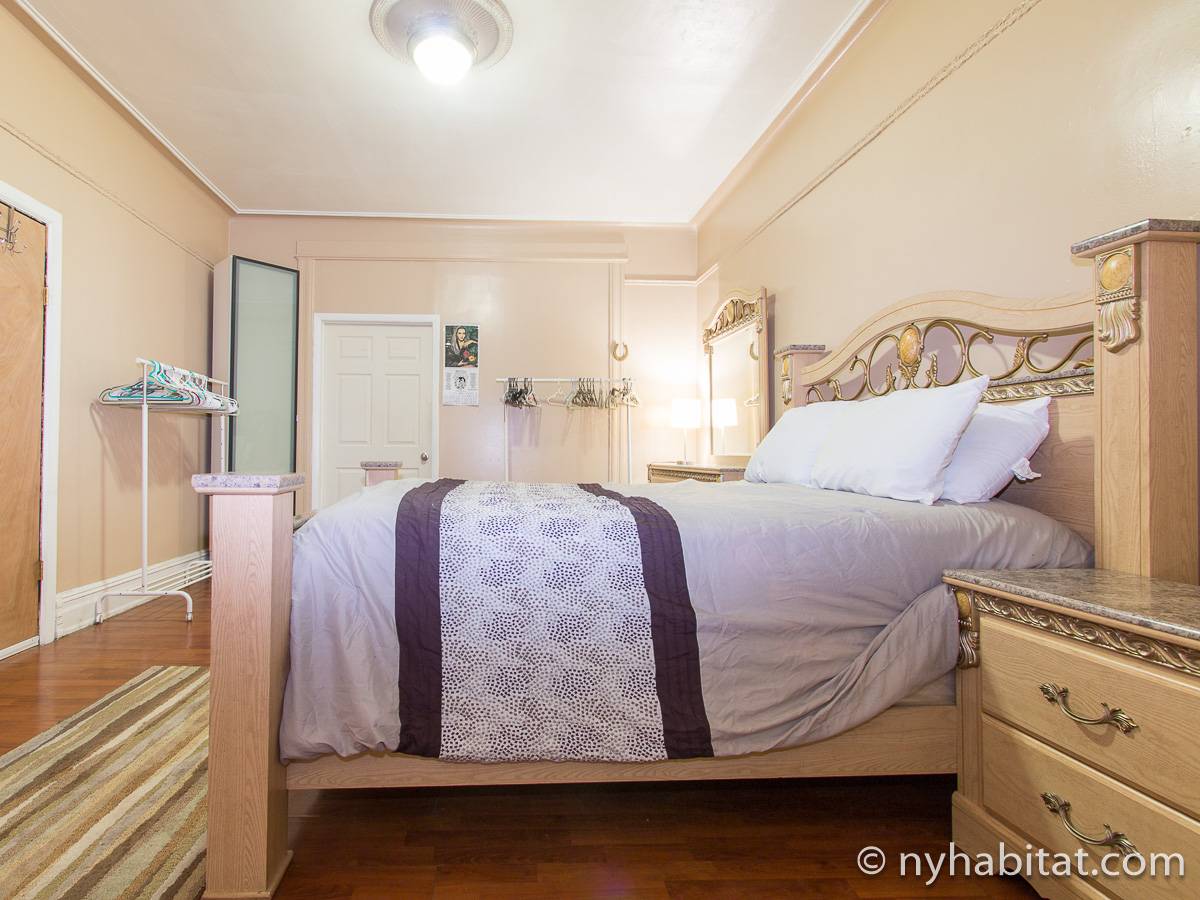 Das erste Wohnzimmer hat moderne Möbel mit zwei bequemen Sofas und einem passenden Teppich sowie einem Fernseher zur Unterhaltung, und das zweite wird mit einem Hochbett als Schlafnische genutzt. Die Schlafzimmer liegen praktisch an den gegenüberliegenden Enden der Wohnung: Das erste Schafzimmer hat ein Queen-Bett und drei hübsche Erkerfenster mit einem Blick auf eine für Brooklyn typische von Bäumen gesäumte Straße. Im zweiten Schlafzimmer gibt es ebenfalls ein Queen-Bett und zwei Fenster mit einem schönen Blick auf den Garten.