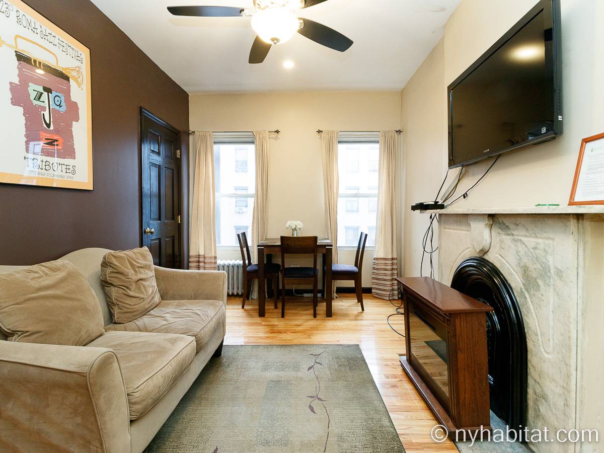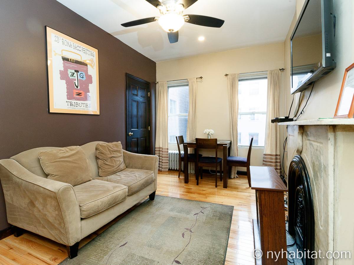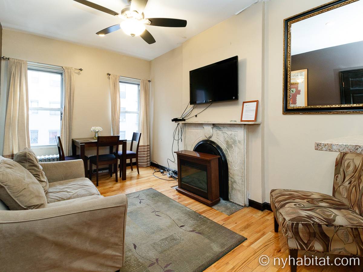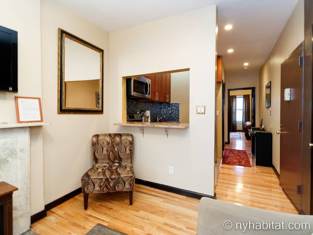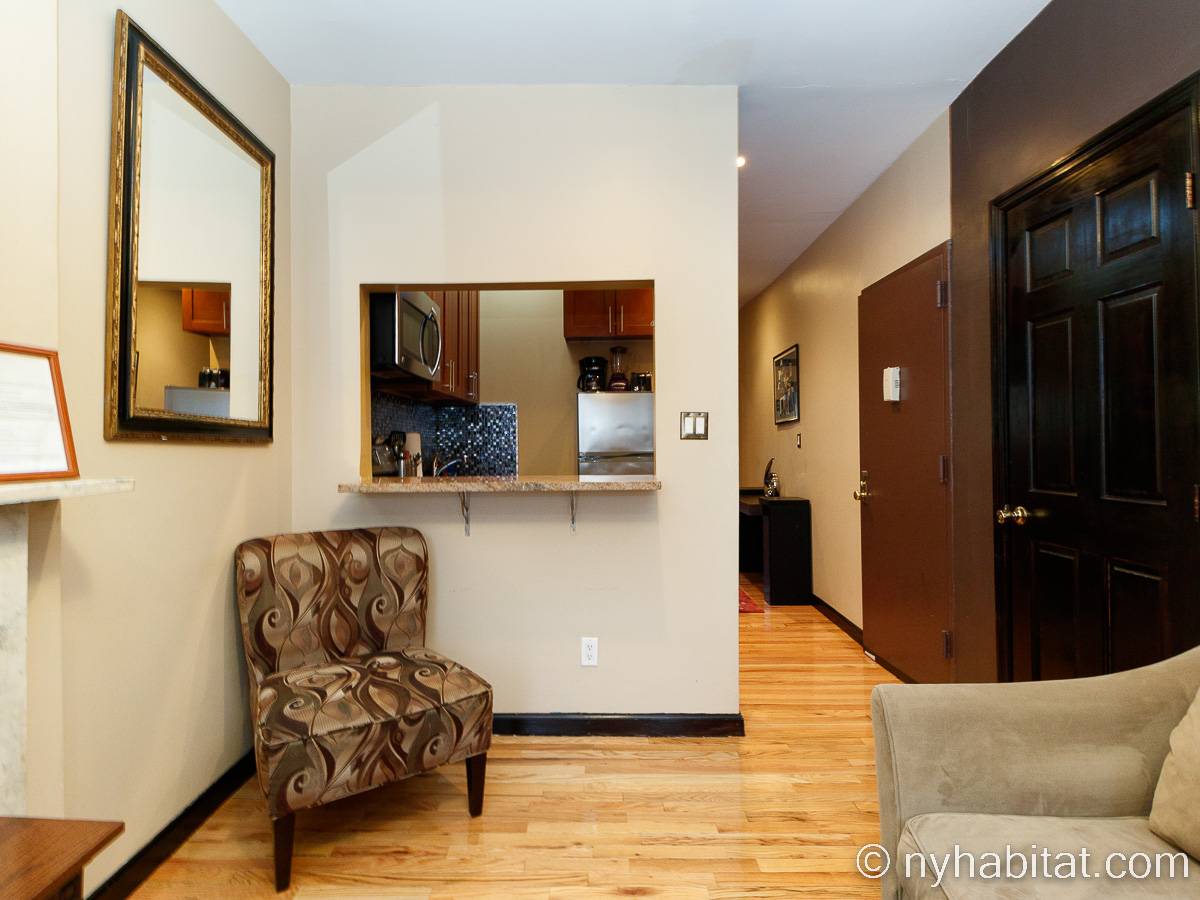 Diese renovierte Mietwohnung ist ideal geschnitten, um Privatsphäre auszuleben, und hat vollständig möblierte Zimmer. In der sorgfältig gestrichenen 2-Zimmer-Wohnung finden sich verteilt einzigartige Kunstwerke und vielseitige Teppiche auf den Hartholzböden. Im Wohnzimmer steht ein Zwei-Personen-Sofa gegenüber des Flachbildfernsehers mit Kabelanschluss, der über einem dekorativen Kamin angebracht ist. Zwei große Fenster mit langen, weißen Vorhängen blicken auf den Innenhof und sorgen für einen natürlichen Lichteinfall und genügend Belüftung. Der kompakte Alkoven (Wohnzimmer 2) ist mit dem Wohnzimmer verbunden. Hier stehen ein hell-rotes Ein-Personen-Schlafsofa, eine Kommode und ein Kleiderschrank zur Verfügung, ideal für einen Gast oder einen Mieter mit wenigen persönlichen Dingen. Die Küche und das private Badezimmer trennen die Wohnzimmer 1 und 2 von dem Hauptschlafzimmer. Die geflieste Küche ist mit Granit-Arbeitsplatten und Edelstahlgeräten ausgestattet und ist zum Wohnzimmer hin offen, sodass es möglich ist, während des Kochens Gespräche zu führen.