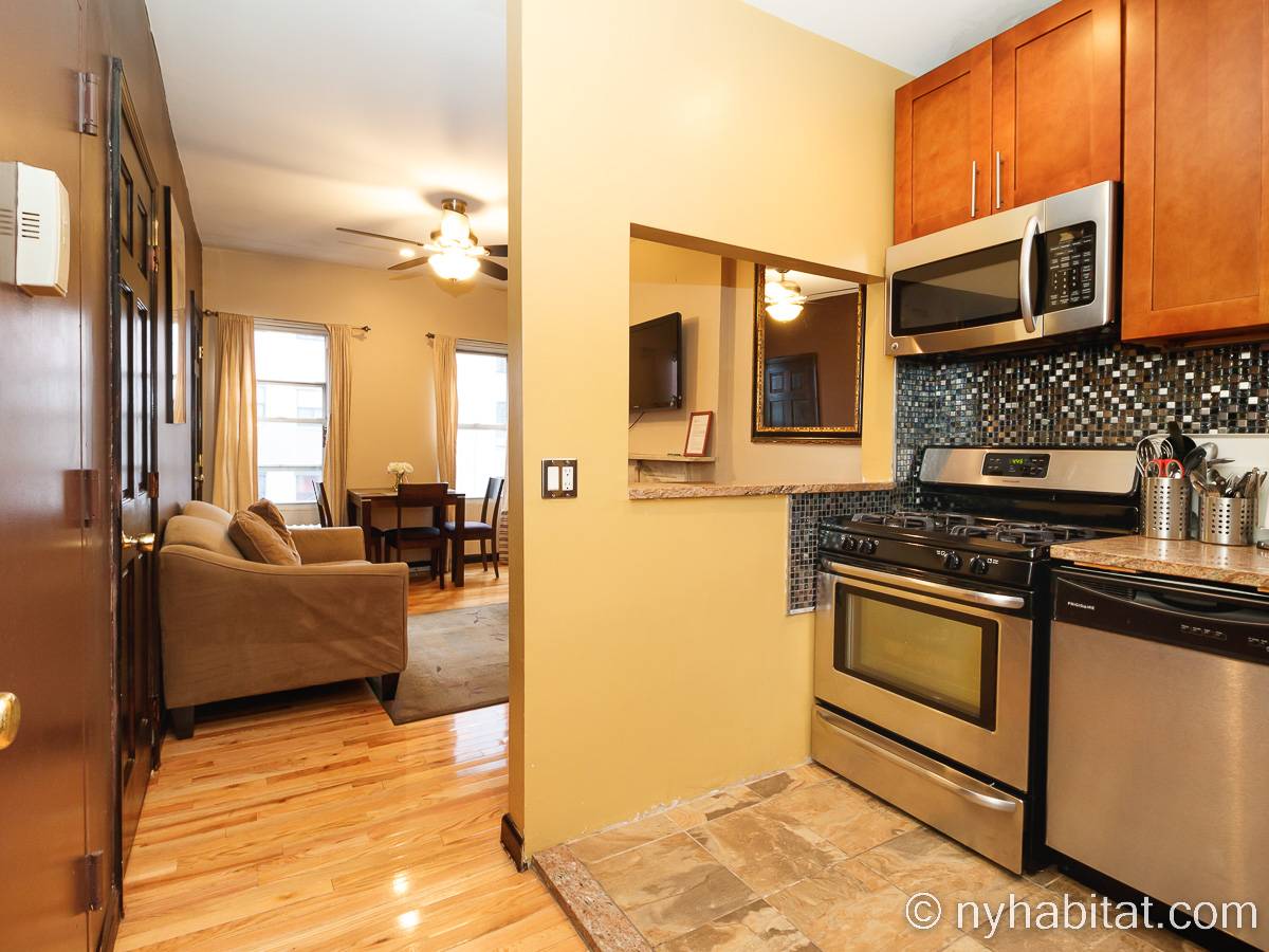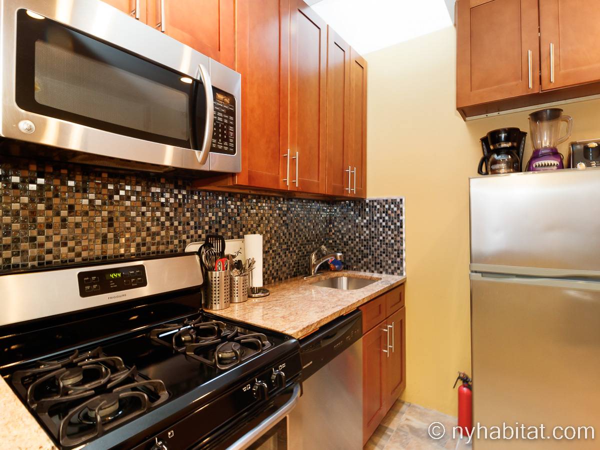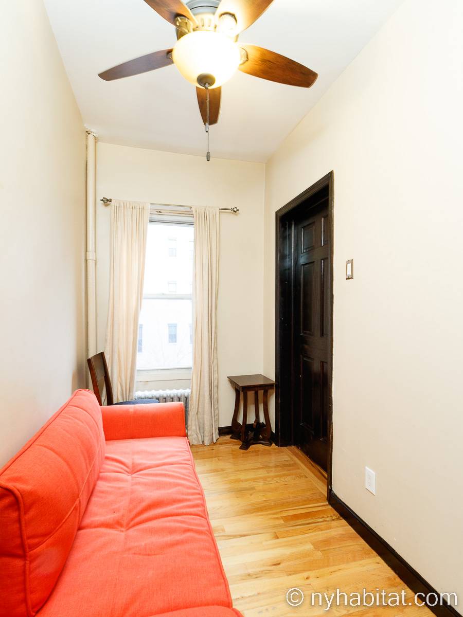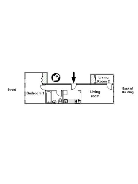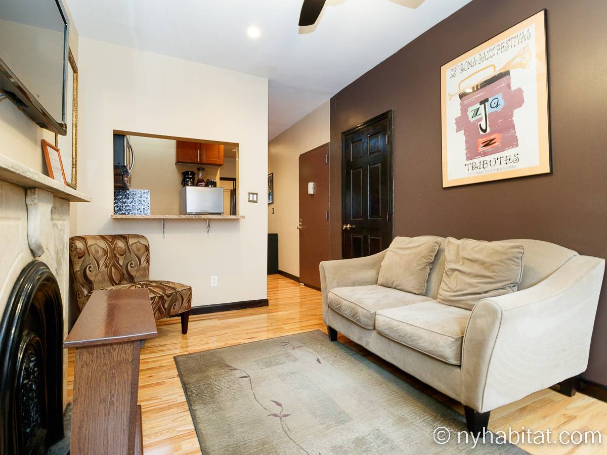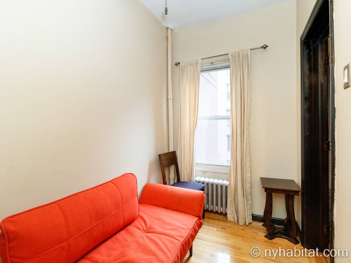 Diese renovierte Mietwohnung ist ideal geschnitten, um Privatsphäre auszuleben, und hat vollständig möblierte Zimmer. In der sorgfältig gestrichenen 2-Zimmer-Wohnung finden sich verteilt einzigartige Kunstwerke und vielseitige Teppiche auf den Hartholzböden. Im Wohnzimmer steht ein Zwei-Personen-Sofa gegenüber des Flachbildfernsehers mit Kabelanschluss, der über einem dekorativen Kamin angebracht ist. Zwei große Fenster mit langen, weißen Vorhängen blicken auf den Innenhof und sorgen für einen natürlichen Lichteinfall und genügend Belüftung. Der kompakte Alkoven (Wohnzimmer 2) ist mit dem Wohnzimmer verbunden. Hier stehen ein hell-rotes Ein-Personen-Schlafsofa, eine Kommode und ein Kleiderschrank zur Verfügung, ideal für einen Gast oder einen Mieter mit wenigen persönlichen Dingen. Die Küche und das private Badezimmer trennen die Wohnzimmer 1 und 2 von dem Hauptschlafzimmer. Die geflieste Küche ist mit Granit-Arbeitsplatten und Edelstahlgeräten ausgestattet und ist zum Wohnzimmer hin offen, sodass es möglich ist, während des Kochens Gespräche zu führen.