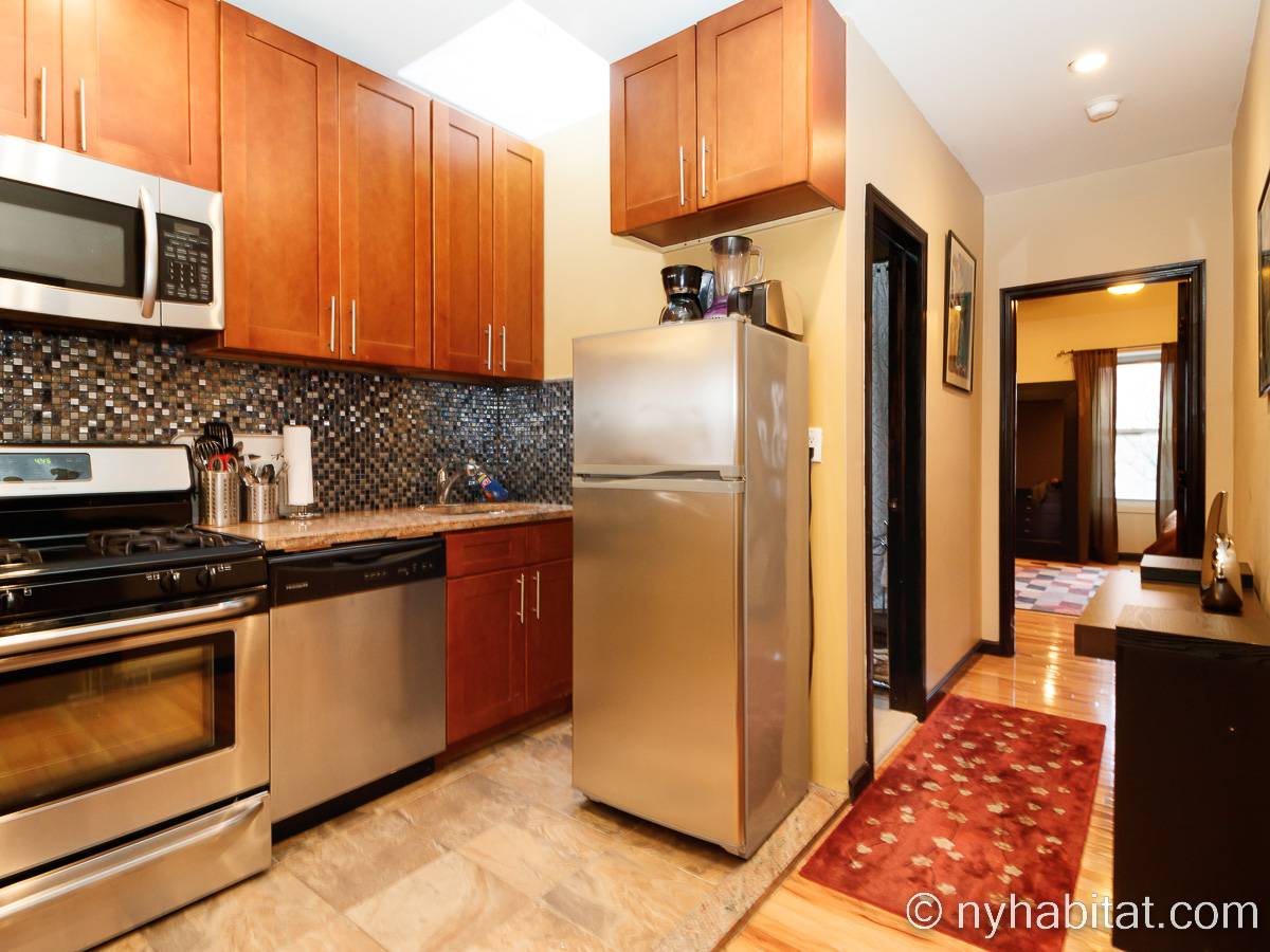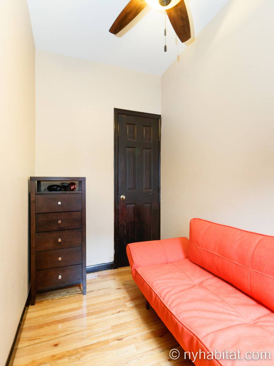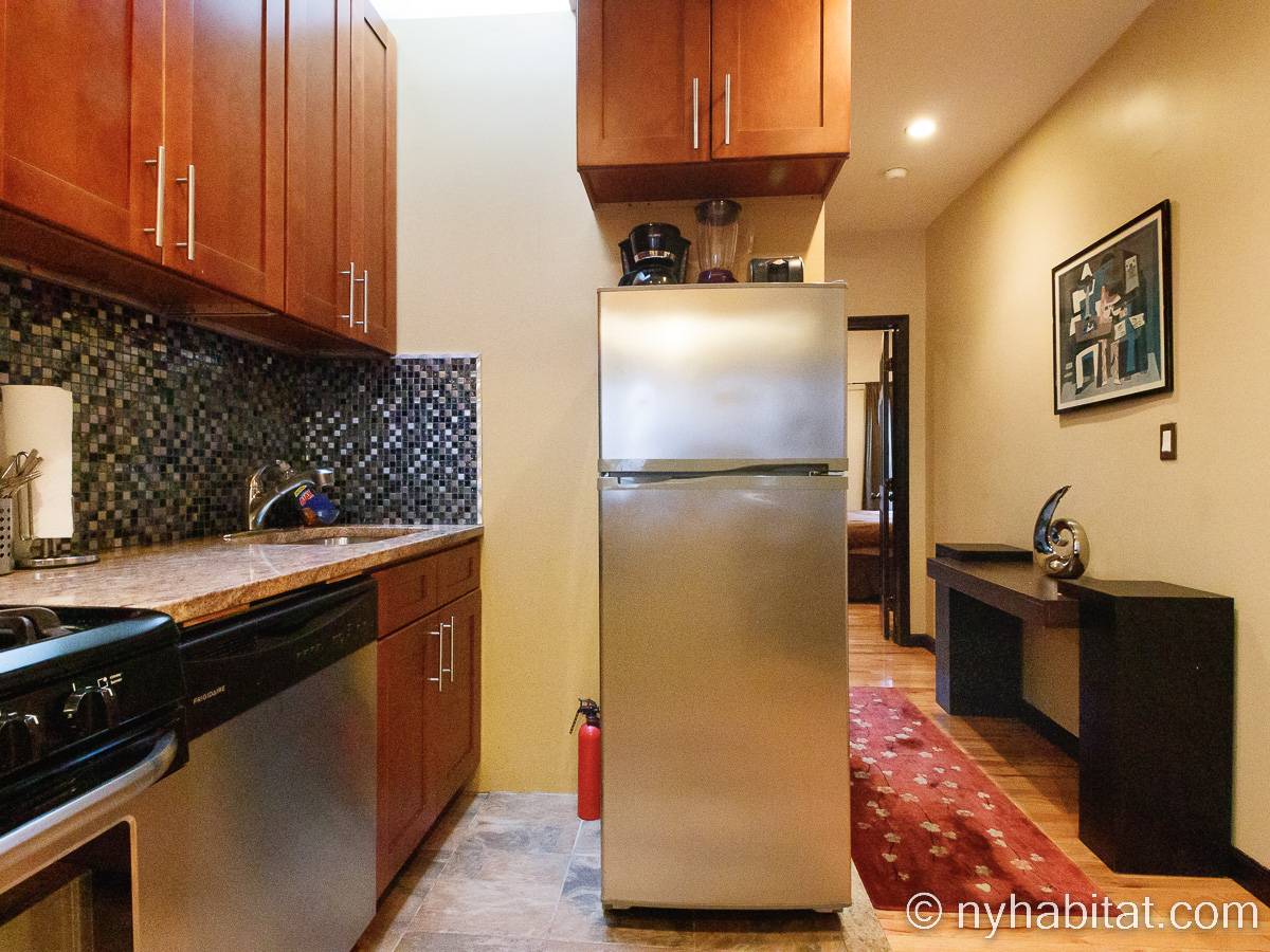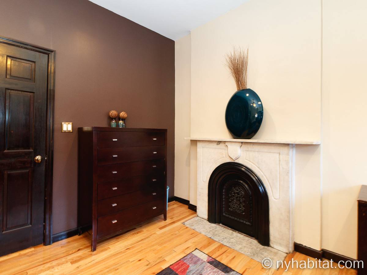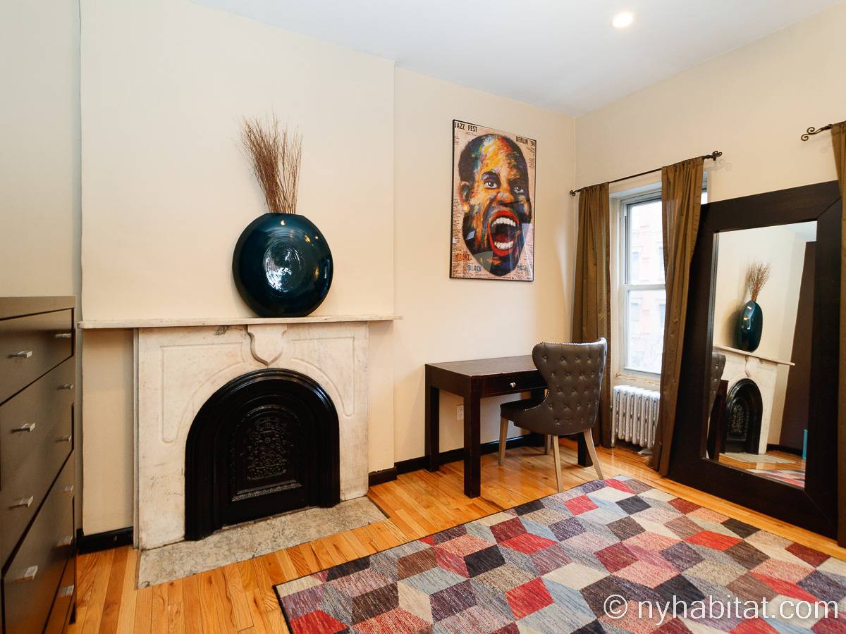 Diese renovierte Mietwohnung ist ideal geschnitten, um Privatsphäre auszuleben, und hat vollständig möblierte Zimmer. In der sorgfältig gestrichenen 2-Zimmer-Wohnung finden sich verteilt einzigartige Kunstwerke und vielseitige Teppiche auf den Hartholzböden. Im Wohnzimmer steht ein Zwei-Personen-Sofa gegenüber des Flachbildfernsehers mit Kabelanschluss, der über einem dekorativen Kamin angebracht ist. Zwei große Fenster mit langen, weißen Vorhängen blicken auf den Innenhof und sorgen für einen natürlichen Lichteinfall und genügend Belüftung. Der kompakte Alkoven (Wohnzimmer 2) ist mit dem Wohnzimmer verbunden. Hier stehen ein hell-rotes Ein-Personen-Schlafsofa, eine Kommode und ein Kleiderschrank zur Verfügung, ideal für einen Gast oder einen Mieter mit wenigen persönlichen Dingen. Die Küche und das private Badezimmer trennen die Wohnzimmer 1 und 2 von dem Hauptschlafzimmer. Die geflieste Küche ist mit Granit-Arbeitsplatten und Edelstahlgeräten ausgestattet und ist zum Wohnzimmer hin offen, sodass es möglich ist, während des Kochens Gespräche zu führen.