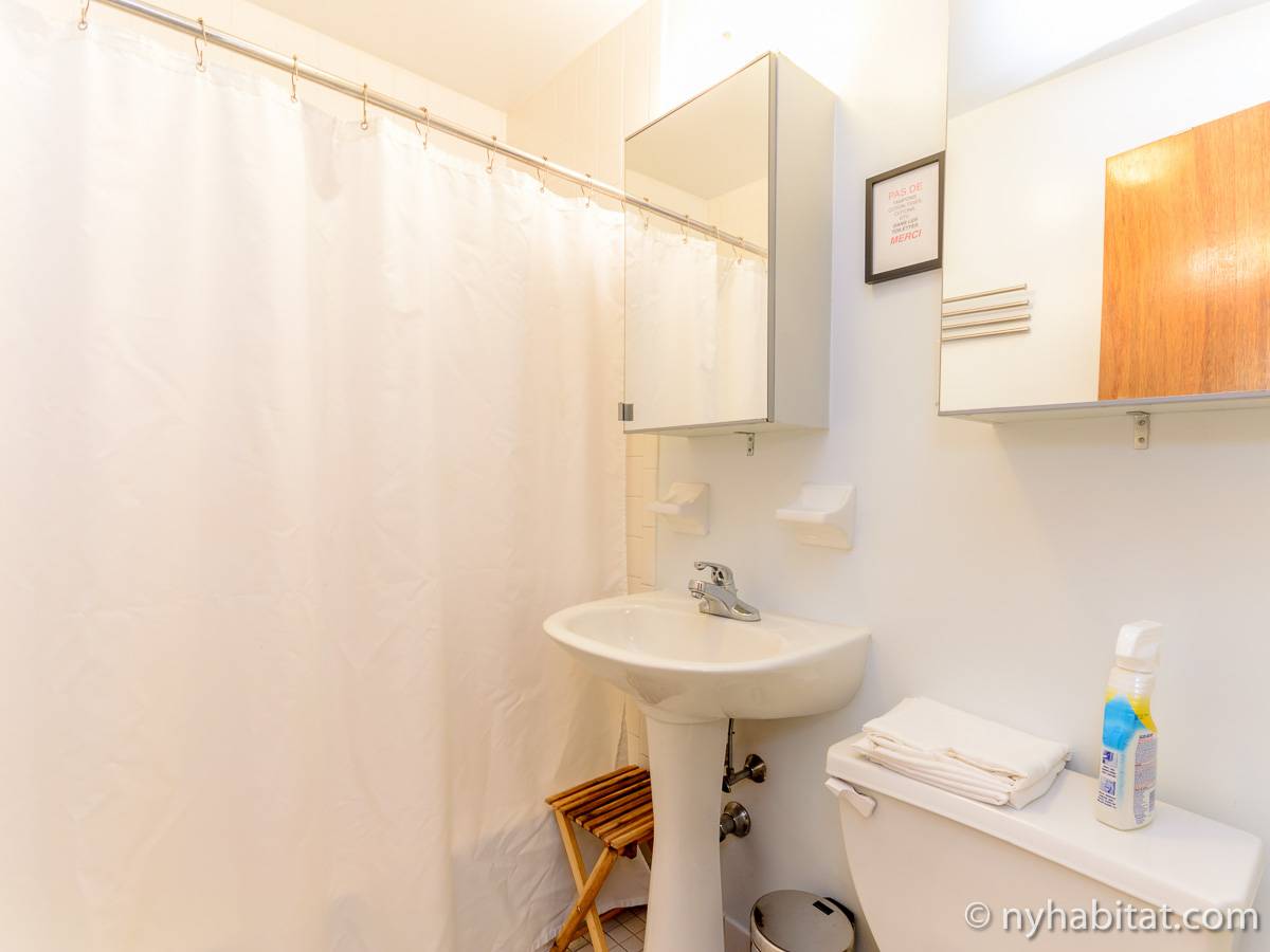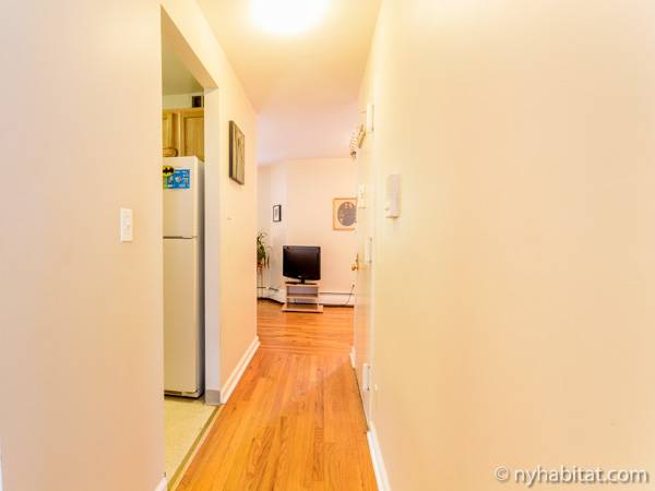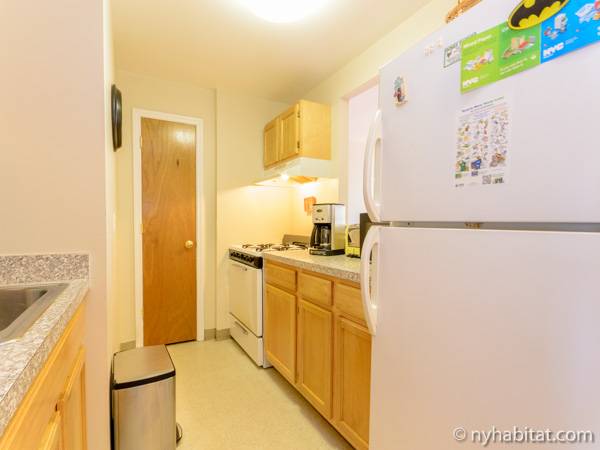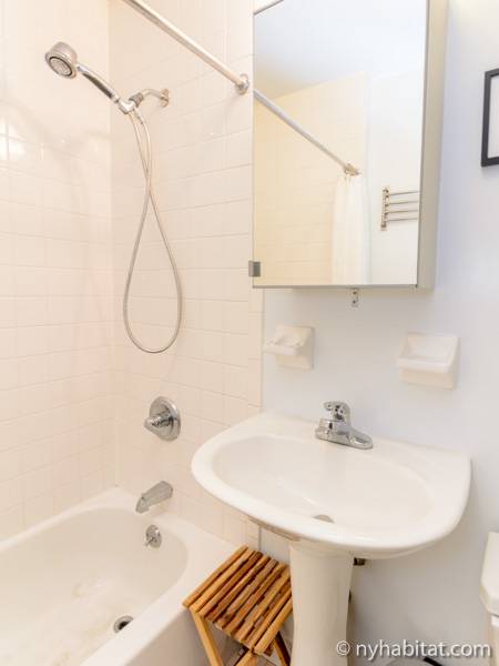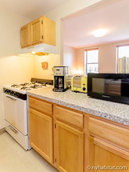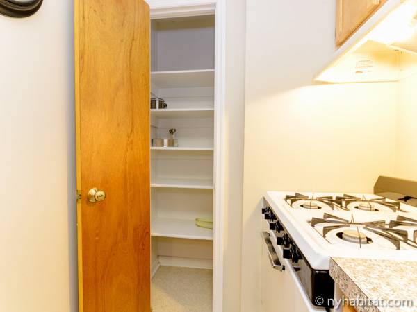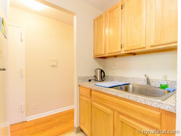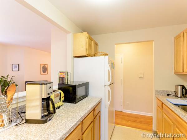 Die separate Küche hat einen gefliesten Boden und Granit-Arbeitsflächen und bietet viel Stauraum. Eine Grundausstattung an Küchengeräten ist vorhanden, dies gibt dem Bewohner die Möglichkeit, köstliche Speisen selbst zuzubereiten - eine Seltenheit in New York! Das gekachelte Badezimmer verfügt über eine Wanne mit integrierter Dusche und Vorhängen, frische Handtücher liegen für Sie bereit.