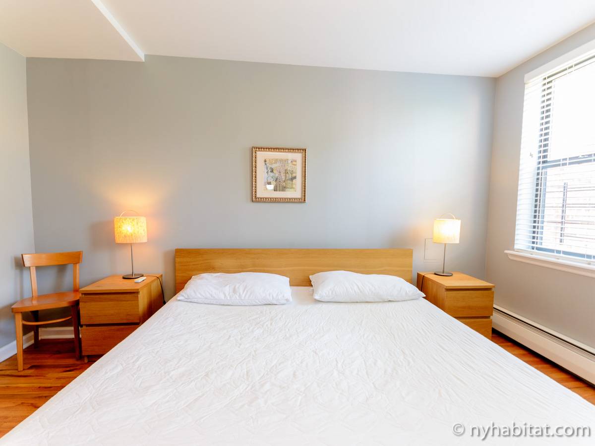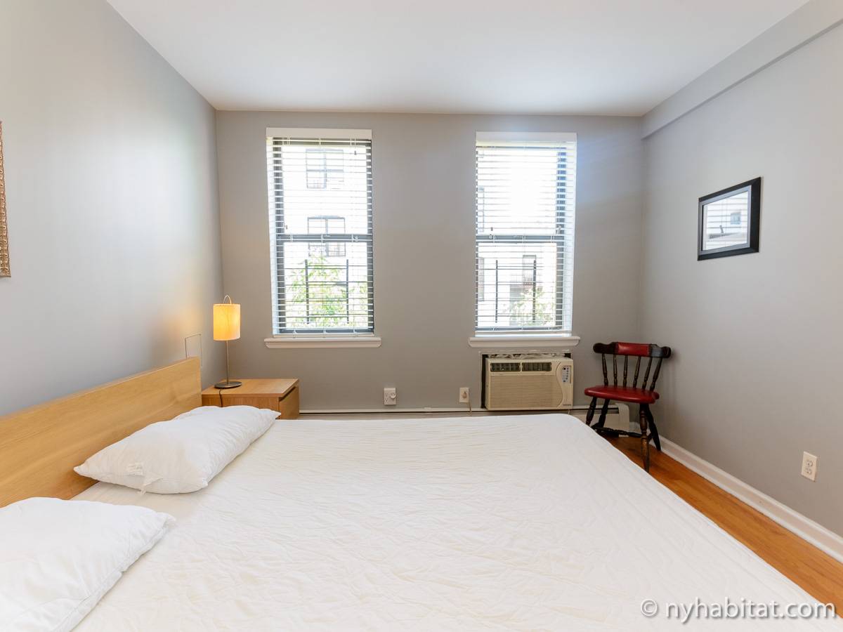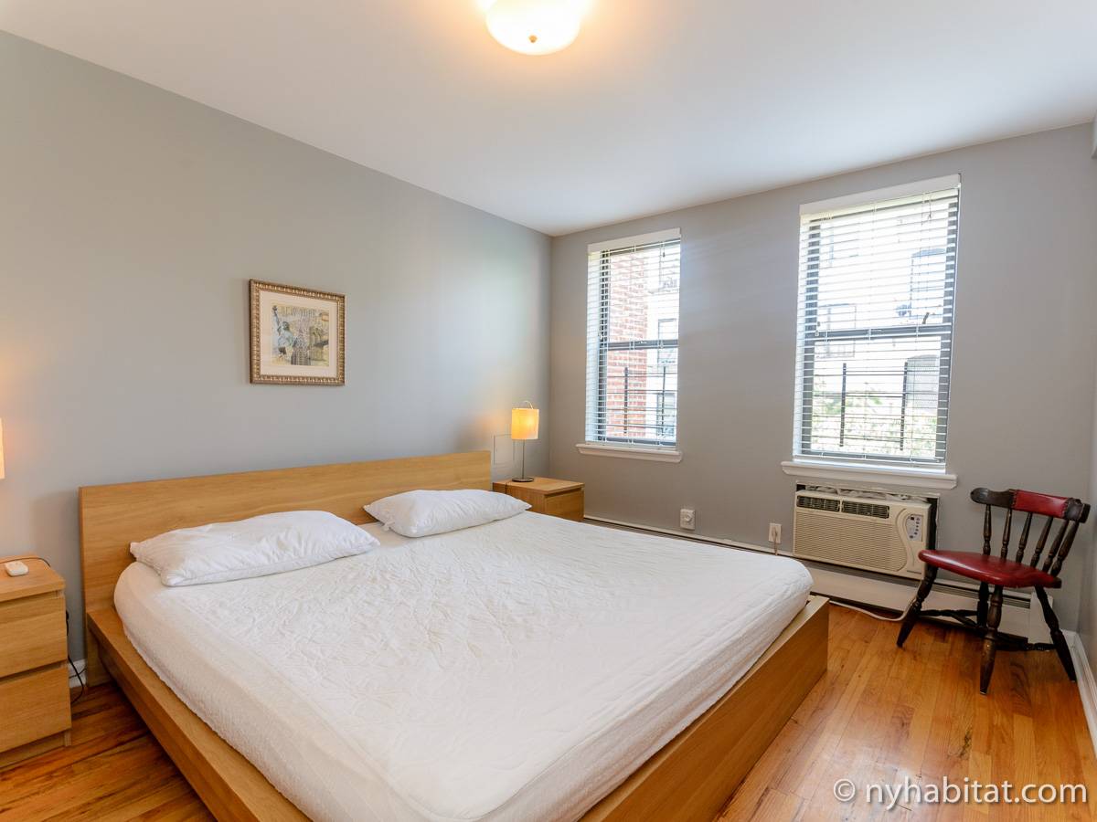 Das erste Schlafzimmer ist das Hauptschlafzimmer. Es hat ein Kingsize-Bett mit Laken und ist mit einer Klimaanlage und einem Fernseher für nächtliche Unterhaltung ausgestattet. Die Schränke bieten viel Platz. Ein Fenster gibt einen Ausblick über die Straßen von Harlem frei.