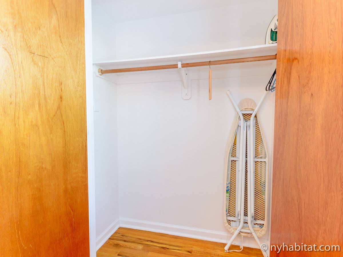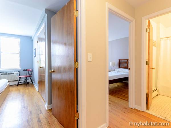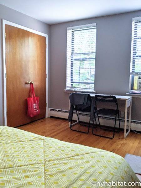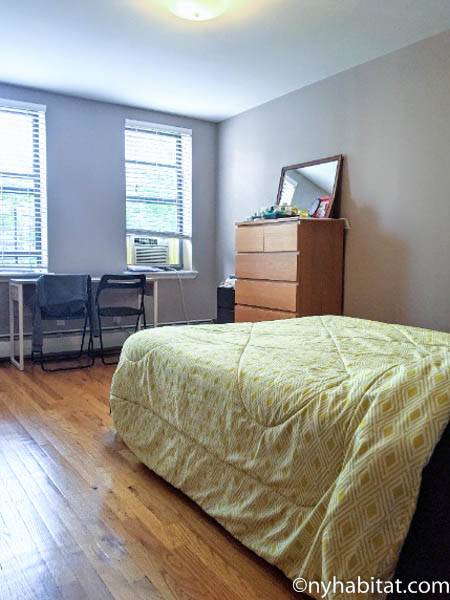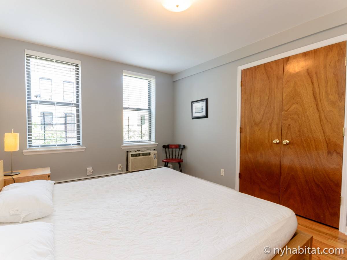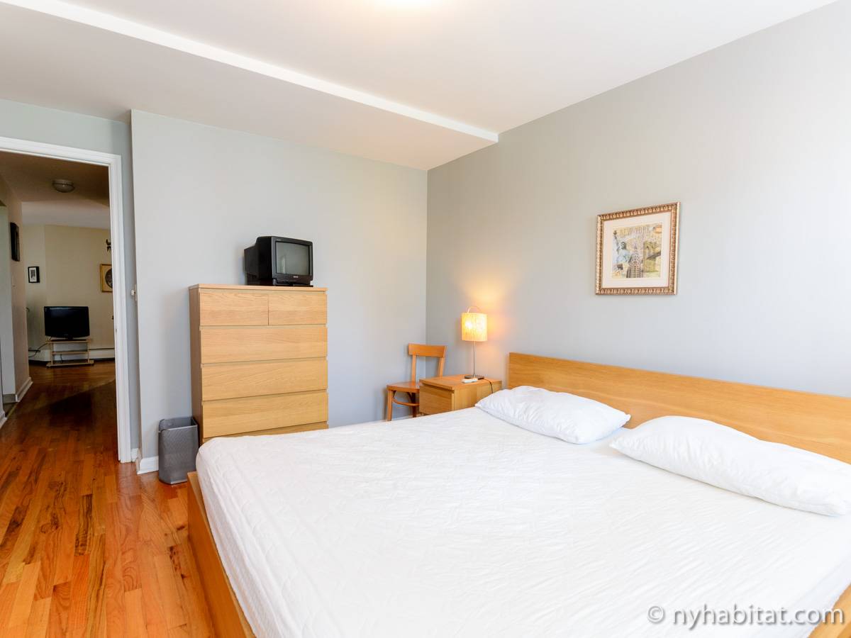 Das erste Schlafzimmer ist das Hauptschlafzimmer. Es hat ein Kingsize-Bett mit Laken und ist mit einer Klimaanlage und einem Fernseher für nächtliche Unterhaltung ausgestattet. Die Schränke bieten viel Platz. Ein Fenster gibt einen Ausblick über die Straßen von Harlem frei.