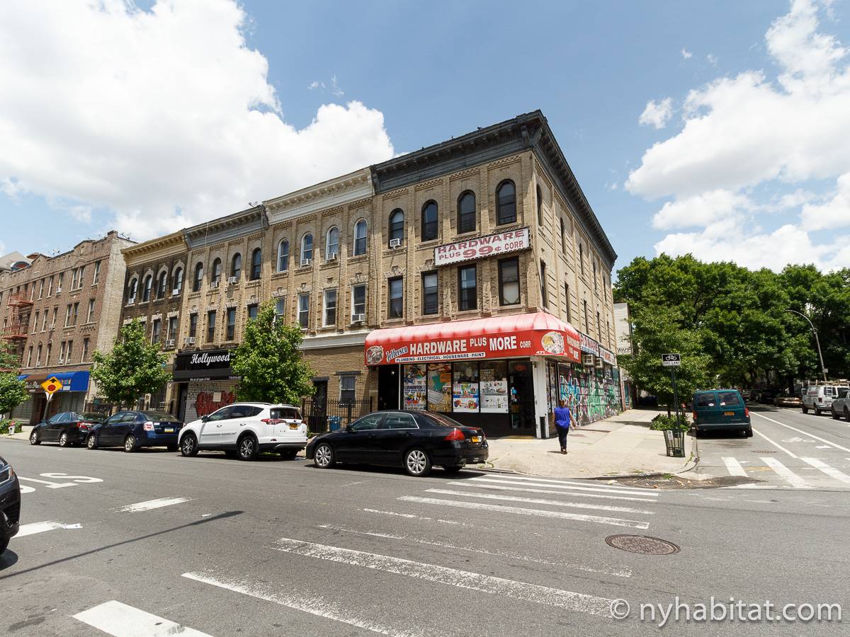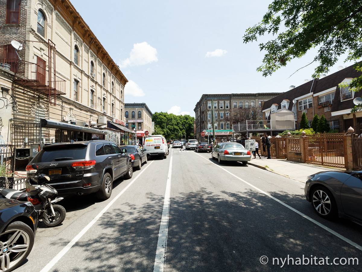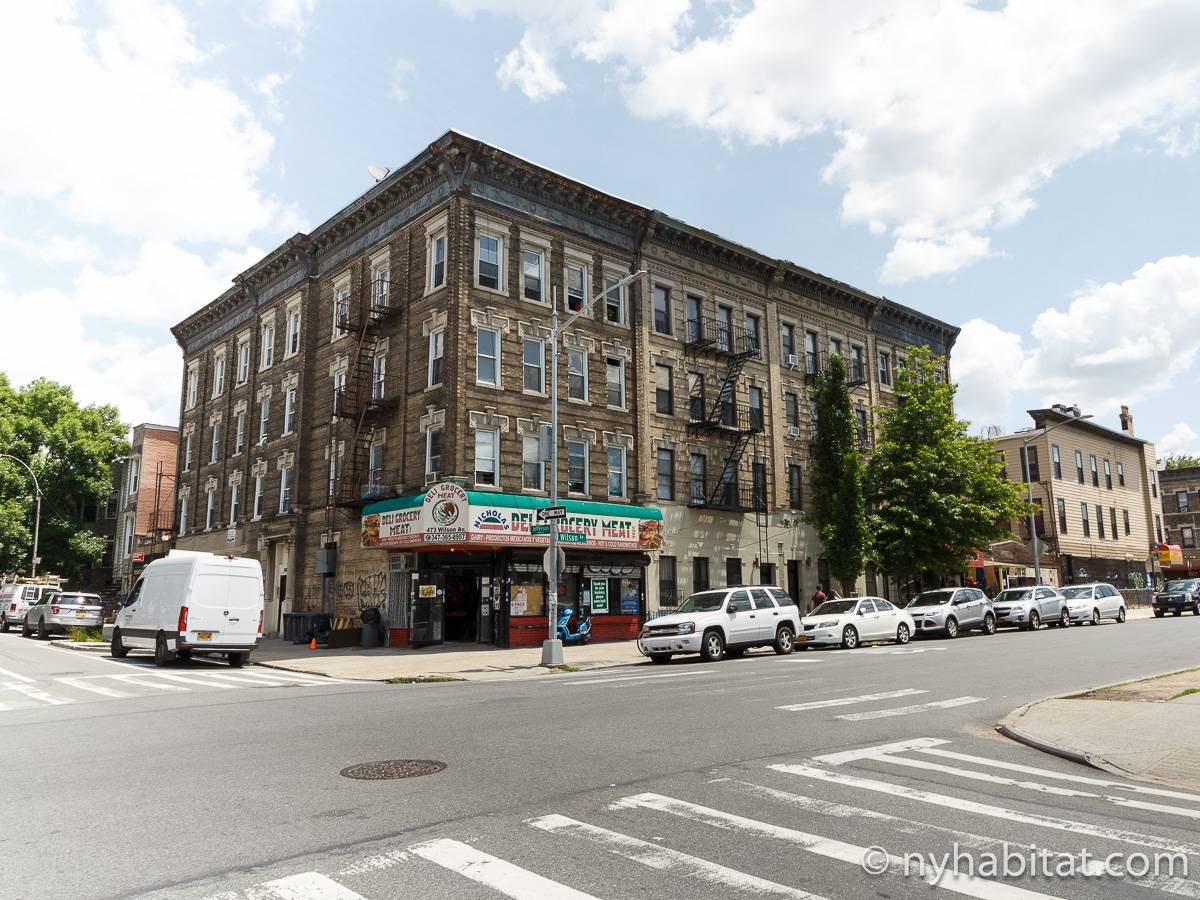 Die 2-Zimmer-Wohnung befindet sich in der Jefferson Avenue & Wilson Avenue auf der zweiten Etage (entspricht der ersten Etage in Europa) eines dreigeschossigen Reihenhauses.