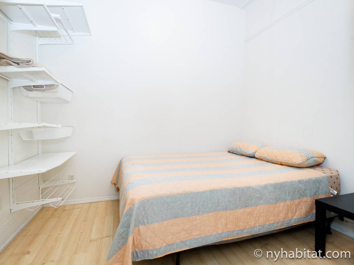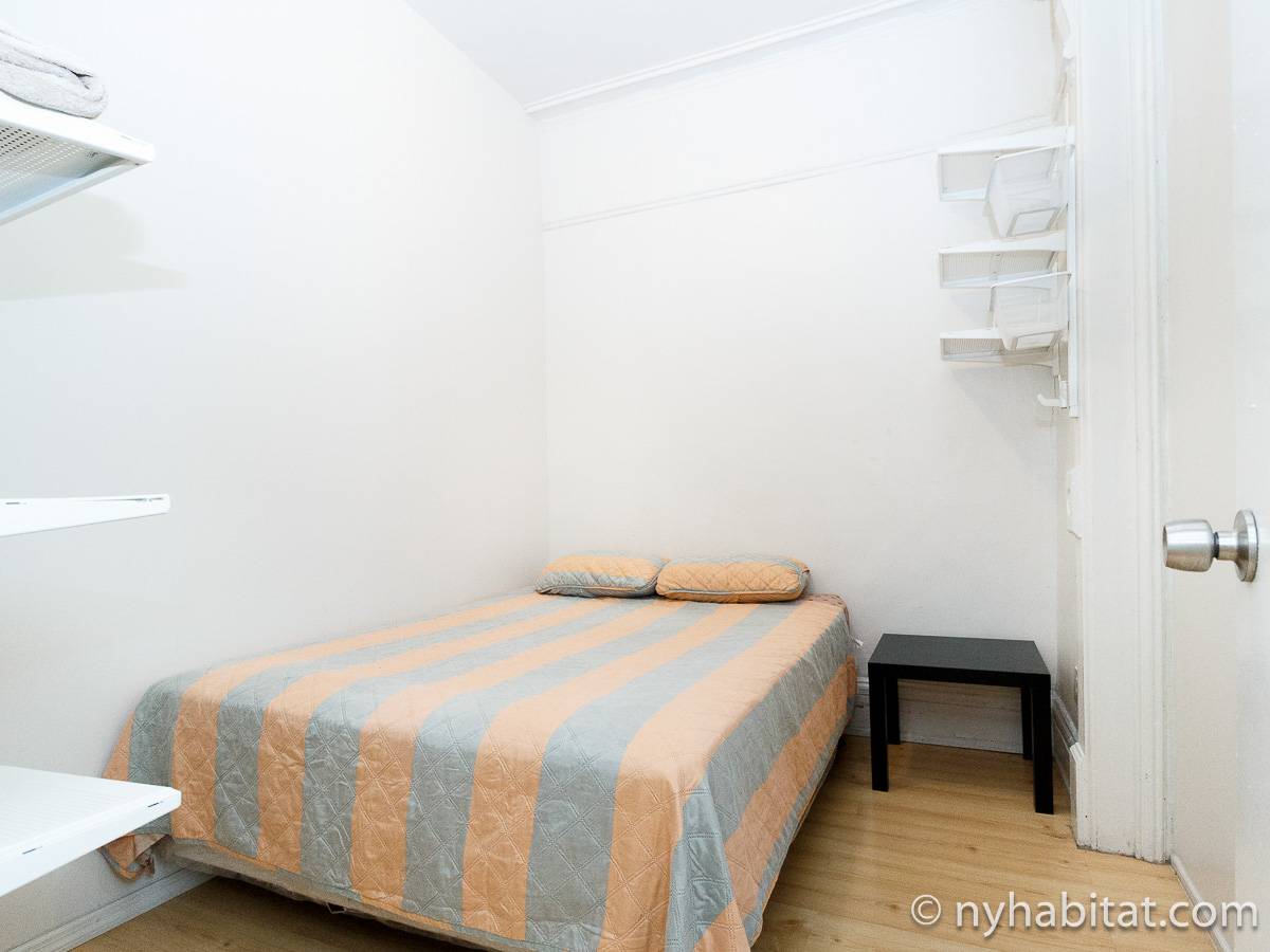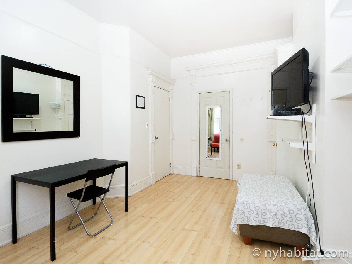 Das Schlafzimmer ist lang und schmal geschnitten und hat ein Fenster, von dem man direkt auf den ruhigen Hof sieht. Es beinhaltet ein Doppelbett, einen Schreibtisch mit Stuhl und Spiegel sowie eine Kommode mit Schubläden, um kleinere Objekte aufzubewahren. Ebenfalls gibt es einen Kabelfernseher, der zu jeder Abendunterhaltung dazugehört.