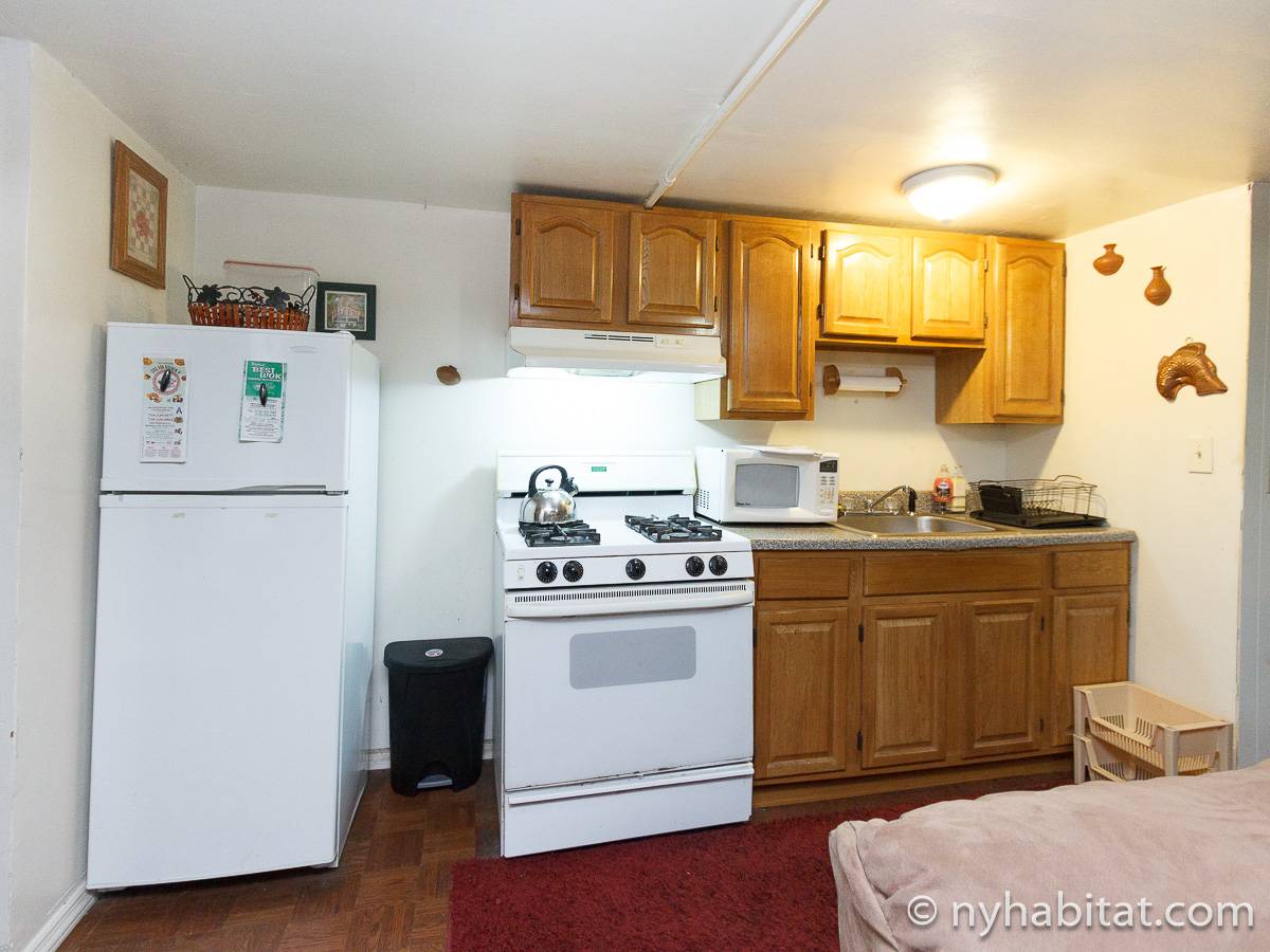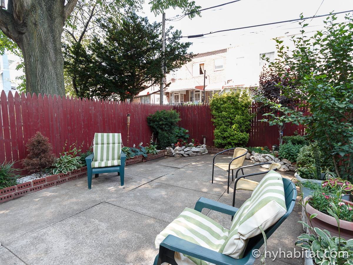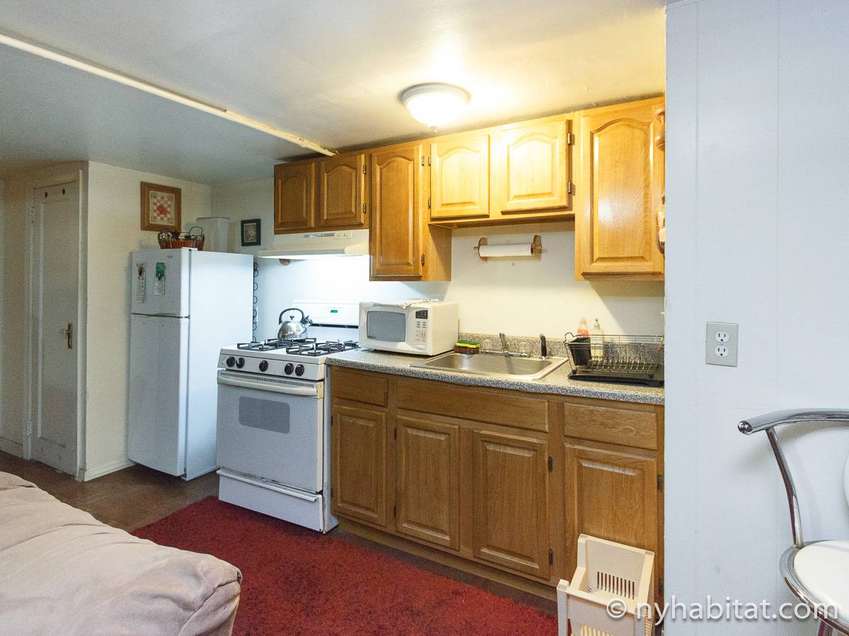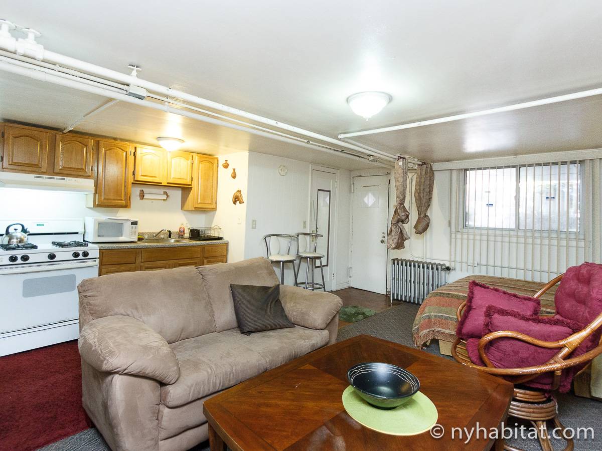 Beim Betreten der Studiowohnung liegen der Wohnbereich zu Ihrer Linken und die Küche zu Ihrer Rechten. Das Wohnzimmer ist gemütlich ausgestattet mit allen Möbeln, die ein Zuhause ausmachen. Es gibt ein großes Doppelbett mit Bettwäsche, ein Sofa, ein Mahagoni-Couchtisch und einen Kleiderschrank. Der Küchenbereich ist kompakt und voll funktionstüchtig ausgestattet mit einem Kühl-/Gefrierschrank, einem Backofen, einer Mikrowelle und einer Kaffeemaschine. Das Badezimmer besitzt eine Toilette, Dusche, Handtücher und einen goldgeränderten Spiegel. Durch die Hintertür gelangen Sie in den gemeinschaftlichen Gartenbereich, welcher umzäunt ist und bunte Pflanzen, Blumen und Außenmöbeln besitzt; der perfekte Ort, um sich zurückzulehnen, zu entspannen und den Himmel über New York zu beobachten.