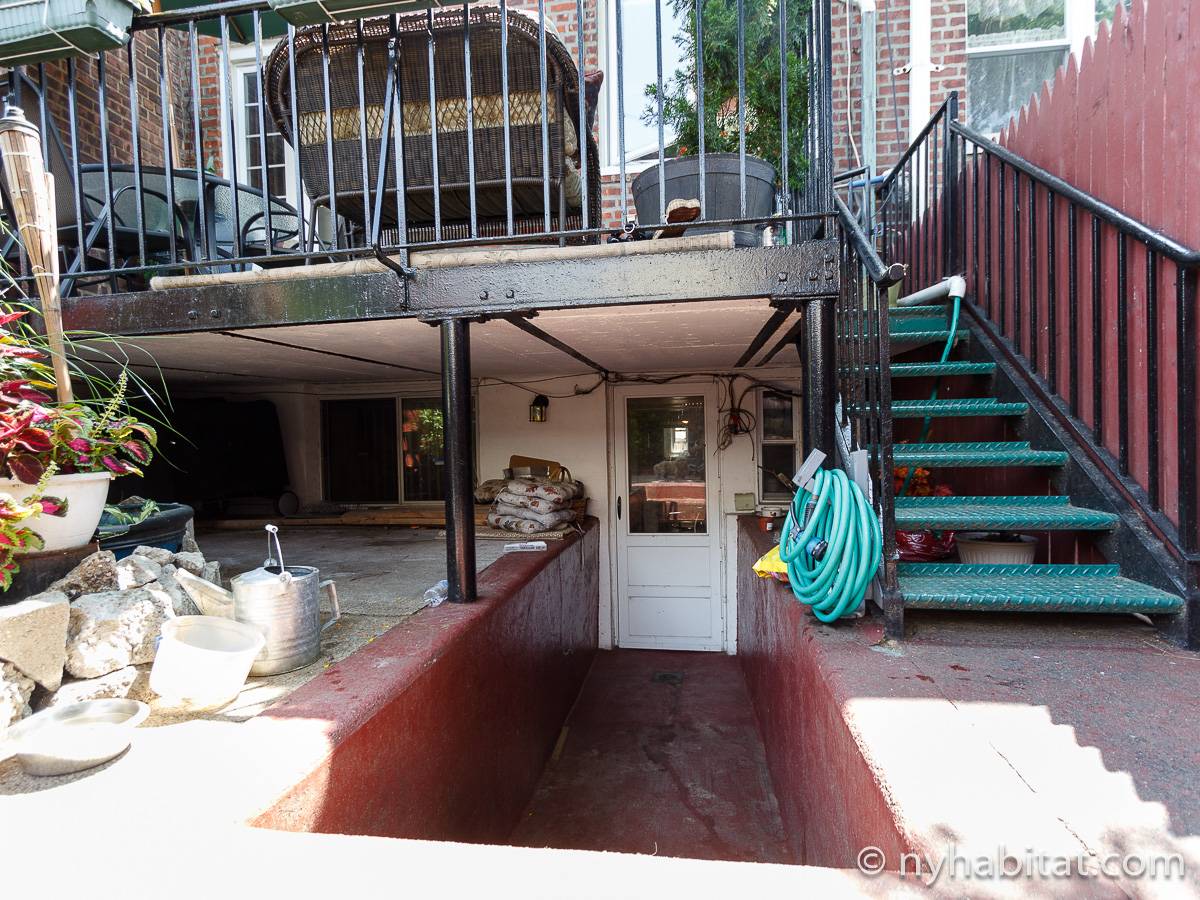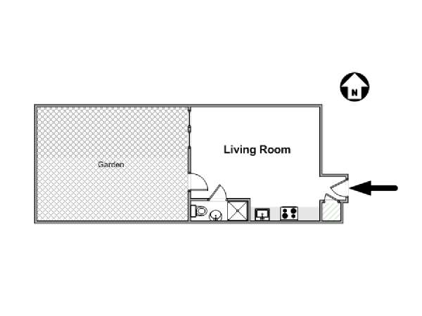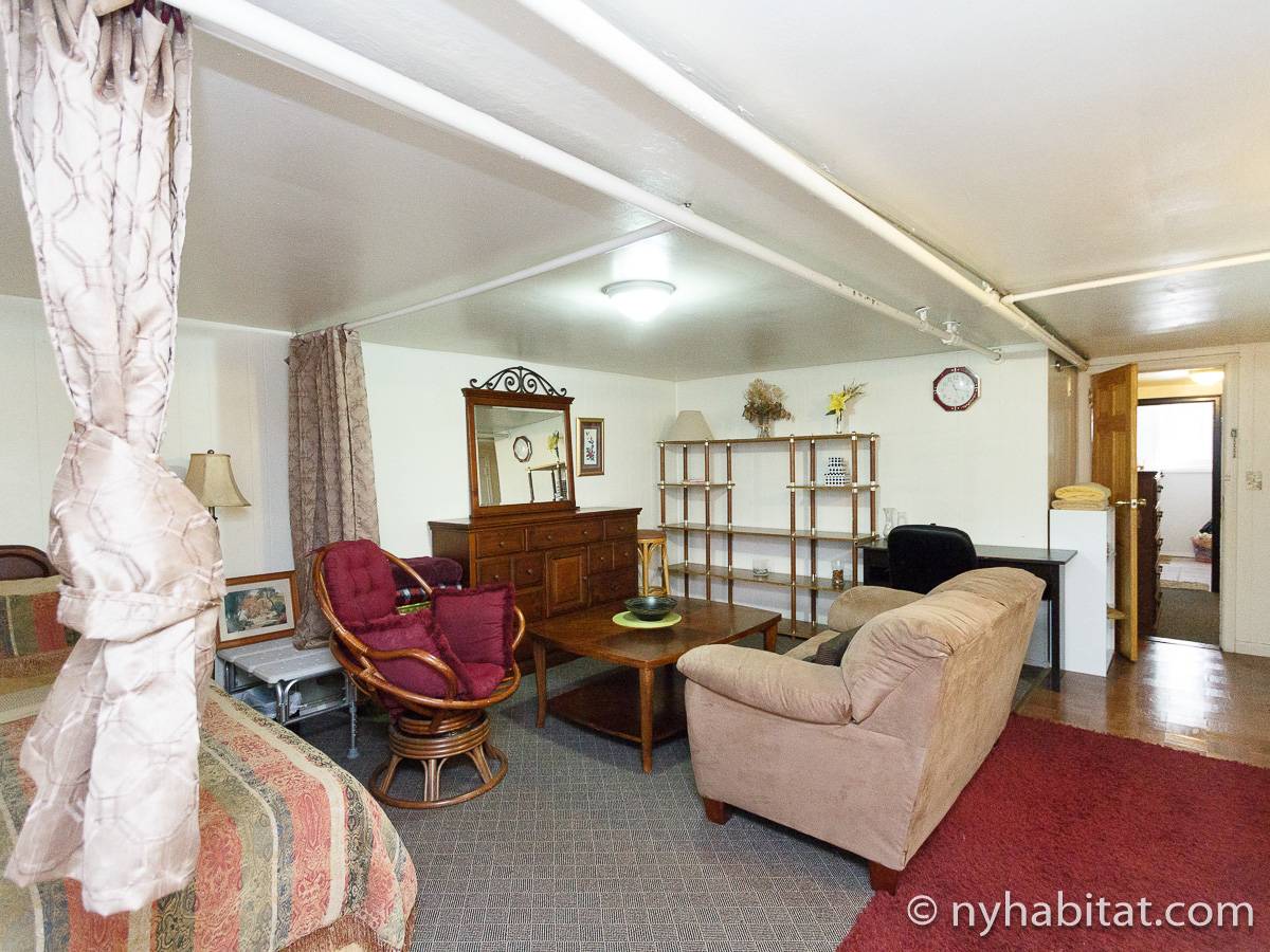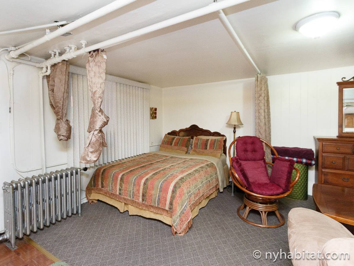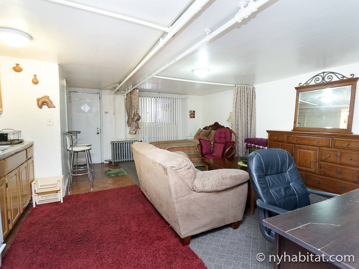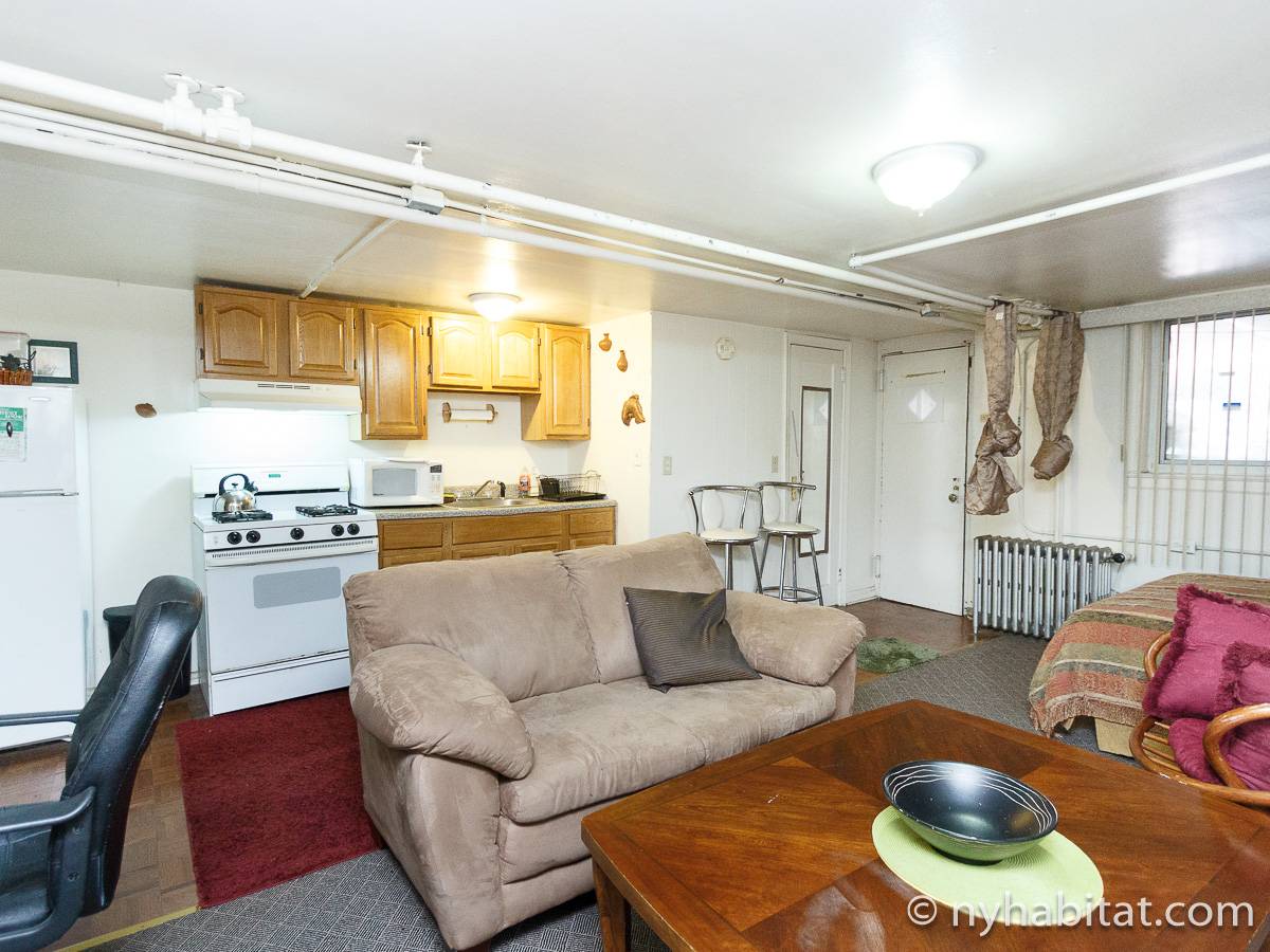 Beim Betreten der Studiowohnung liegen der Wohnbereich zu Ihrer Linken und die Küche zu Ihrer Rechten. Das Wohnzimmer ist gemütlich ausgestattet mit allen Möbeln, die ein Zuhause ausmachen. Es gibt ein großes Doppelbett mit Bettwäsche, ein Sofa, ein Mahagoni-Couchtisch und einen Kleiderschrank. Der Küchenbereich ist kompakt und voll funktionstüchtig ausgestattet mit einem Kühl-/Gefrierschrank, einem Backofen, einer Mikrowelle und einer Kaffeemaschine. Das Badezimmer besitzt eine Toilette, Dusche, Handtücher und einen goldgeränderten Spiegel. Durch die Hintertür gelangen Sie in den gemeinschaftlichen Gartenbereich, welcher umzäunt ist und bunte Pflanzen, Blumen und Außenmöbeln besitzt; der perfekte Ort, um sich zurückzulehnen, zu entspannen und den Himmel über New York zu beobachten.