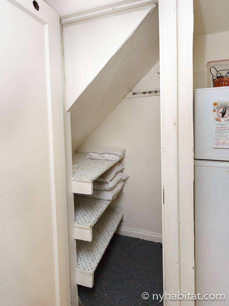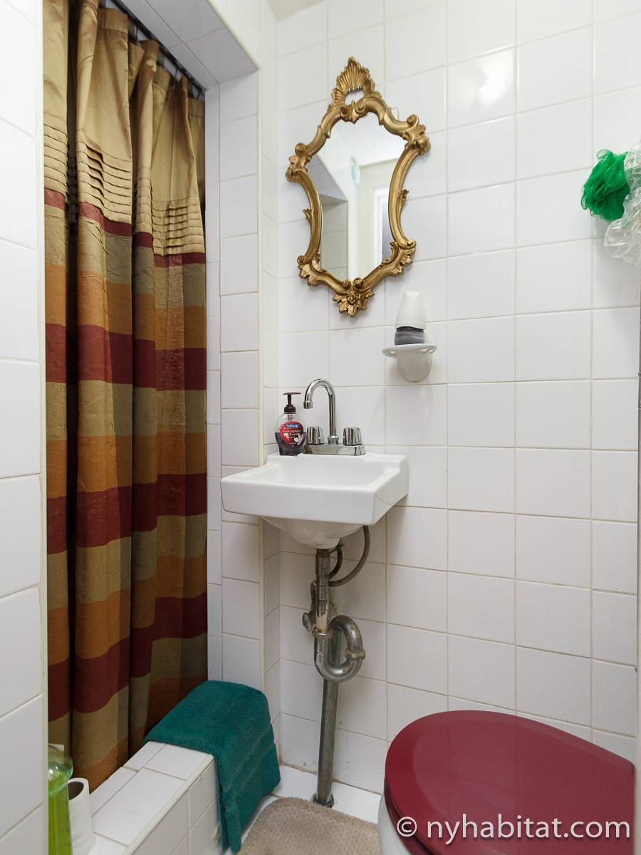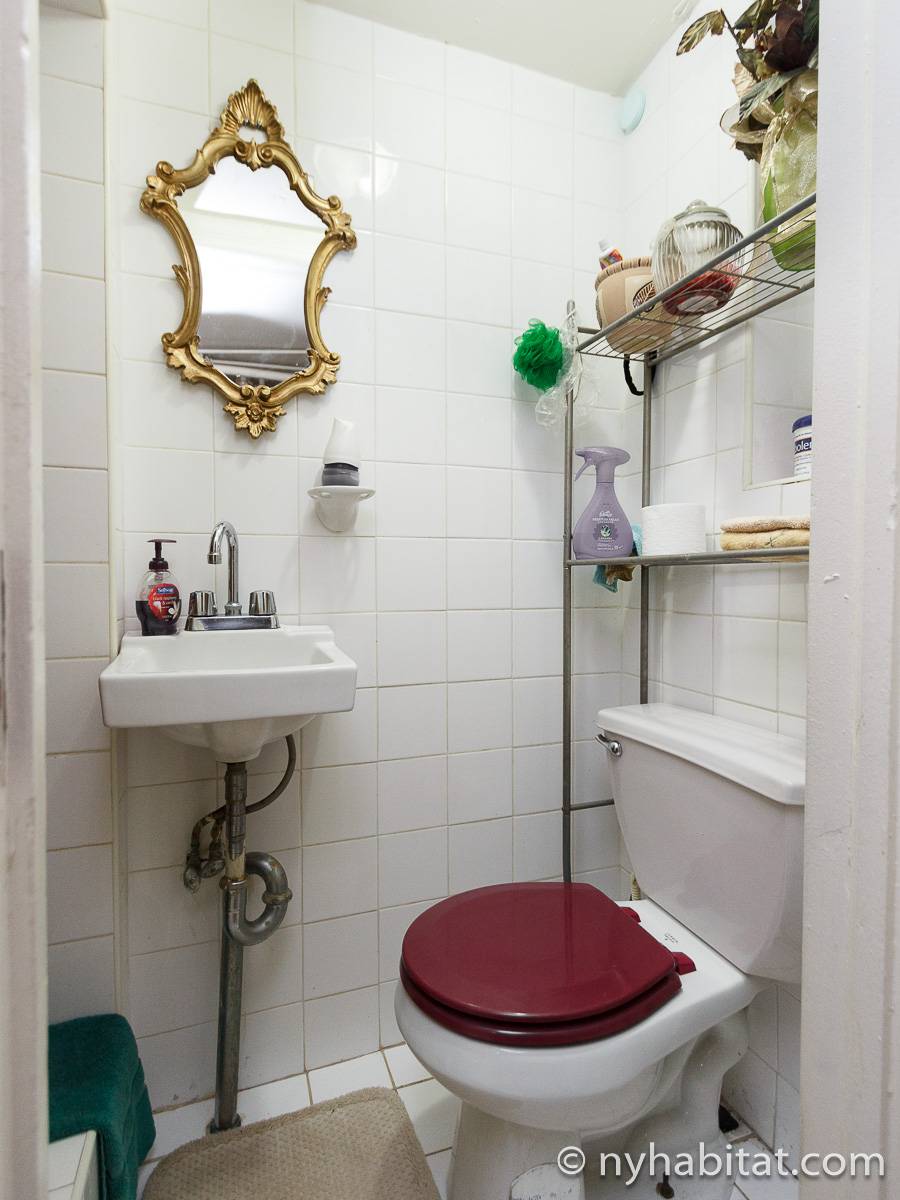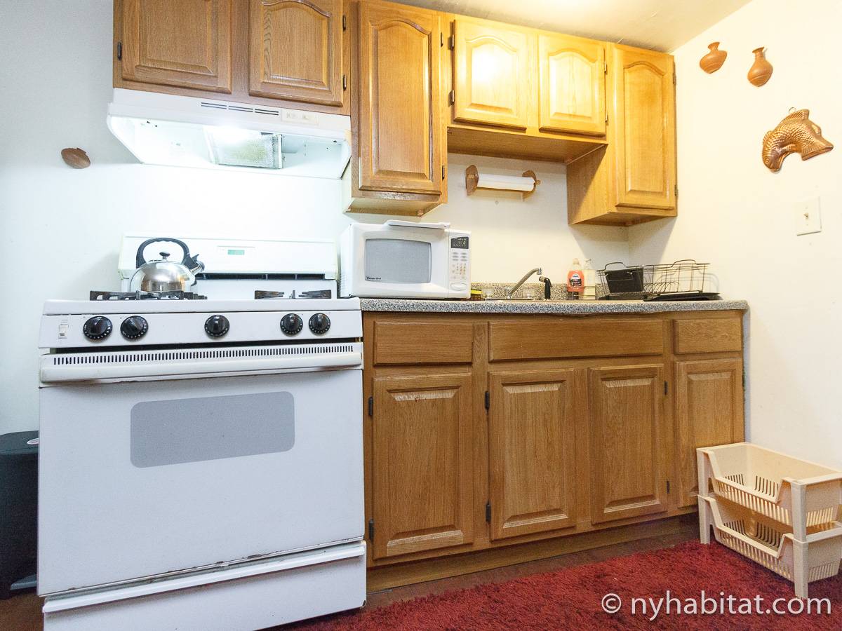 Beim Betreten der Studiowohnung liegen der Wohnbereich zu Ihrer Linken und die Küche zu Ihrer Rechten. Das Wohnzimmer ist gemütlich ausgestattet mit allen Möbeln, die ein Zuhause ausmachen. Es gibt ein großes Doppelbett mit Bettwäsche, ein Sofa, ein Mahagoni-Couchtisch und einen Kleiderschrank. Der Küchenbereich ist kompakt und voll funktionstüchtig ausgestattet mit einem Kühl-/Gefrierschrank, einem Backofen, einer Mikrowelle und einer Kaffeemaschine. Das Badezimmer besitzt eine Toilette, Dusche, Handtücher und einen goldgeränderten Spiegel. Durch die Hintertür gelangen Sie in den gemeinschaftlichen Gartenbereich, welcher umzäunt ist und bunte Pflanzen, Blumen und Außenmöbeln besitzt; der perfekte Ort, um sich zurückzulehnen, zu entspannen und den Himmel über New York zu beobachten.