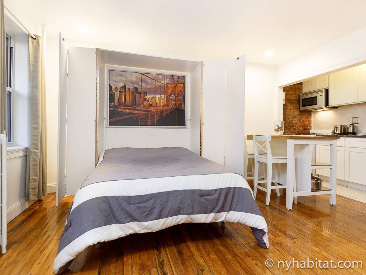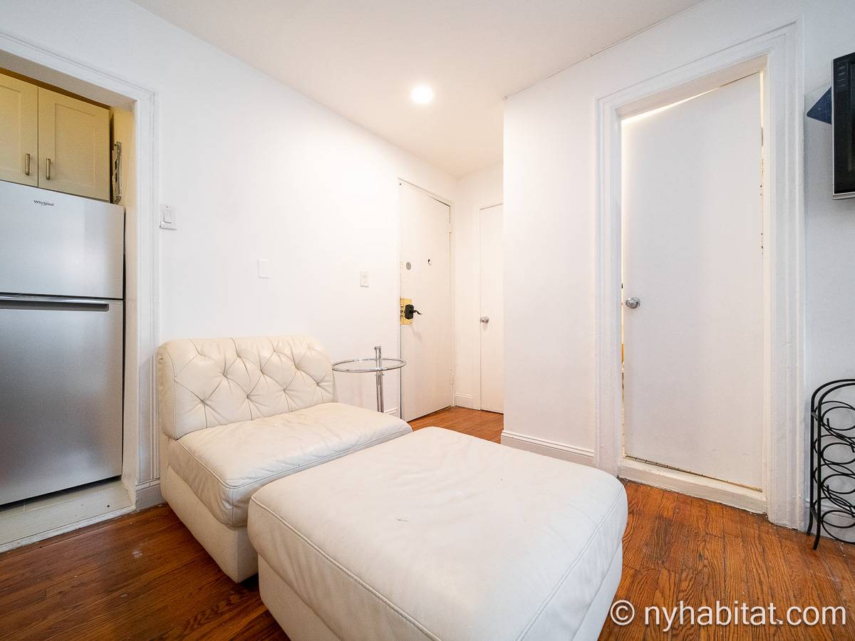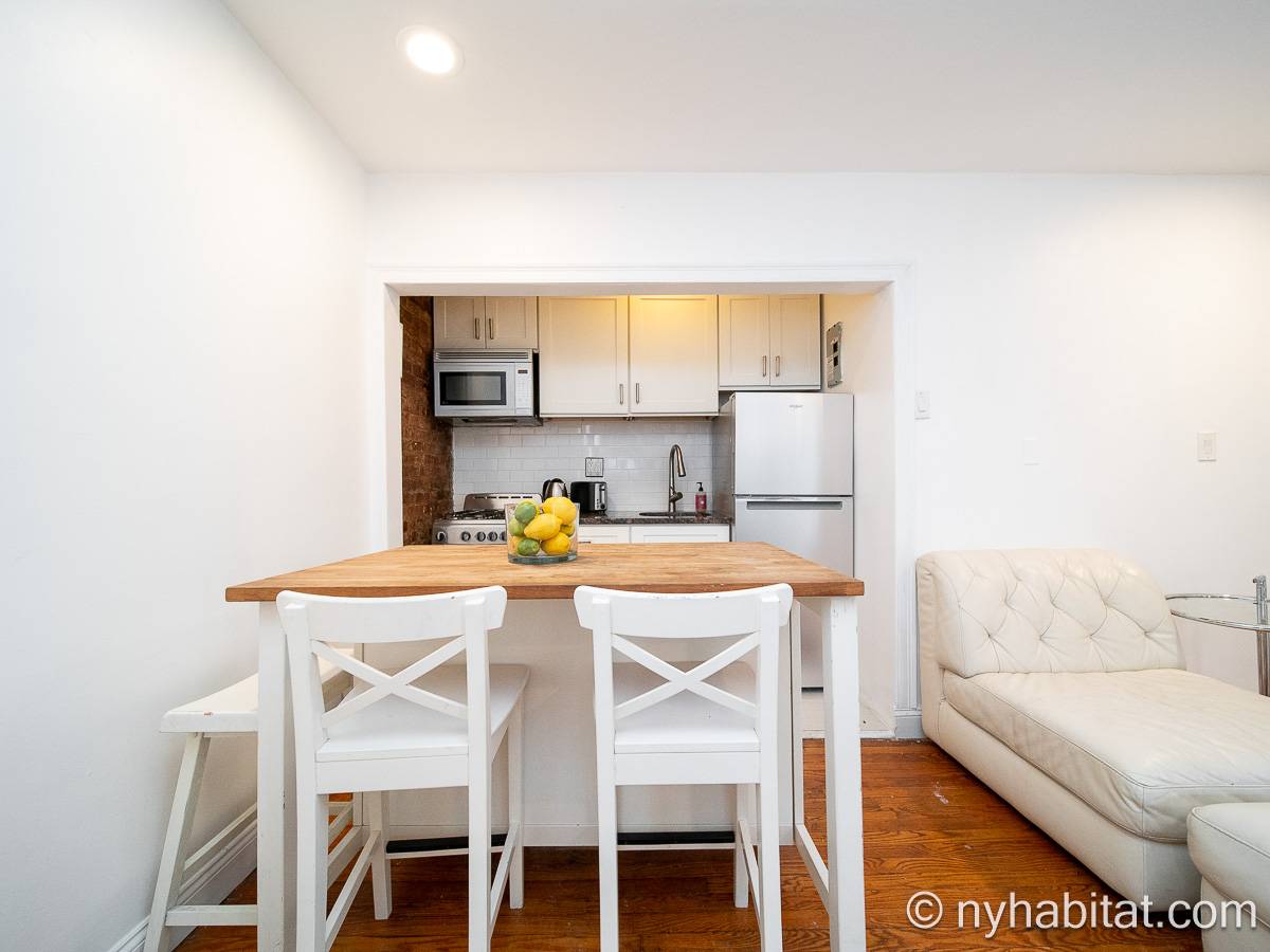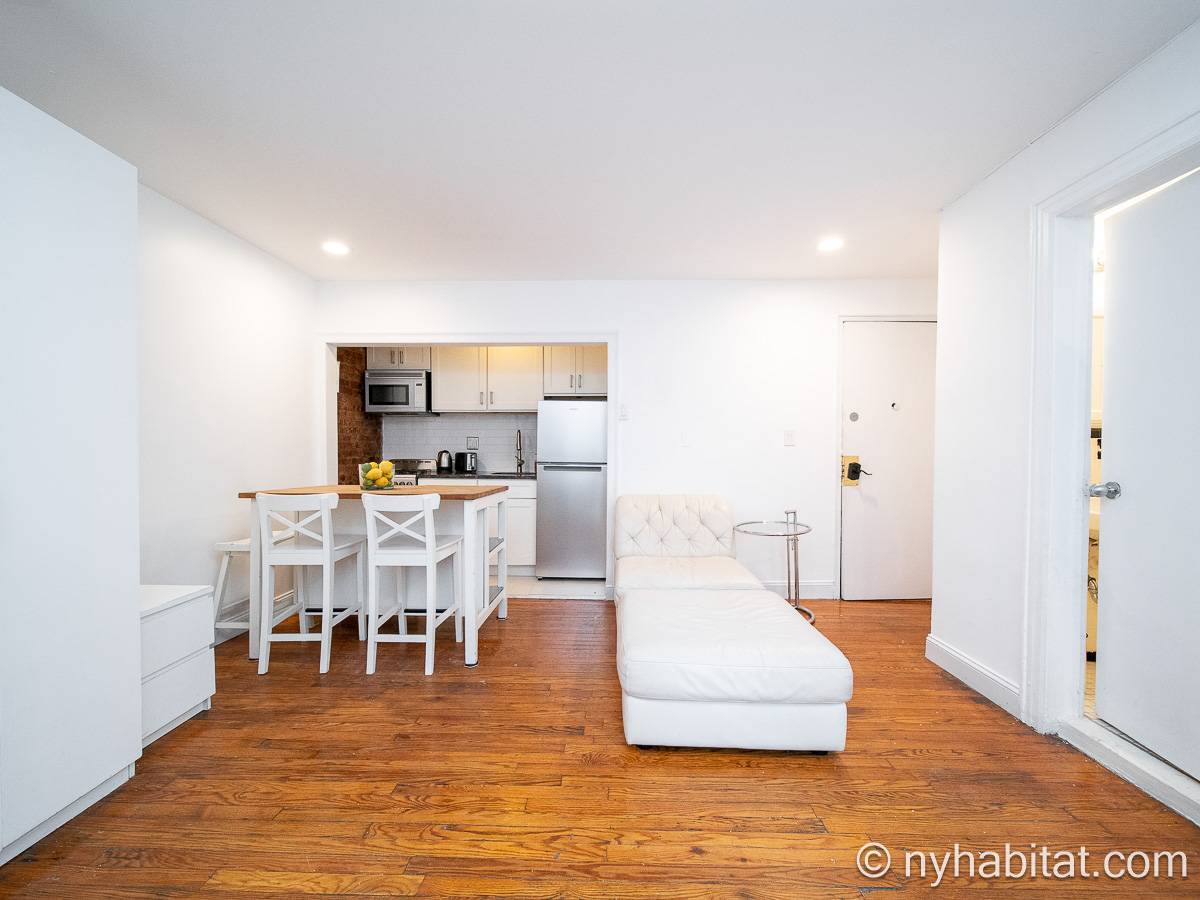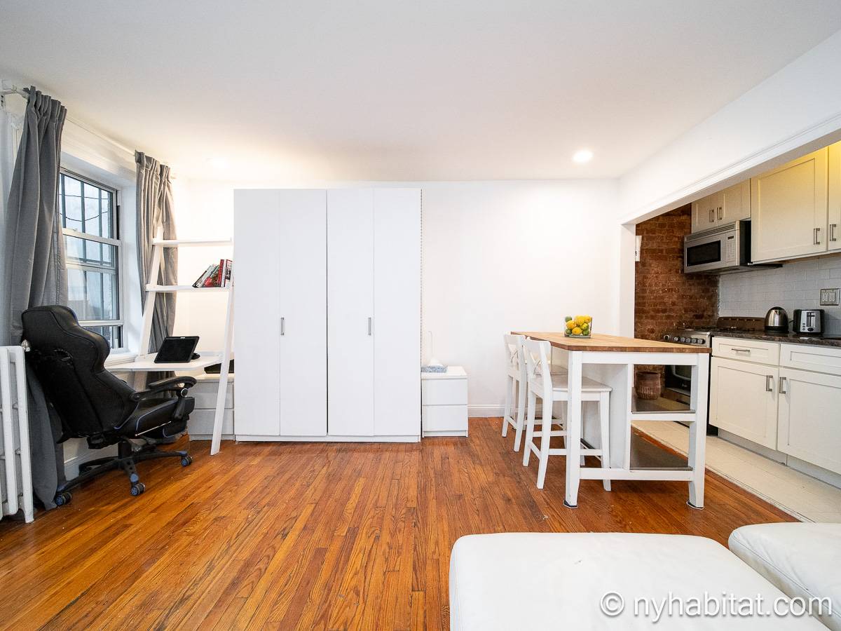 Diese UNmöblierte Wohnung besitzt eine klassisch-schlichte Einrichtung mit Hartholzböden und zwei großen Fenstern mit Schutzvorrichtungen.Neben dem Esstisch befindet sich die moderne und funktionale Küche mit einem Kühlschrank, Gefrierschrank, Kaffeemaschine, Mikrowelle und einem Toaster. Im Schrank gibt es ausreichend Stauraum. Das Badezimmer dieser Mietwohnung bietet eine Badewanne, Dusche, WC und Handtücher.