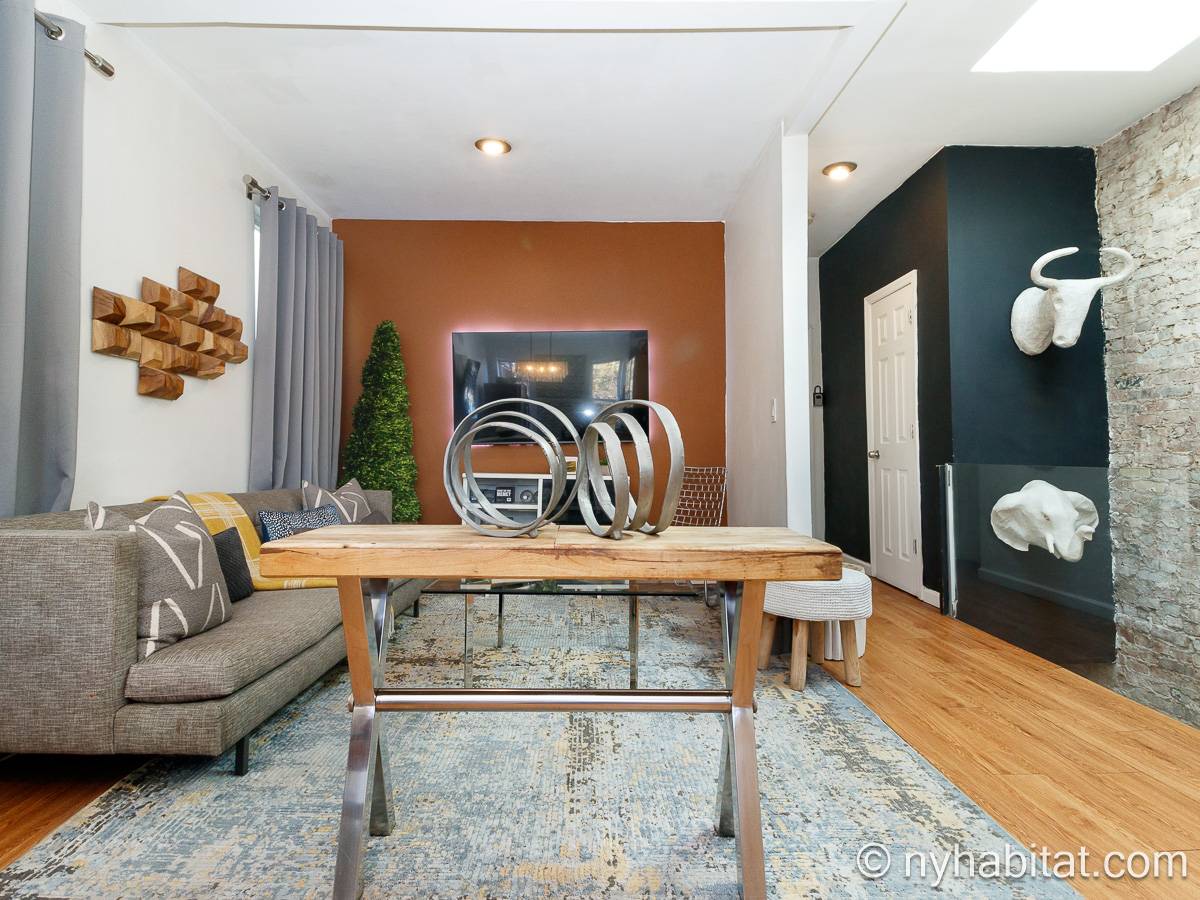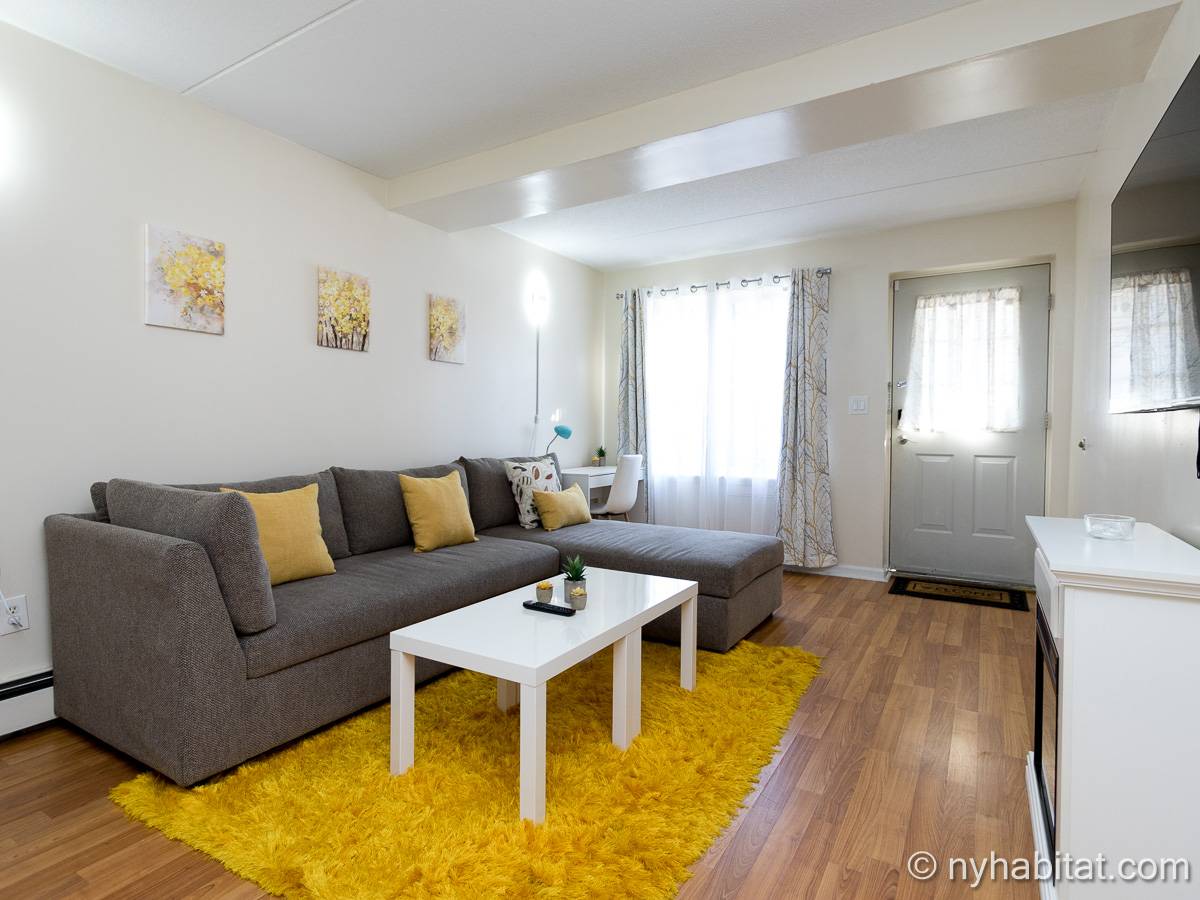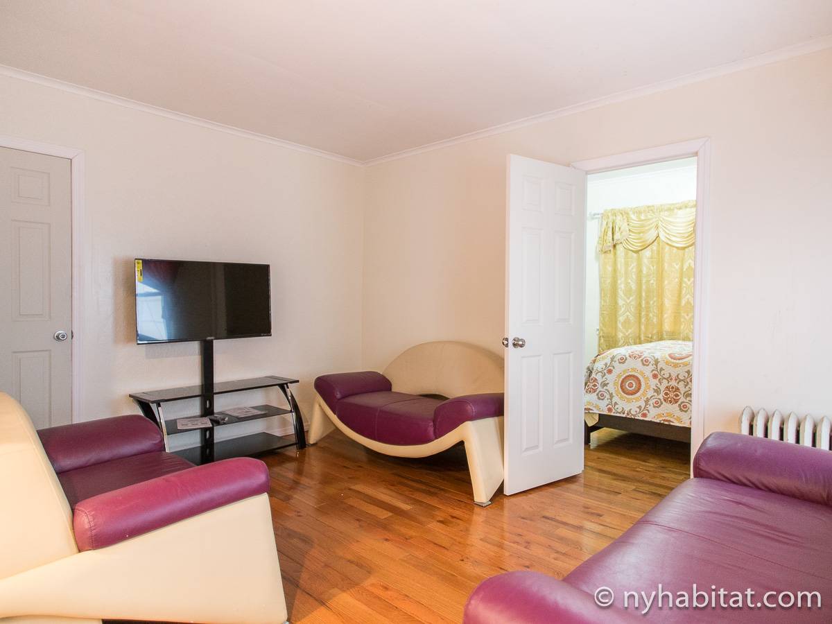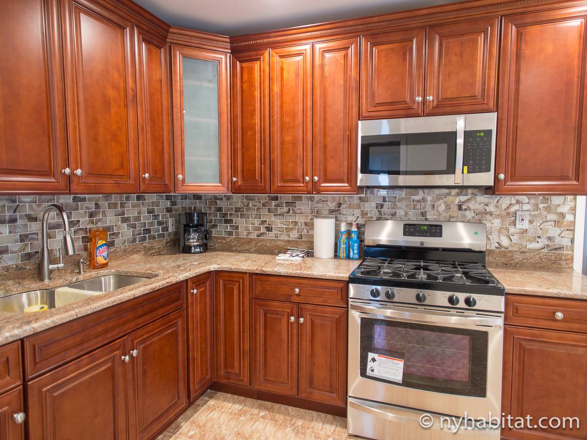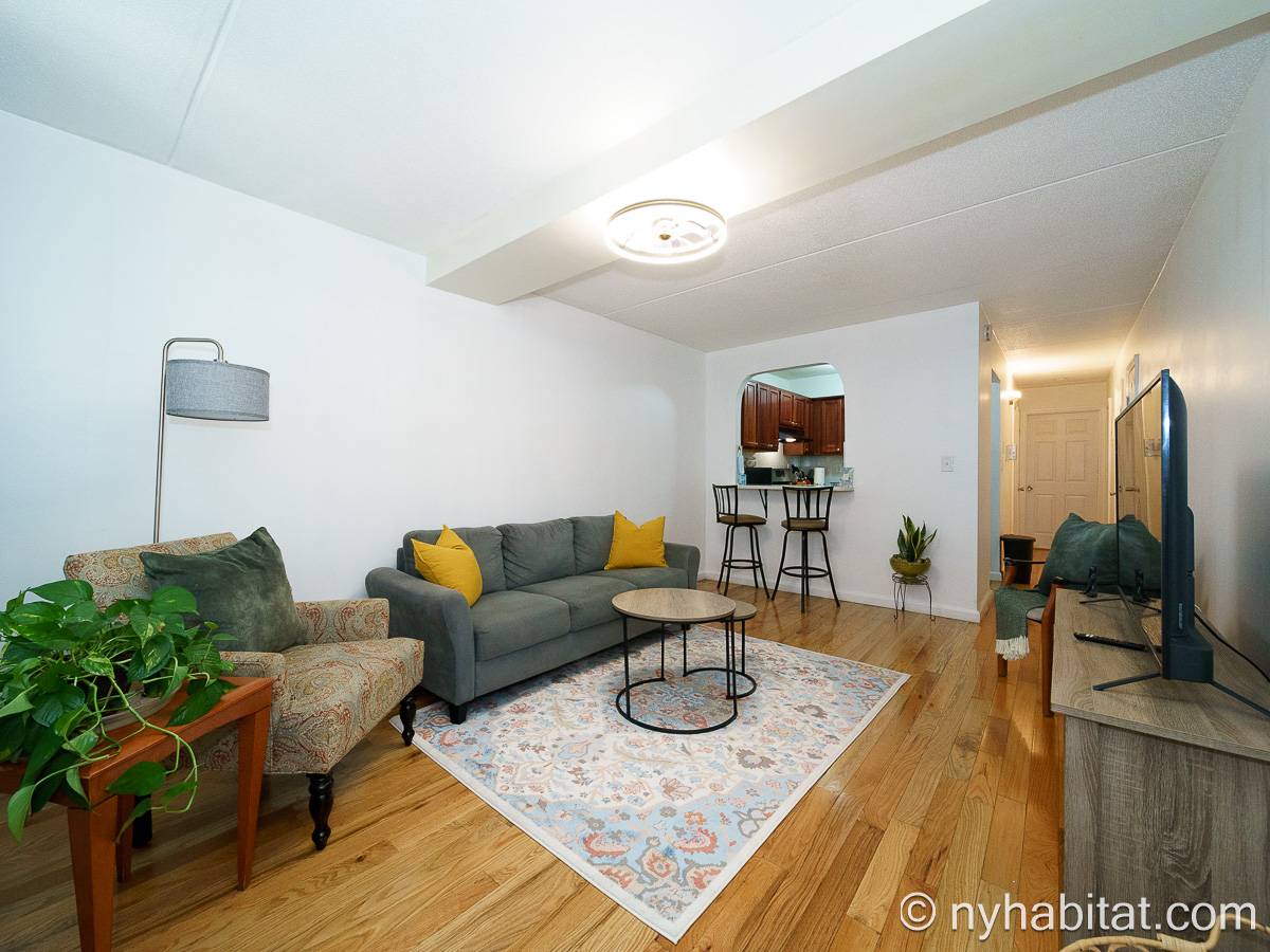 Das Wohnzimmer ist mit Holzfußboden ausgelegt und mit modernen Möbeln, darunter drei Sofas und einem Flachbildfernseher mit Kabelanschluss eingerichtet. In der Küche der möblierten Wohnung finden Sie umlaufende Marmorarbeitsflächen und Küchenschränke aus Mahagoni-Holz sowie einen Kühlschrank mit Gefrierfach, eine Mikrowelle, eine Kaffeemaschine, ein Herd mit Backofen und einen Toaster. Schlafzimmer 1 ist mit einem Queen-Bett und Bettwäsche ausgestattet und verfügt über eine Klimaanlage für die warmen Sommermonate in New York. In Schlafzimmer 2 gibt es ebenfalls ein Queen-Bett mit Bettwäsche und außerdem einen zweitürigen Kleiderschrank.