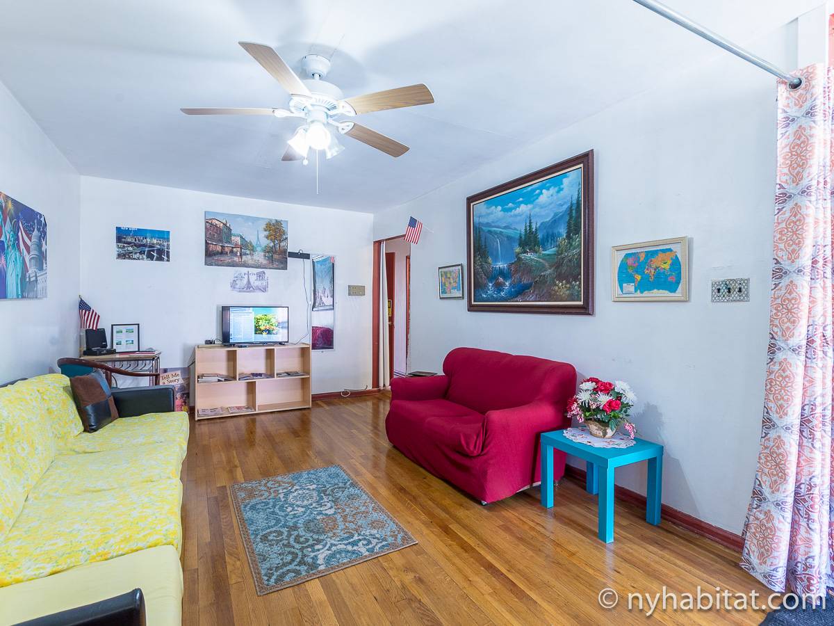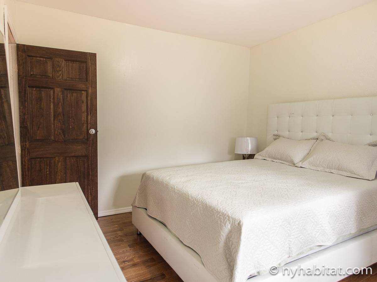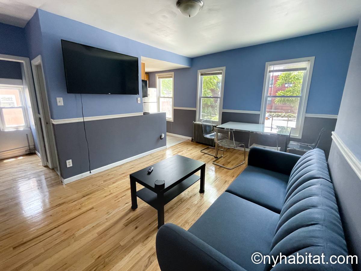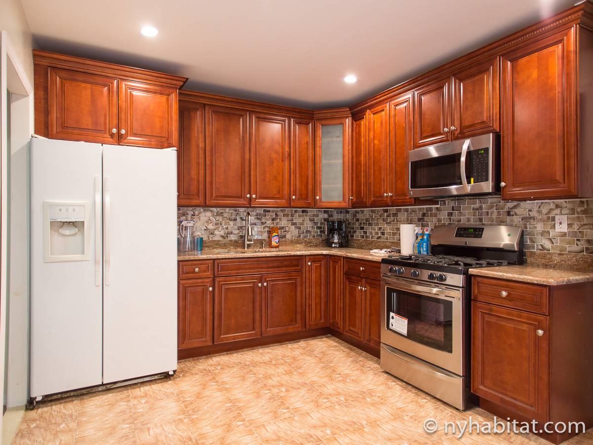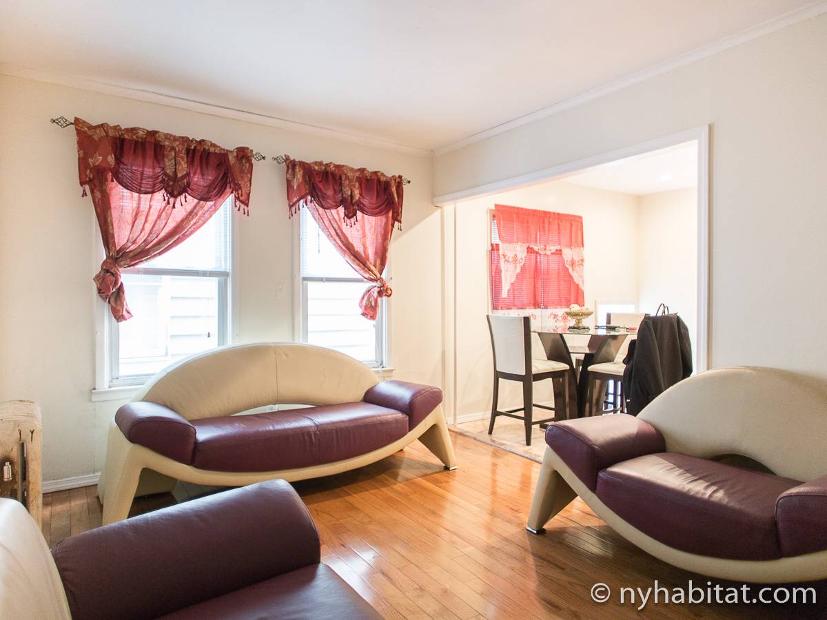 Das Wohnzimmer ist mit Holzfußboden ausgelegt und mit modernen Möbeln, darunter drei Sofas und einem Flachbildfernseher mit Kabelanschluss eingerichtet. In der Küche der möblierten Wohnung finden Sie umlaufende Marmorarbeitsflächen und Küchenschränke aus Mahagoni-Holz sowie einen Kühlschrank mit Gefrierfach, eine Mikrowelle, eine Kaffeemaschine, ein Herd mit Backofen und einen Toaster. Schlafzimmer 1 ist mit einem Queen-Bett und Bettwäsche ausgestattet und verfügt über eine Klimaanlage für die warmen Sommermonate in New York. In Schlafzimmer 2 gibt es ebenfalls ein Queen-Bett mit Bettwäsche und außerdem einen zweitürigen Kleiderschrank.