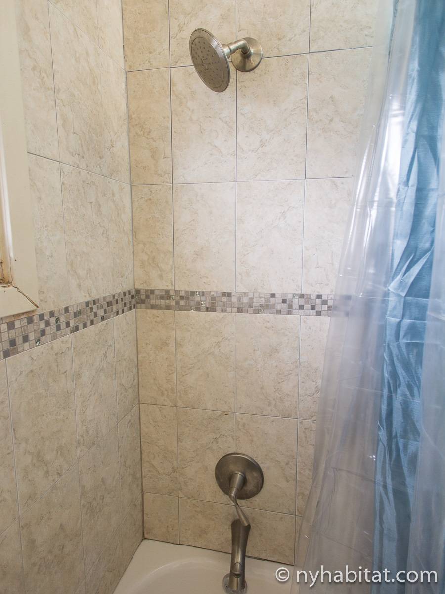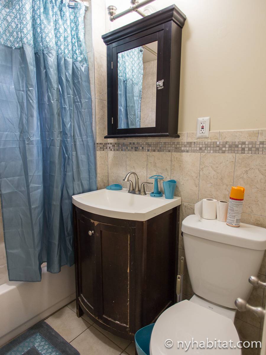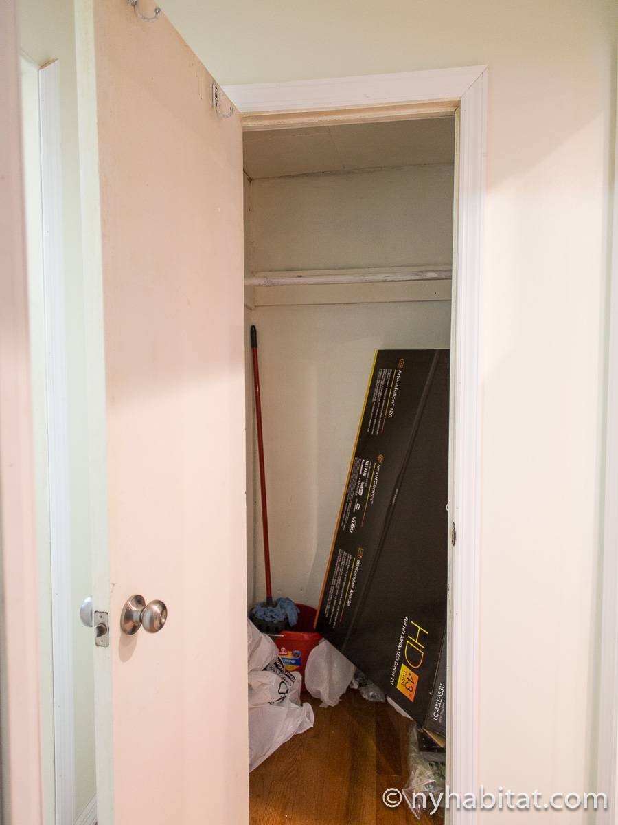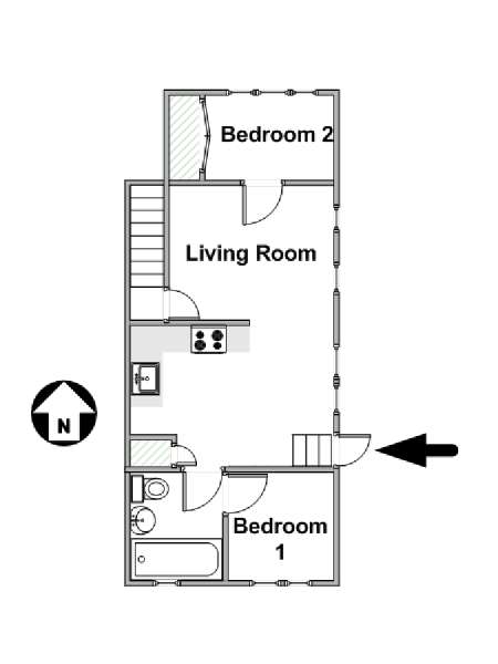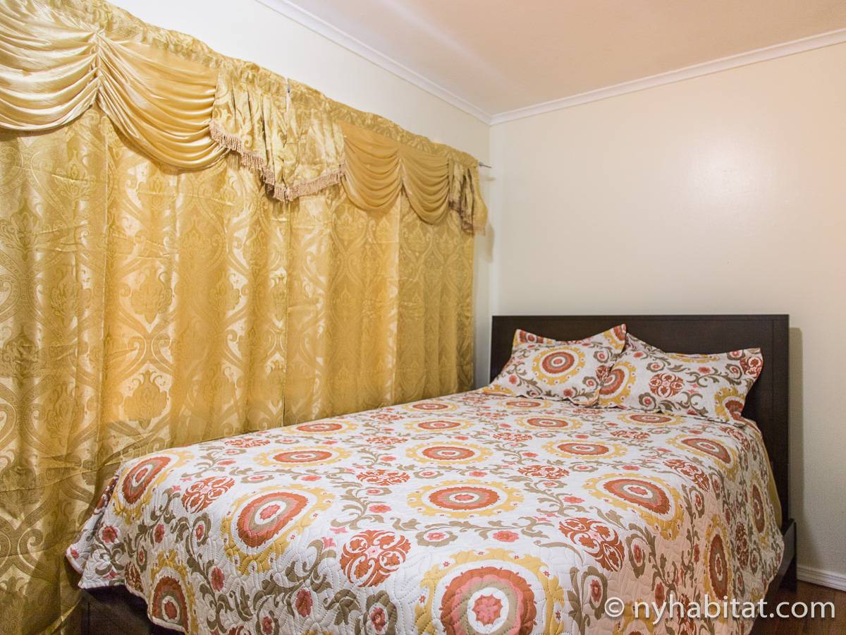 Das Wohnzimmer ist mit Holzfußboden ausgelegt und mit modernen Möbeln, darunter drei Sofas und einem Flachbildfernseher mit Kabelanschluss eingerichtet. In der Küche der möblierten Wohnung finden Sie umlaufende Marmorarbeitsflächen und Küchenschränke aus Mahagoni-Holz sowie einen Kühlschrank mit Gefrierfach, eine Mikrowelle, eine Kaffeemaschine, ein Herd mit Backofen und einen Toaster. Schlafzimmer 1 ist mit einem Queen-Bett und Bettwäsche ausgestattet und verfügt über eine Klimaanlage für die warmen Sommermonate in New York. In Schlafzimmer 2 gibt es ebenfalls ein Queen-Bett mit Bettwäsche und außerdem einen zweitürigen Kleiderschrank.