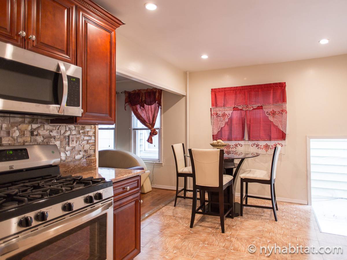 Genießen Sie Brooklyn in dieser voll möblierten 3-Zimmer-Wohnung an der East 98th Street und Avenue M. Die Wohnung liegt im 1. Stock (entspricht in Europa dem Erdgeschoss) eines zweistöckigen Hauses aus dem 19. Jahrhundert und verfügt über einen eingezäunten Garten.