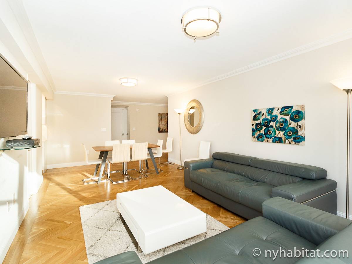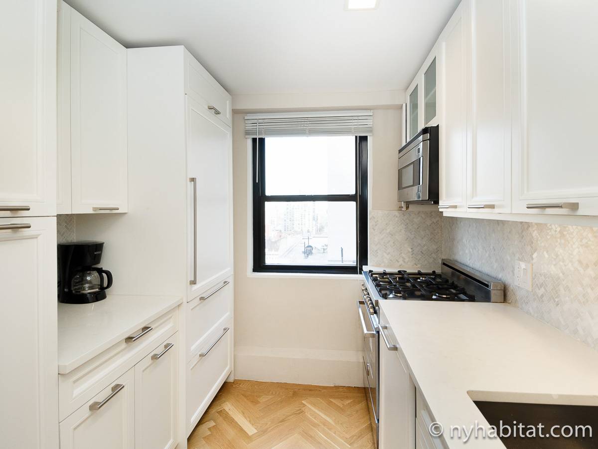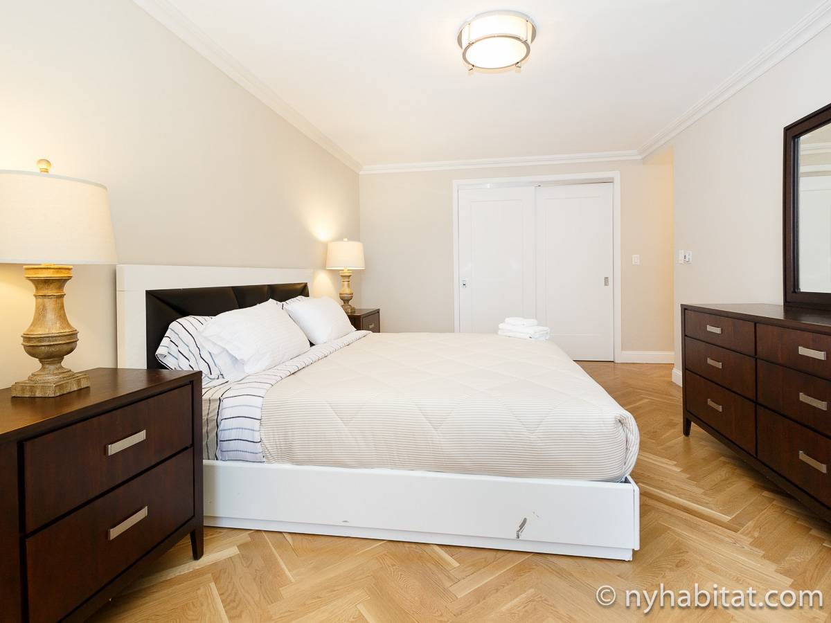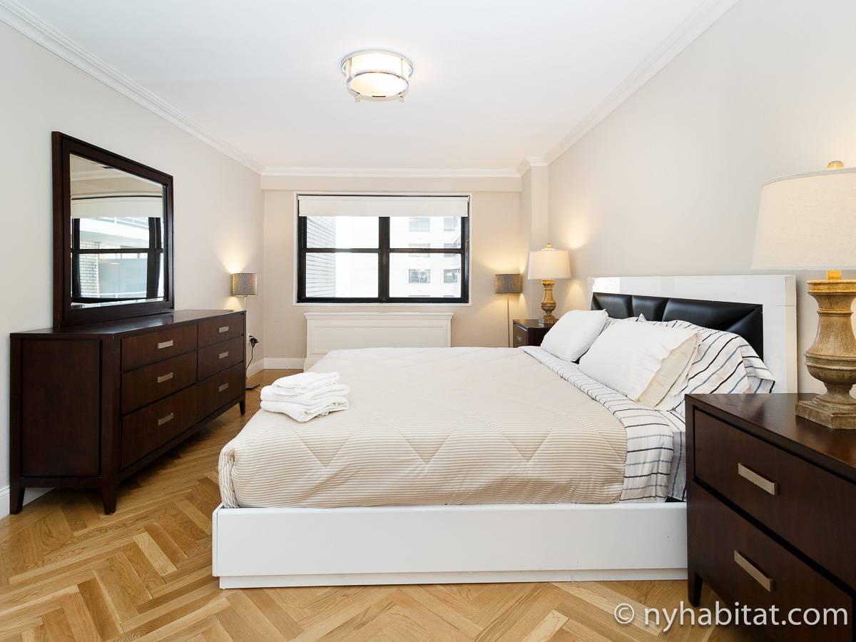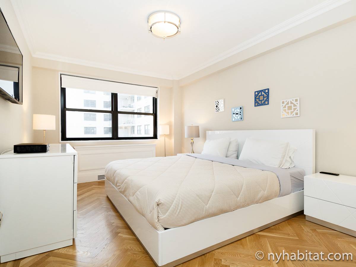 Diese möblierte New Yorker 4-Zimmer-Wohnung verfügt über Parkettböden mit Herringbone-Muster, Deckenleisten und neutral gestrichene Wände, die einen hellen, luftigen Raum kreieren. Die zwei grauen Ledersofas im Wohnzimmer stehen um einen Beistelltisch herum und sind in Richtung des wandmontierten Flatscreen-Fernsehers mit Kabelanschluss ausgerichtet. Am anderen Ende des Wohnzimmers befindet sich ein Esstisch für sechs Personen. Vom Wohnzimmer aus haben Sie Zugang zum Balkon, von dem aus Sie eine fantastische Aussicht auf NYC haben. Die Küche ist mit weißen Schränken und Arbeitsflächen in Weiß und Beige designt und mit Geräten aus Edelstahl ausgestattet. Alles, was Sie brauchen, um daheim zu kochen, ist in der Küche vorhanden, wie zum Beispiel Herd/Backofen, Mikrowelle, Toaster, Kühlschrank und Geschirrspüler. Schlafzimmer 1 bietet Ihnen ein geräumiges Kingsize-Bett, in dem Sie nach einem langen Tag in der Stadt entspannen können. An jeder Seite finden Sie einen Nachttisch aus dunklem Holz, auf dem eine Lampe steht. Eine Kommode mit Spiegel und maßgeschneiderte Kleiderschränke bieten ausreichend Stauraum. Schlafzimmer 2 ist in Weiß dekoriert und verfügt über ein Kingsize-Bett und Nachttische mit Lampen. Ein Flatscreen-Fernseher ist zur Unterhaltung an der Wand montiert. Eine Kommode und ein maßgeschneiderter Kleiderschrank bieten ausreichend Stauraum. Schlafzimmer 3 ist mit einem Doppelbett und einem Kleiderschrank, in dem Sie Ihre Habseligkeiten verstauen können, ausgestattet. Das erste Badezimmer hat helle Fliesenwände und ist mit einem Spiegelschrank und einer Dusche mit Glaswänden eingerichtet, während das erste Badezimmer Ihnen eine Badewanne mit Duschkopf bietet. Eine Waschmaschine und ein Trockner sind, praktisch aufeinander gestapelt, in einem Schrank in der Wohnung versteckt.