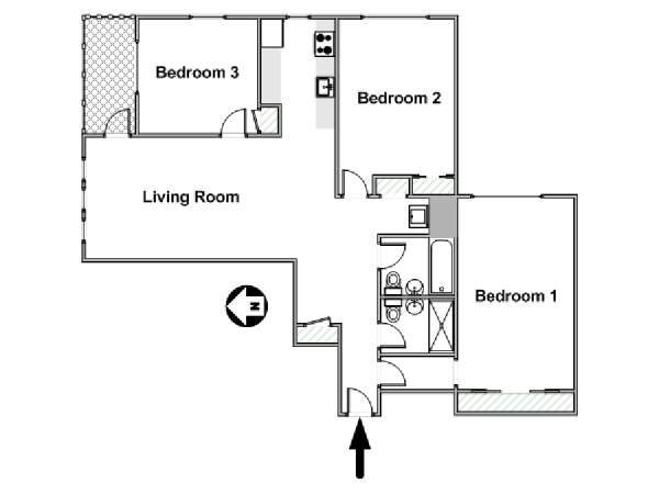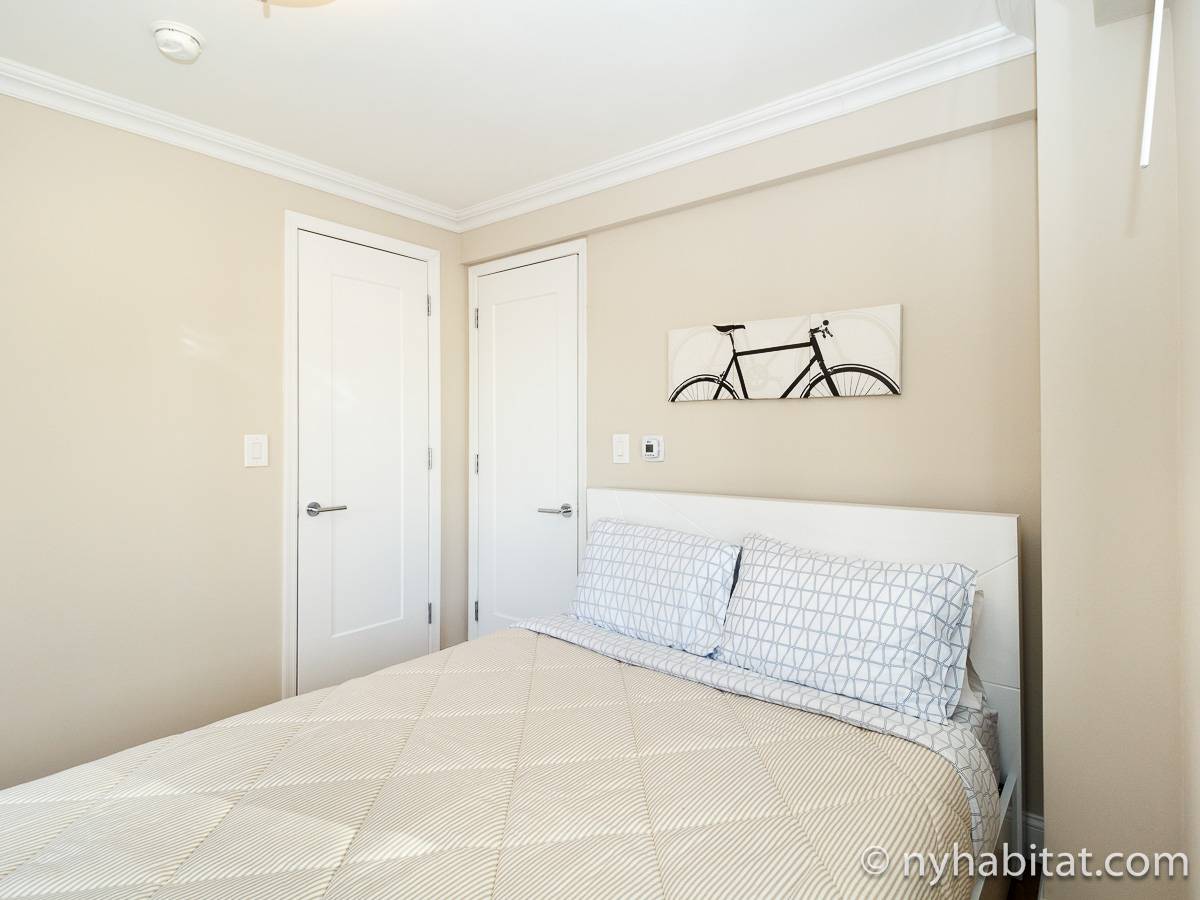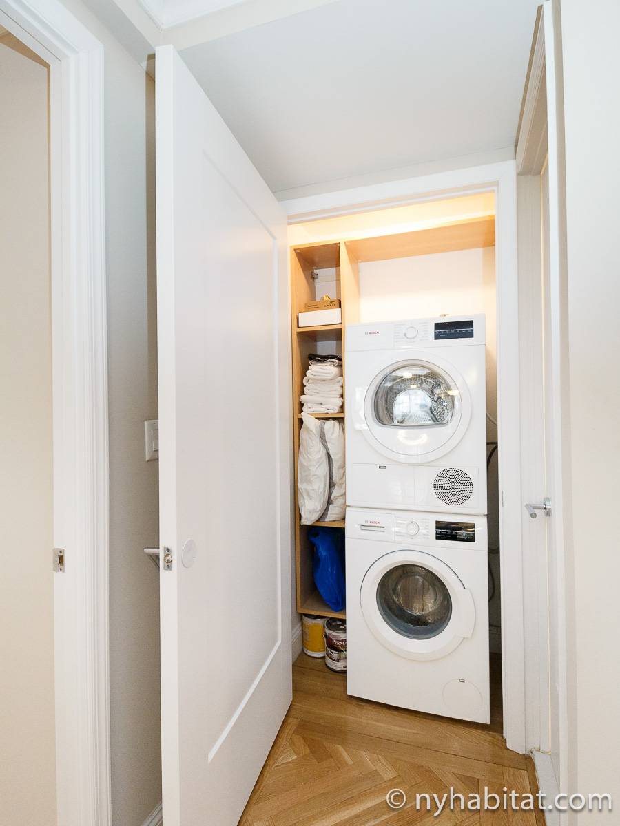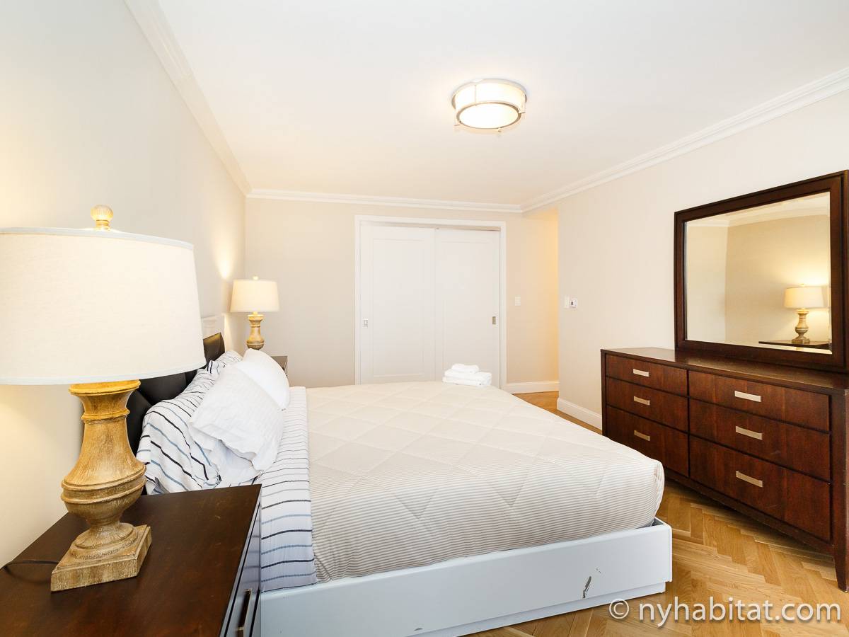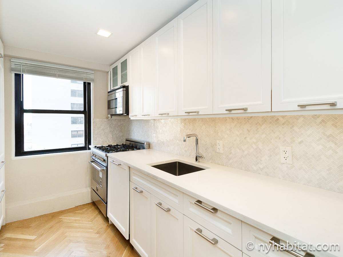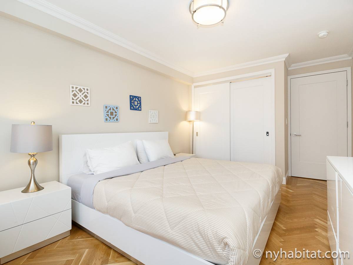 Diese möblierte New Yorker 4-Zimmer-Wohnung verfügt über Parkettböden mit Herringbone-Muster, Deckenleisten und neutral gestrichene Wände, die einen hellen, luftigen Raum kreieren. Die zwei grauen Ledersofas im Wohnzimmer stehen um einen Beistelltisch herum und sind in Richtung des wandmontierten Flatscreen-Fernsehers mit Kabelanschluss ausgerichtet. Am anderen Ende des Wohnzimmers befindet sich ein Esstisch für sechs Personen. Vom Wohnzimmer aus haben Sie Zugang zum Balkon, von dem aus Sie eine fantastische Aussicht auf NYC haben. Die Küche ist mit weißen Schränken und Arbeitsflächen in Weiß und Beige designt und mit Geräten aus Edelstahl ausgestattet. Alles, was Sie brauchen, um daheim zu kochen, ist in der Küche vorhanden, wie zum Beispiel Herd/Backofen, Mikrowelle, Toaster, Kühlschrank und Geschirrspüler. Schlafzimmer 1 bietet Ihnen ein geräumiges Kingsize-Bett, in dem Sie nach einem langen Tag in der Stadt entspannen können. An jeder Seite finden Sie einen Nachttisch aus dunklem Holz, auf dem eine Lampe steht. Eine Kommode mit Spiegel und maßgeschneiderte Kleiderschränke bieten ausreichend Stauraum. Schlafzimmer 2 ist in Weiß dekoriert und verfügt über ein Kingsize-Bett und Nachttische mit Lampen. Ein Flatscreen-Fernseher ist zur Unterhaltung an der Wand montiert. Eine Kommode und ein maßgeschneiderter Kleiderschrank bieten ausreichend Stauraum. Schlafzimmer 3 ist mit einem Doppelbett und einem Kleiderschrank, in dem Sie Ihre Habseligkeiten verstauen können, ausgestattet. Das erste Badezimmer hat helle Fliesenwände und ist mit einem Spiegelschrank und einer Dusche mit Glaswänden eingerichtet, während das erste Badezimmer Ihnen eine Badewanne mit Duschkopf bietet. Eine Waschmaschine und ein Trockner sind, praktisch aufeinander gestapelt, in einem Schrank in der Wohnung versteckt.