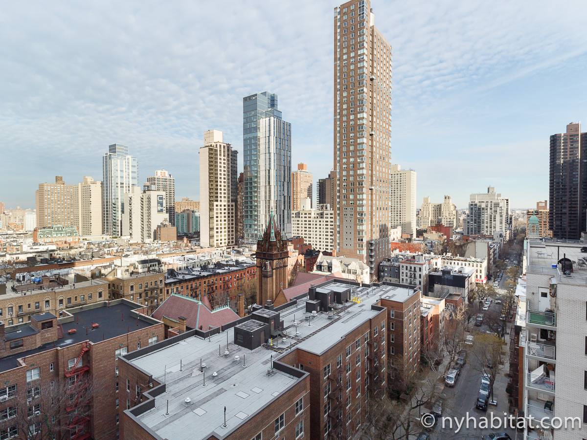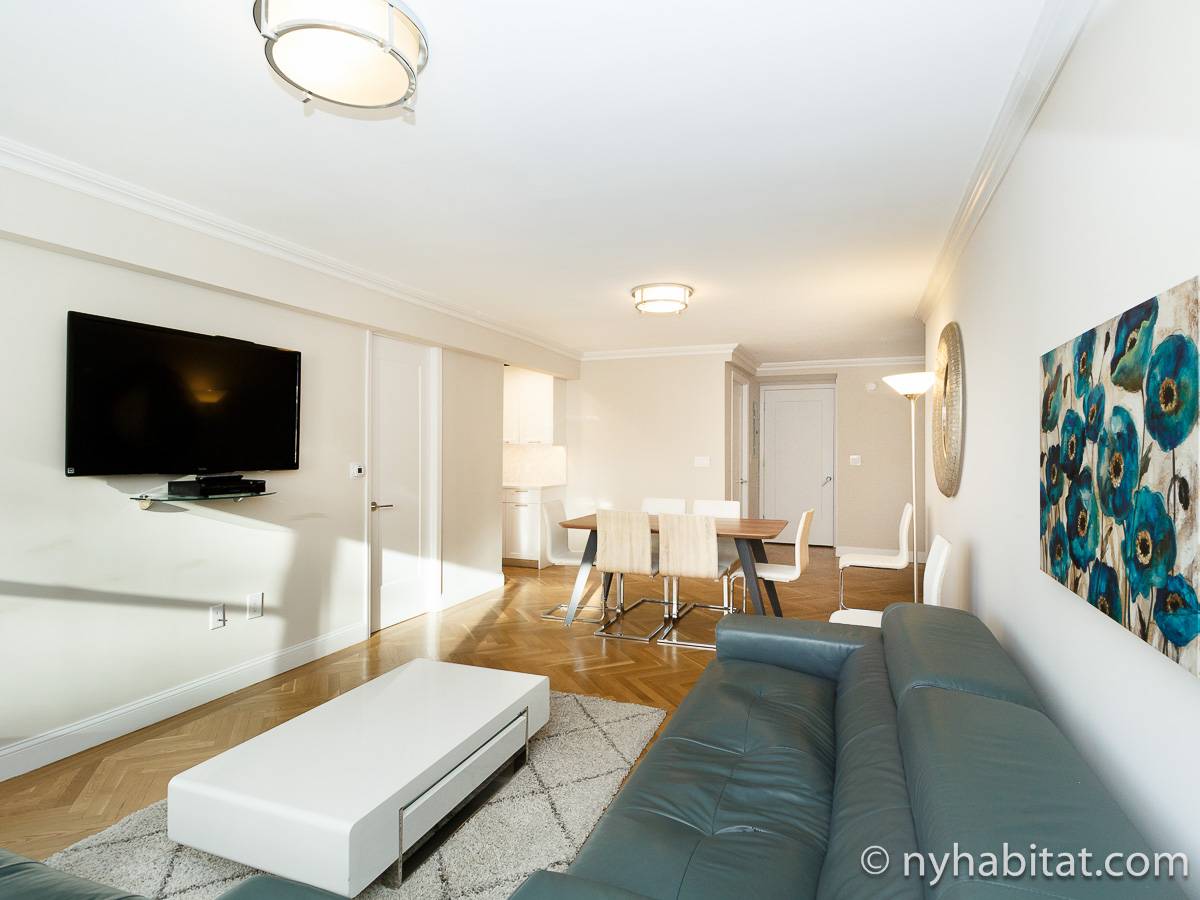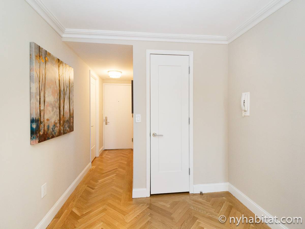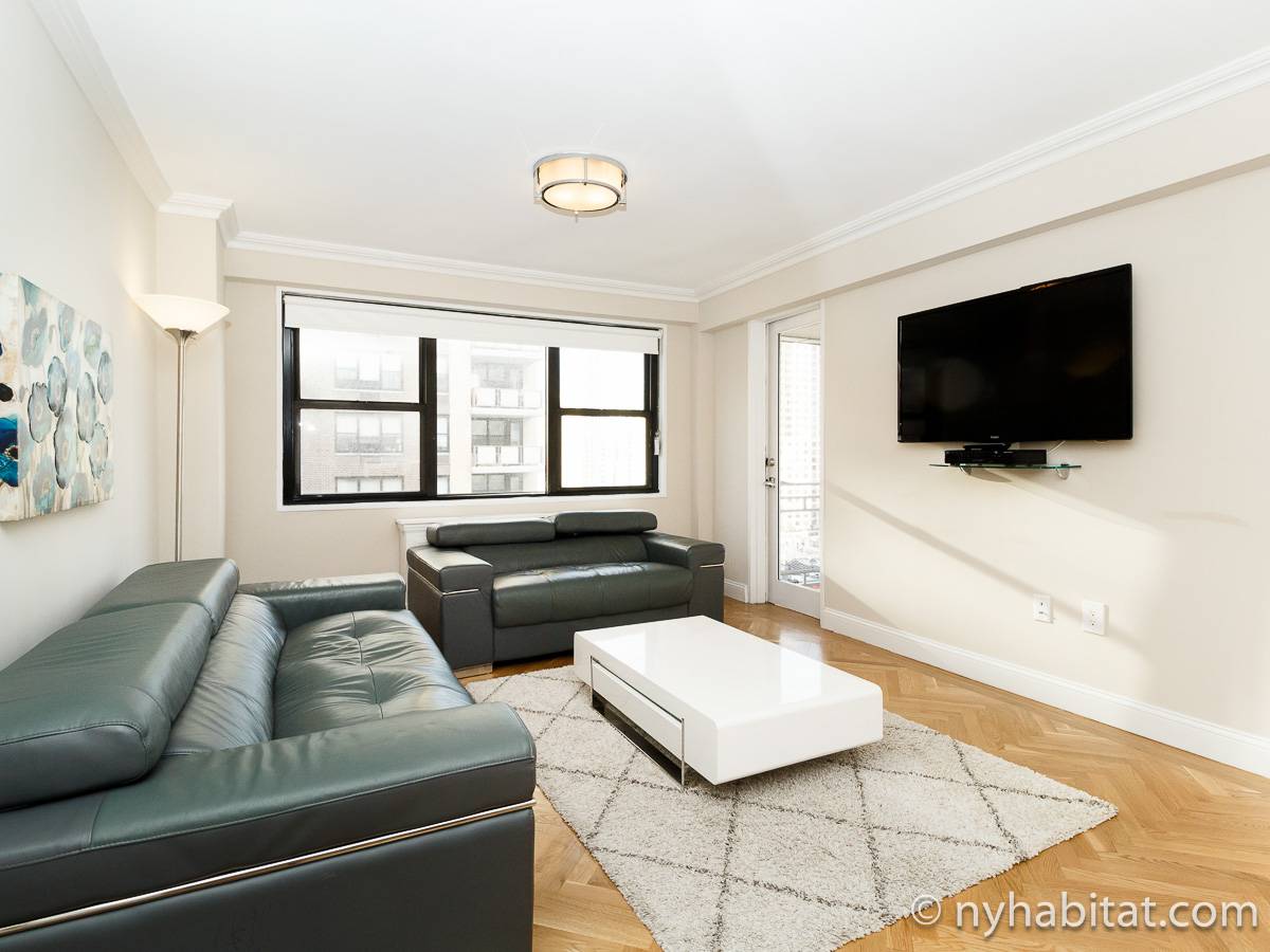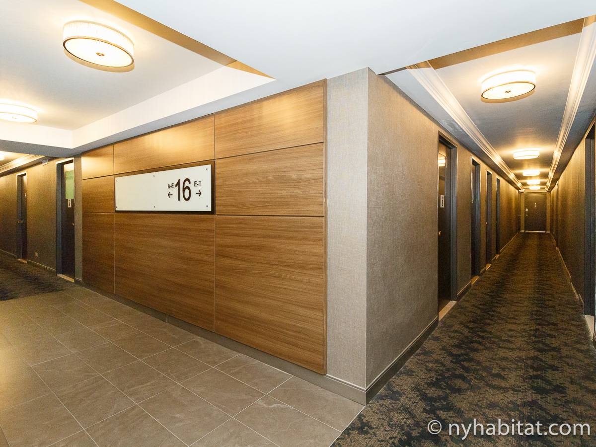 Diese möblierte 4-Zimmer-Mietwohnung mit zwei Badezimmern befindet sich im 16. Stock (entspricht in Europa dem 15. Stock) eines Hochhauses mit Aufzug und 24-Stunden-Portier, welches nahe der East 86th Street & 2nd Avenue in der Upper East Side von Manhattan liegt. Das Gebäude verfügt über eine Luxusausstattung, welche ein Fitnesscenter und ein Hallenbad beinhaltet.