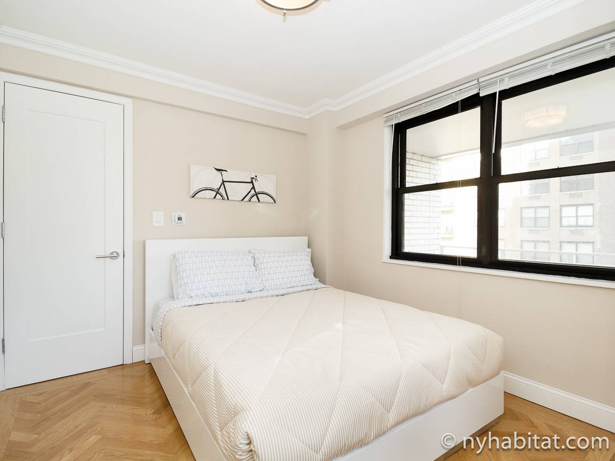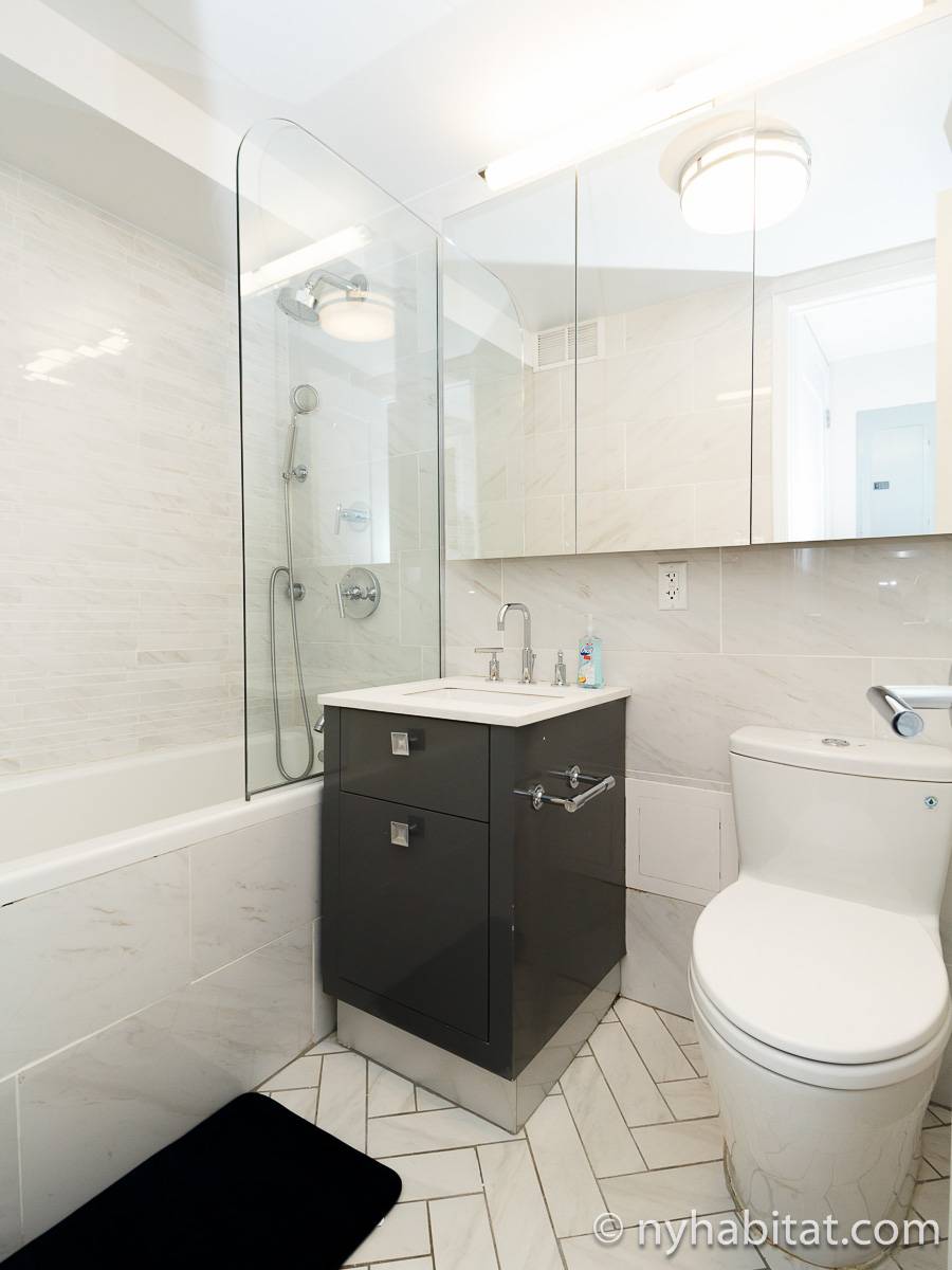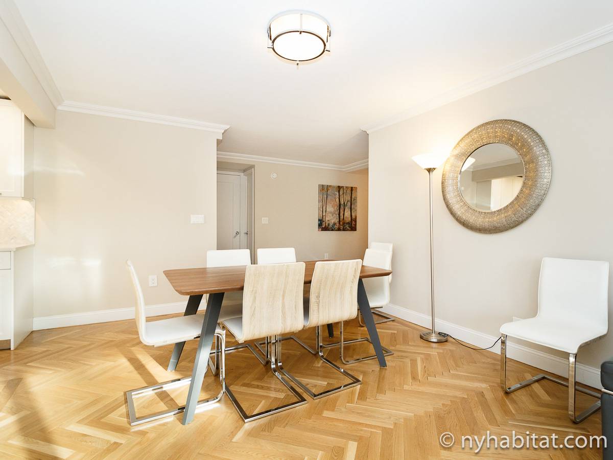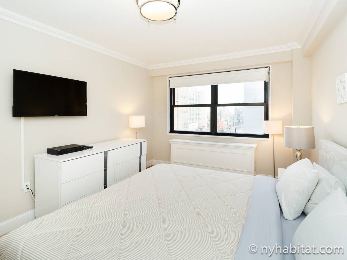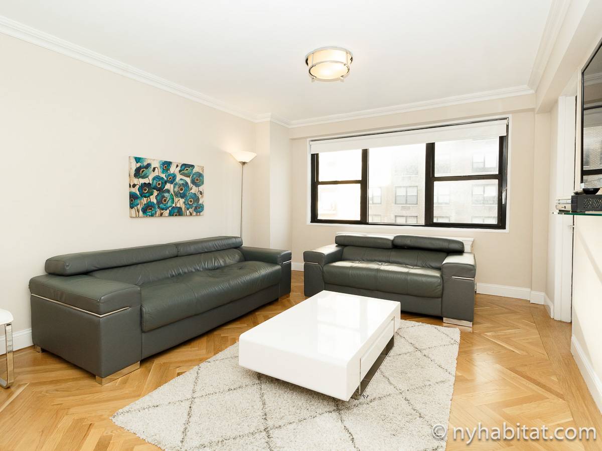 Diese möblierte 4-Zimmer-Mietwohnung mit zwei Badezimmern befindet sich im 16. Stock (entspricht in Europa dem 15. Stock) eines Hochhauses mit Aufzug und 24-Stunden-Portier, welches nahe der East 86th Street & 2nd Avenue in der Upper East Side von Manhattan liegt. Das Gebäude verfügt über eine Luxusausstattung, welche ein Fitnesscenter und ein Hallenbad beinhaltet.