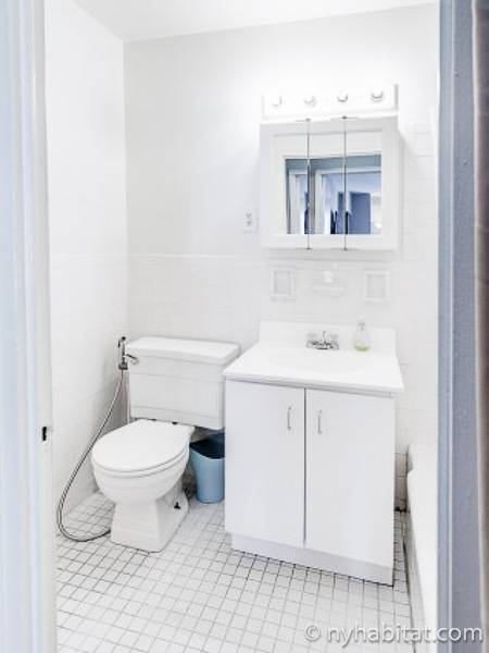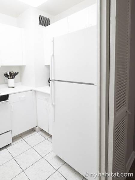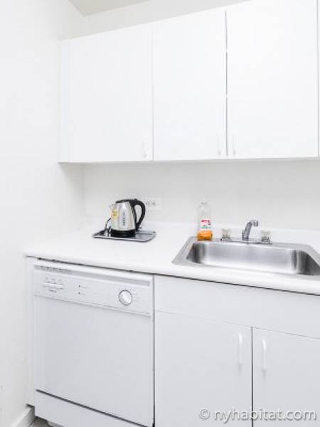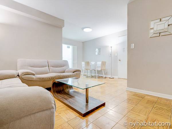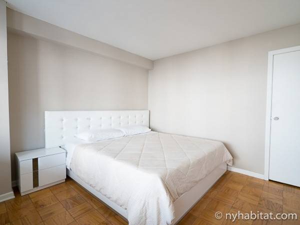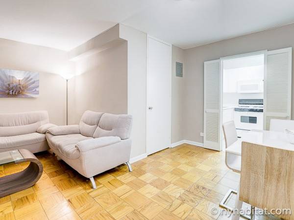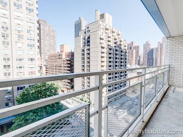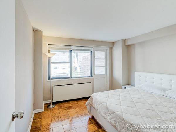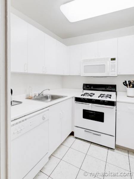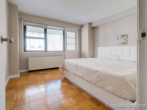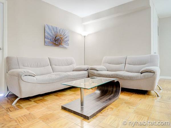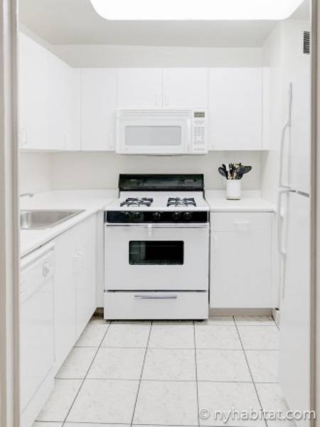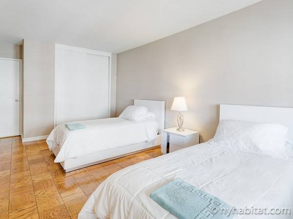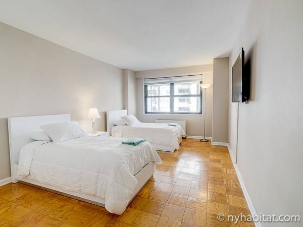 Diese möblierte New Yorker 3-Zimmer-Wohnung ist in neutralen Erdtönen gehalten und besitzt Parkettböden, viele Fenster und einen eigenen Balkon. Im Wohnzimmer finden Sie ein bequemes Sofa und ein Zweiersofa mit Couchtisch sowie einen Flachbildschirm mit Kabelanschluss, der Sie bei einem gemütlichen Abend zu Hause unterhält. Am anderen Ende des Wohnzimmers steht ein Esstisch, an dem Sie selbstgekochte Mahlzeiten genießen können und Sie haben auch Zugang zum privaten Außenbereich der Wohnung, wo Sie die frische Luft und die Aussicht auf die Stadt genießen können. Die Küche ist durch Schwingtüren vom Wohnzimmer getrennt und ganz in Weiß gehalten, mit weißen Küchenschränken, Granitarbeitsplatten und Geräten wie einem Herd mit Backofen, einer Mikrowelle, einem Kühlschrank und einer Spülmaschine. Schlafzimmer 1 verfügt über ein geräumiges Kingsize-Bett und einen Nachttisch. Schlafzimmer 2 besteht aus zwei Einzelbetten, einem Nachttisch und einem Flachbildfernseher zur Unterhaltung. Das ganz in weiß geflieste Marmorbad enthält sowohl eine Badewanne als auch eine Dusche. Im Gebäude gibt es auch eine Waschküche.