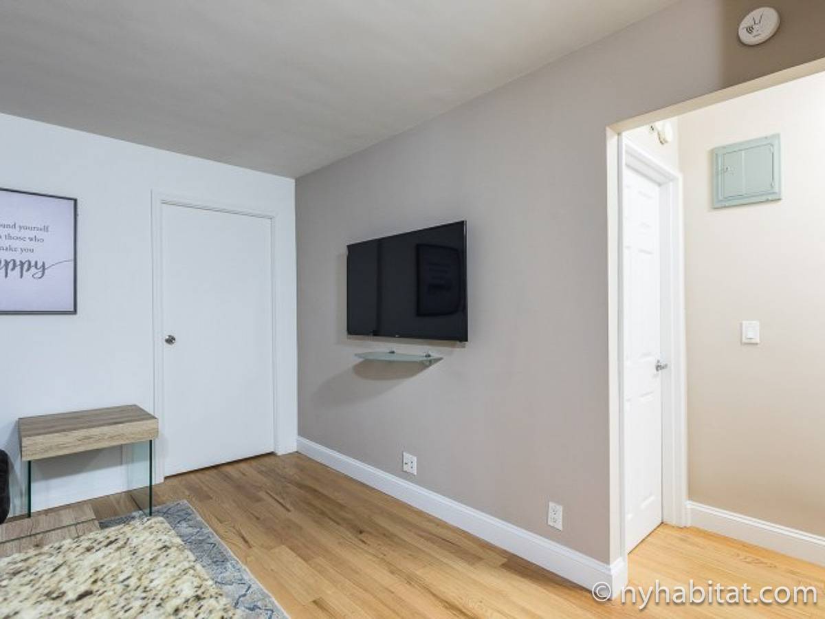 Das 13 m² große Wohnzimmer der Wohnungsvermietung verfügt über eine moderne Einrichtung, Klimaanlage, ein Sofa und einen wandmontierten Fernseher mit Kabelanschluss.
