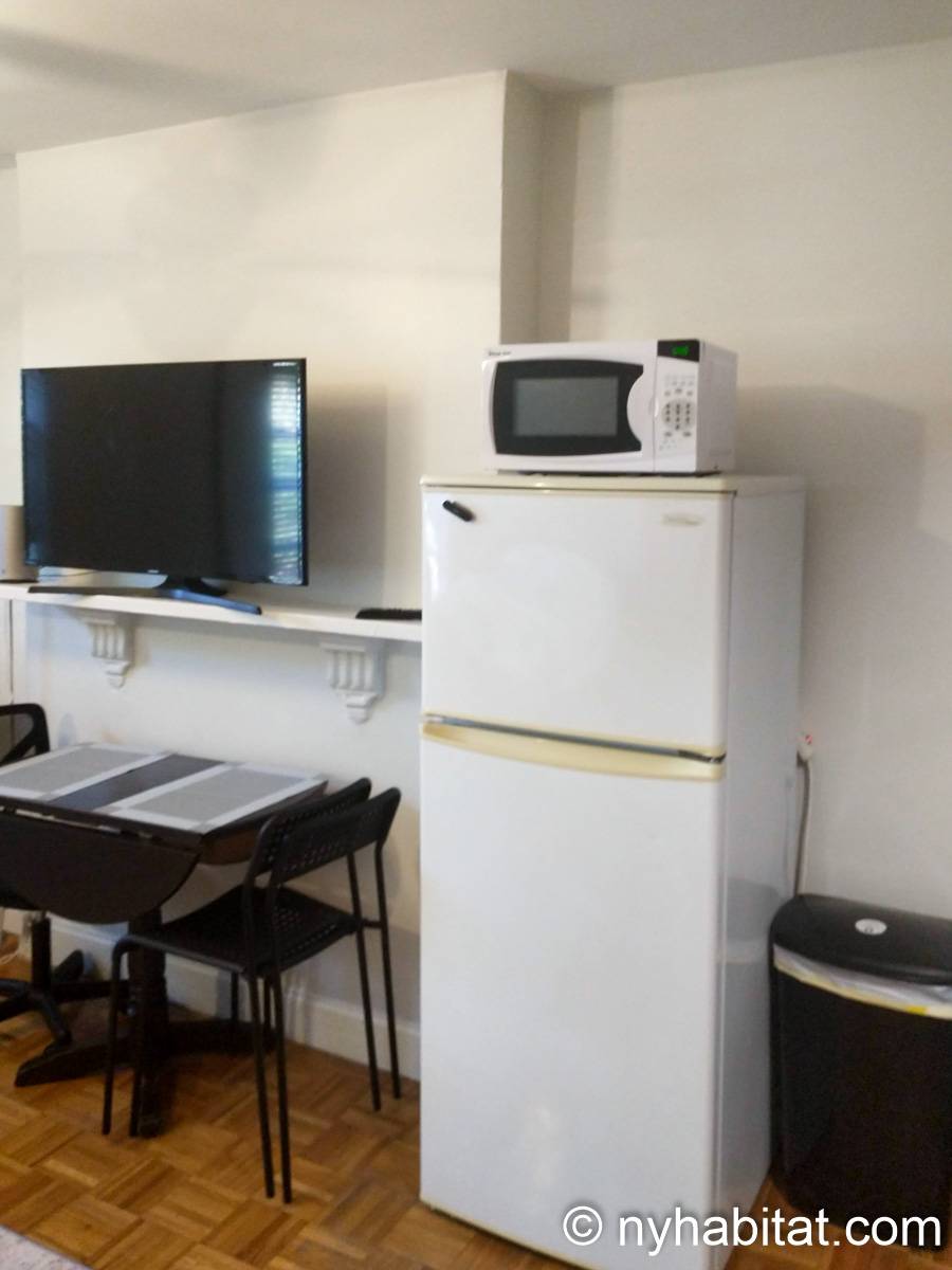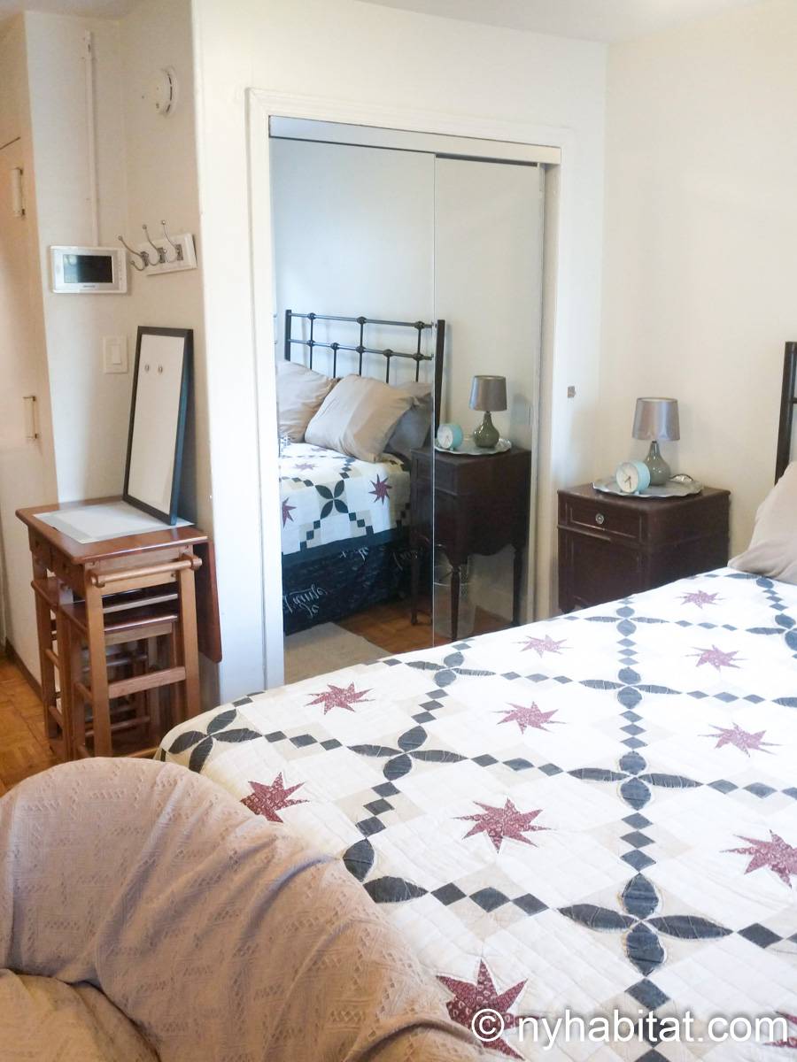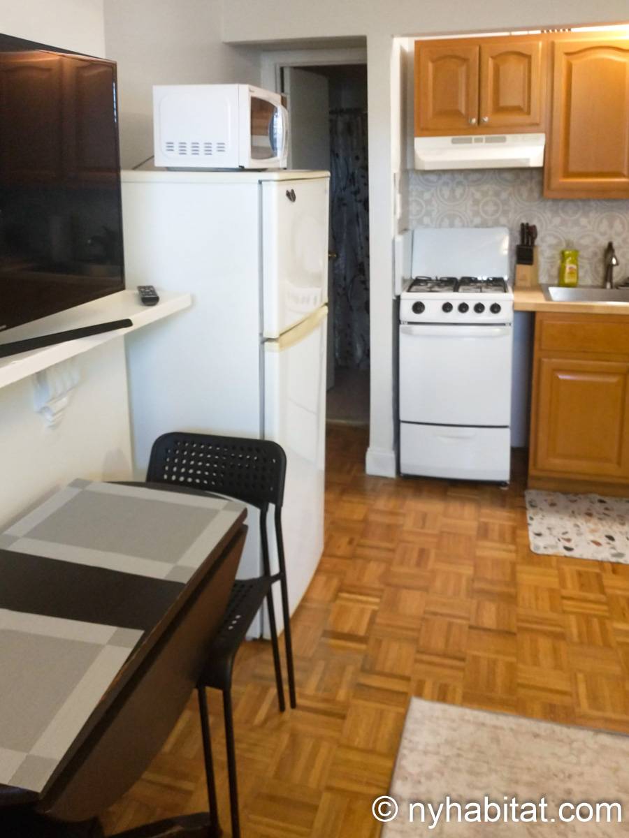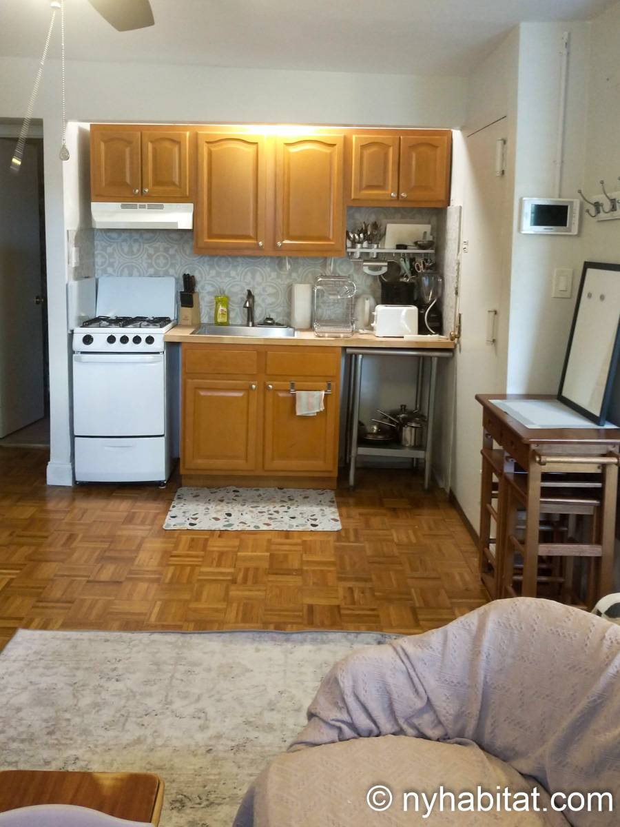Die möblierte Wohnungsvermietung in New York City bietet alles Notwendige, damit Sie sich sofort in Brooklyn heimisch fühlen. Die Wohnung verfügt über einen Parkettboden und Fenster Richtung Norden mit Blick auf die von Bäumen umgebene Straße. Nutzen Sie das Doppelbett, welches bei zwei Fenstern liegt. Neben dem Bett befinden sich Nachttische und ein Schrank für Stauraum. Eine Kommode mit Spiegel bietet sogar zusätzlichen Stauraum falls benötigt. Entspannen Sie sich dank des Sofas, Couchtisches und Flachbildfernsehers. Nutzen Sie den Esstisch samt Stühlen zum Essen Ihrer Gerichte. Die offene Küche verfügt über helle Holzschränke, Elektrogeräte und alles Notwendige zum Kochen. Das Badezimmer bietet eine Duschbadewanne, Toilette, ein Waschbecken und einen Spiegel.