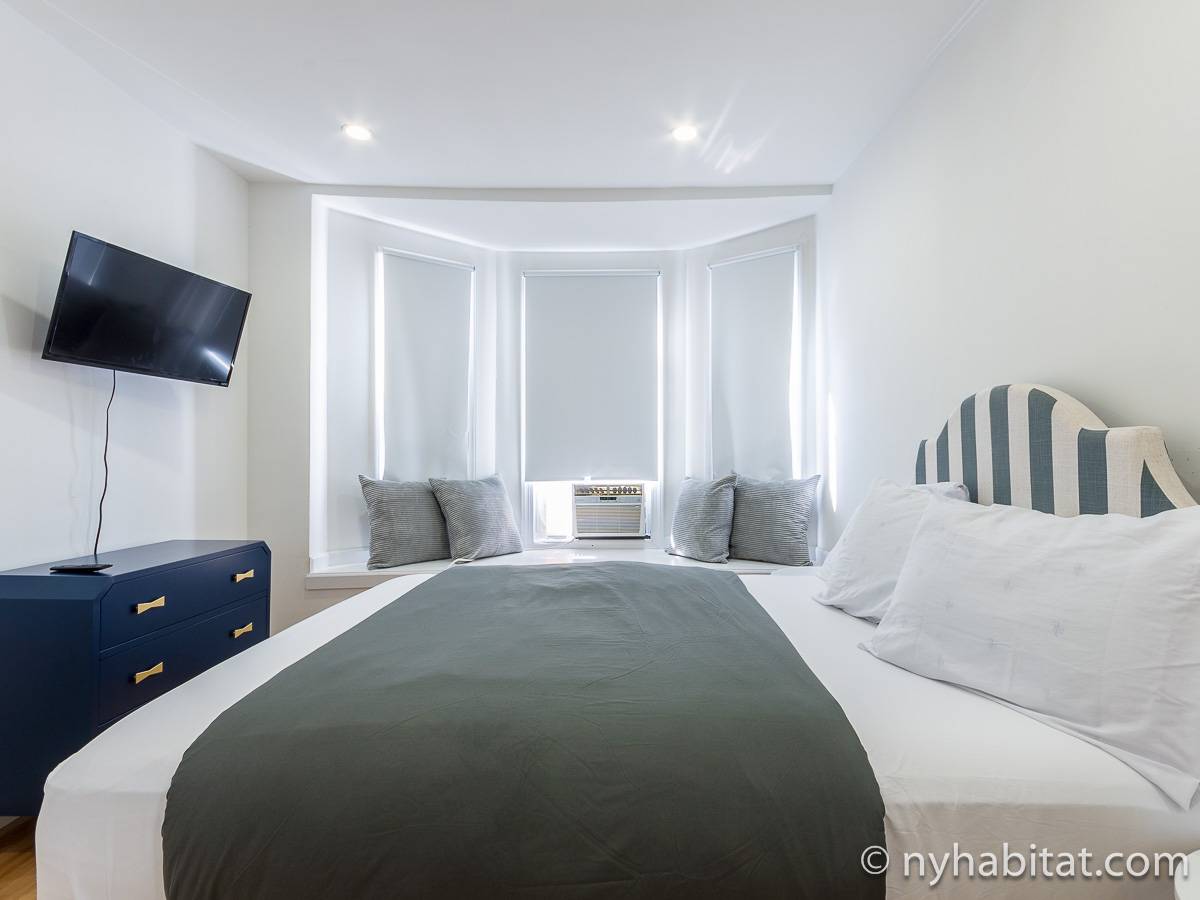 • Das Schlafzimmer 1: Queensize-Bett, Flachbildfernseher, Kleiderschrank, Klimaanlage und Fenster.