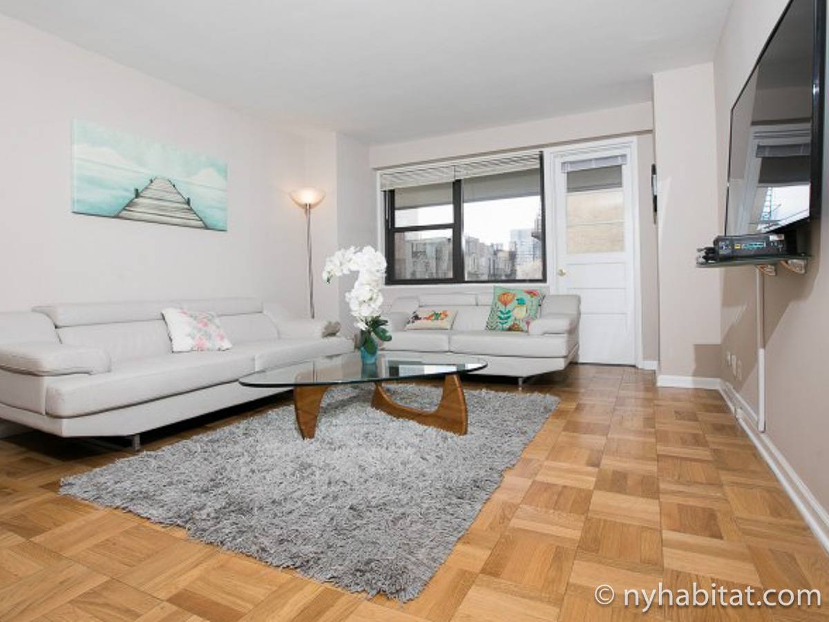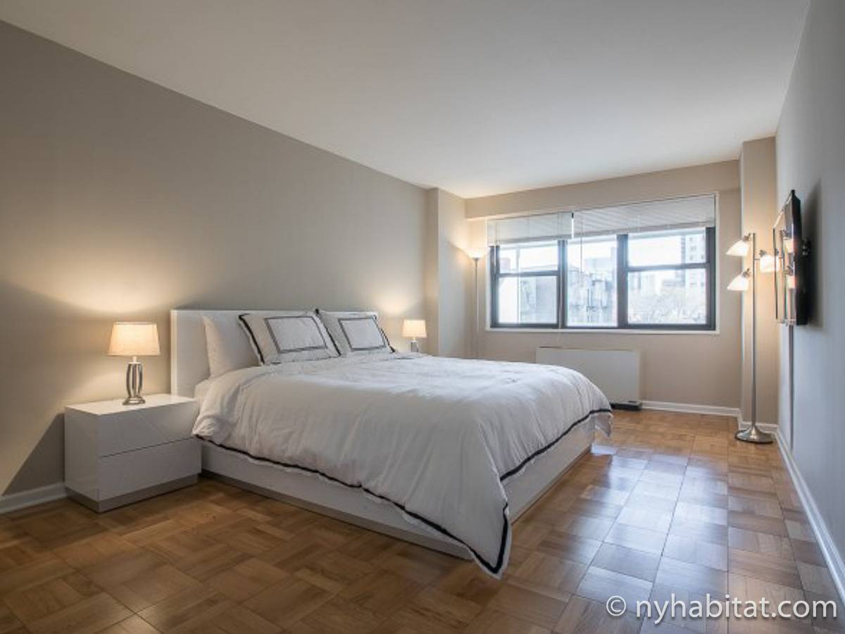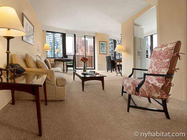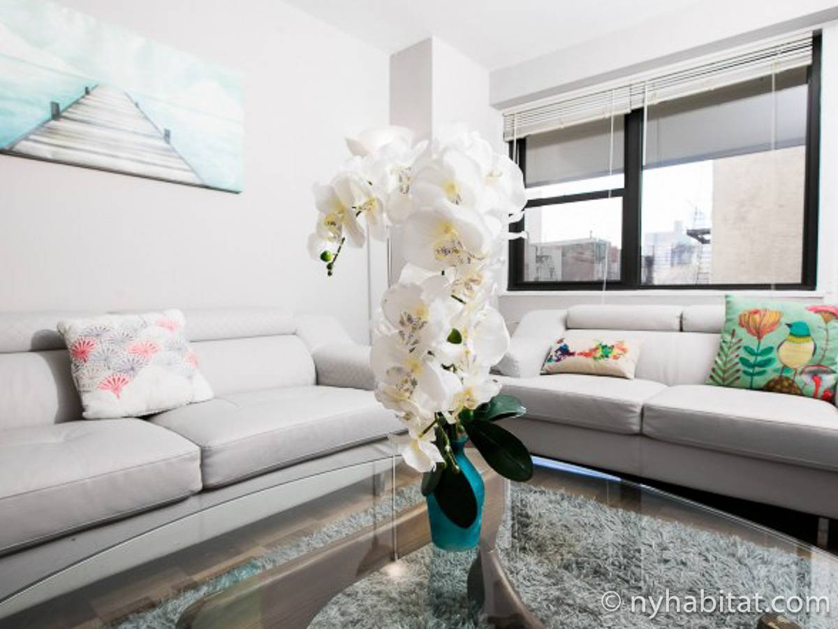 Im zeitgenössisch eingerichteten Wohnzimmer bieten die beiden Sofas und ein Couchtisch Platz für Ihre Snacks beim Fernsehen, während der Esstisch Ihnen Platz zum Genießen Ihrer Mahlzeiten bietet. Wenn Sie Ihr Abendessen zu Hause zubereiten möchten, stehen Ihnen als Küchengeräte ein Herd mit Backofen, eine Mikrowelle, ein Toaster, ein Kühlschrank, ein Gefrierschrank und ein Geschirrspüler zur Verfügung. In dieser 3-Zimmer-Wohnung gibt es auch eine Kaffeemaschine, falls Sie Ihren Morgenkaffee draußen auf dem Balkon genießen möchten. Der Balkon liegt neben dem Wohnzimmer und bietet Aussicht auf die Stadtlandschaft von New York City. Beide Schlafzimmer in dieser Mietwohnung verfügen über je ein Bett in Queen-Größe, zwei Nachttische und einen Fernseher. Es gibt auch zwei Badezimmer mit jeweils einer Dusche und einer Badewanne.