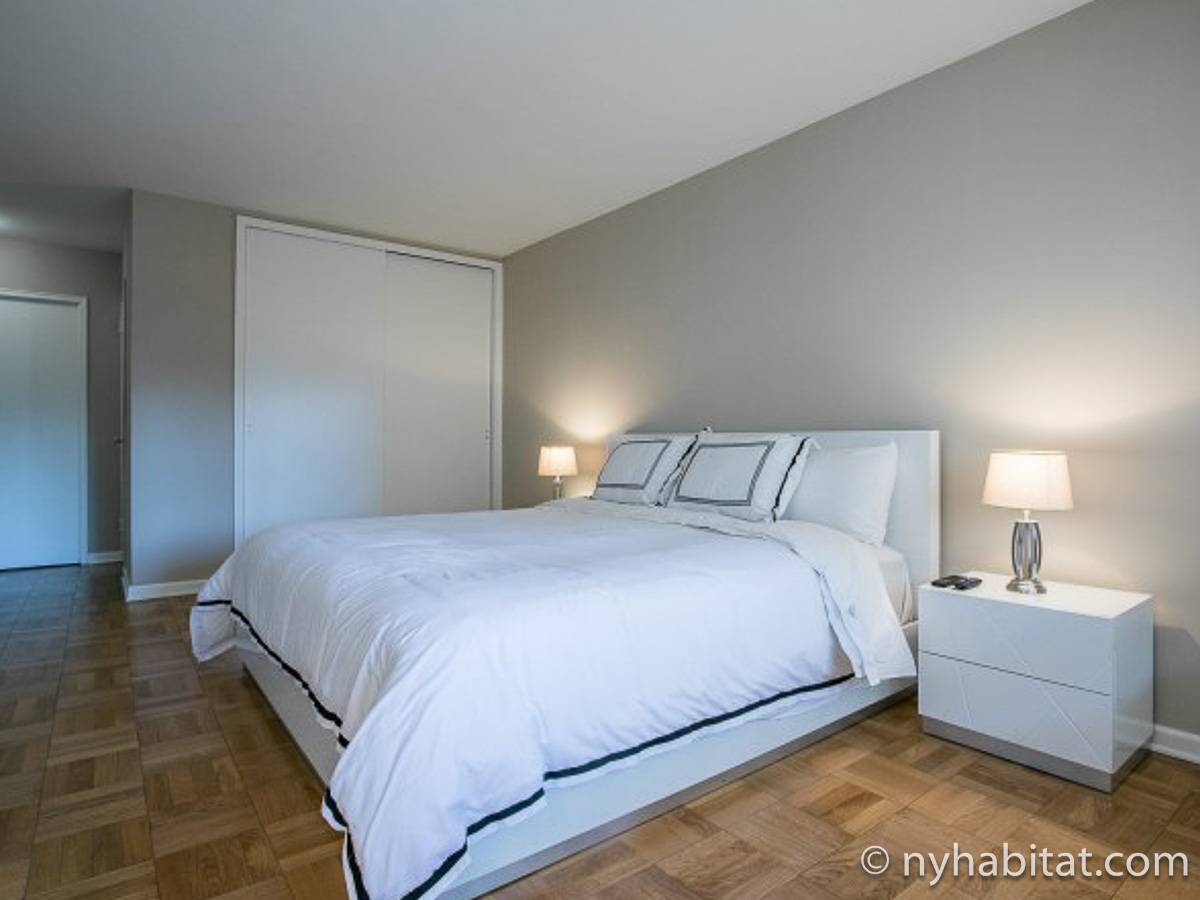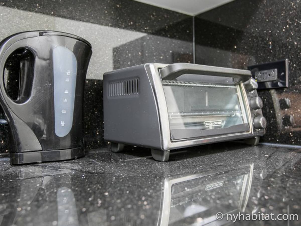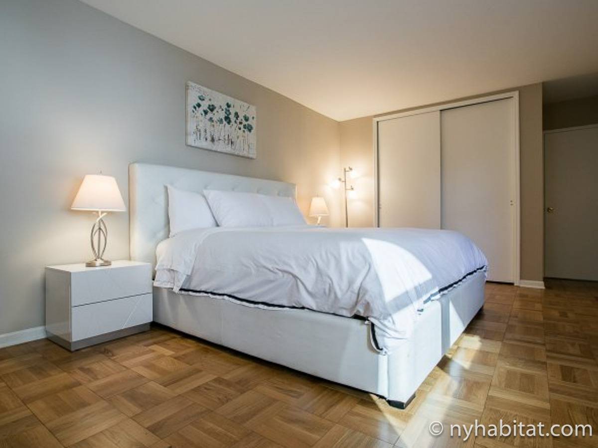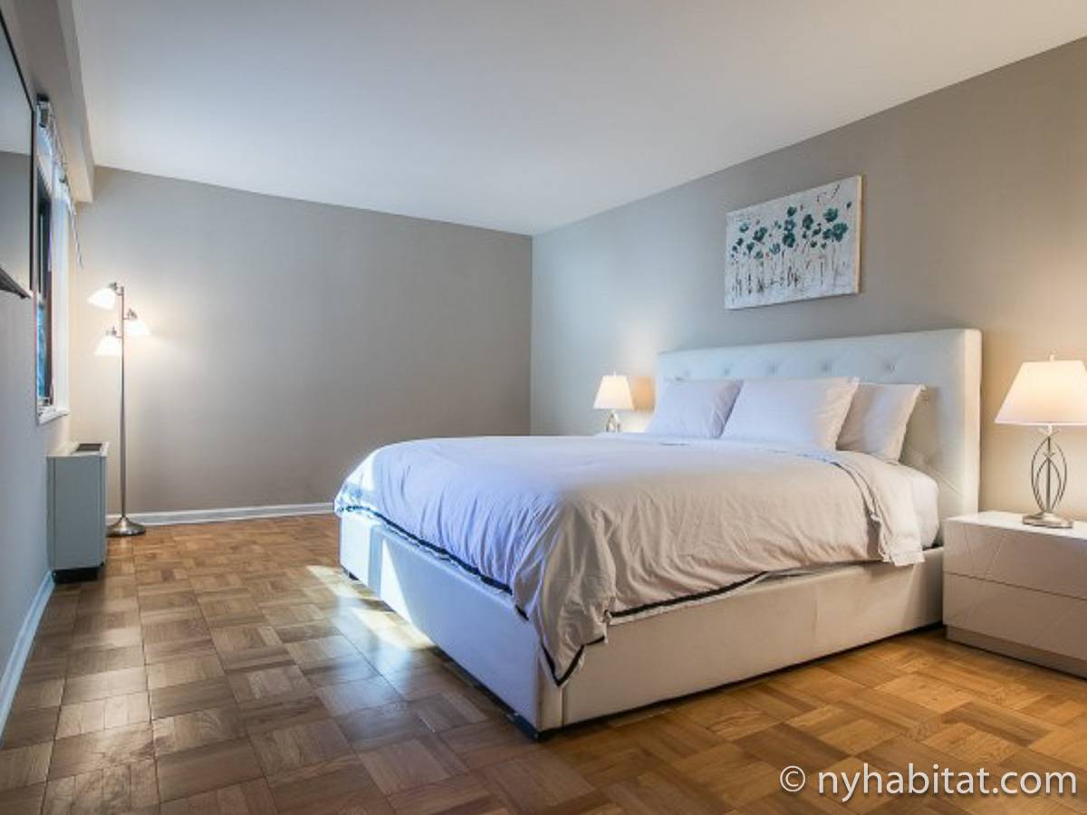 Im zeitgenössisch eingerichteten Wohnzimmer bieten die beiden Sofas und ein Couchtisch Platz für Ihre Snacks beim Fernsehen, während der Esstisch Ihnen Platz zum Genießen Ihrer Mahlzeiten bietet. Wenn Sie Ihr Abendessen zu Hause zubereiten möchten, stehen Ihnen als Küchengeräte ein Herd mit Backofen, eine Mikrowelle, ein Toaster, ein Kühlschrank, ein Gefrierschrank und ein Geschirrspüler zur Verfügung. In dieser 3-Zimmer-Wohnung gibt es auch eine Kaffeemaschine, falls Sie Ihren Morgenkaffee draußen auf dem Balkon genießen möchten. Der Balkon liegt neben dem Wohnzimmer und bietet Aussicht auf die Stadtlandschaft von New York City. Beide Schlafzimmer in dieser Mietwohnung verfügen über je ein Bett in Queen-Größe, zwei Nachttische und einen Fernseher. Es gibt auch zwei Badezimmer mit jeweils einer Dusche und einer Badewanne.
