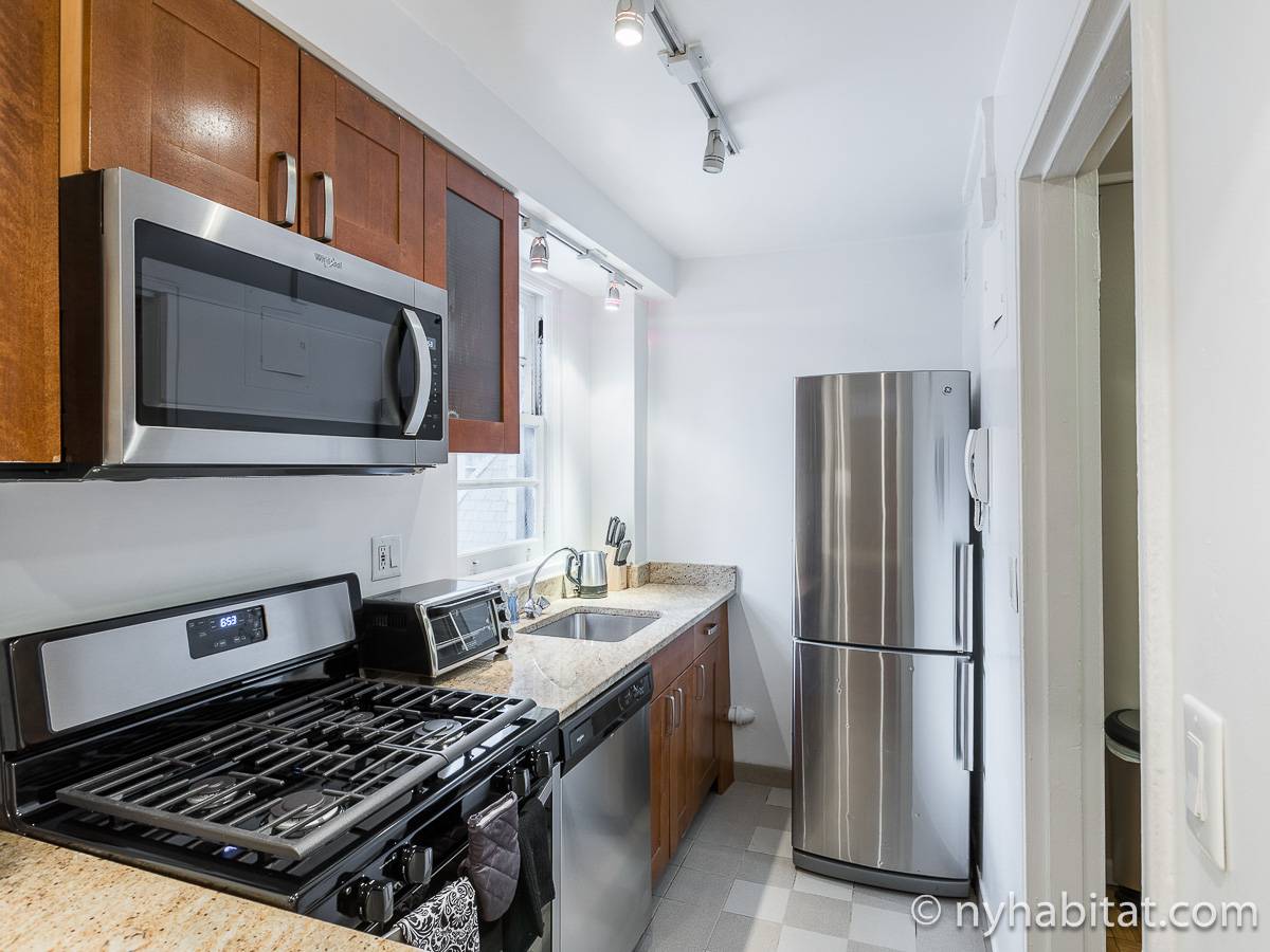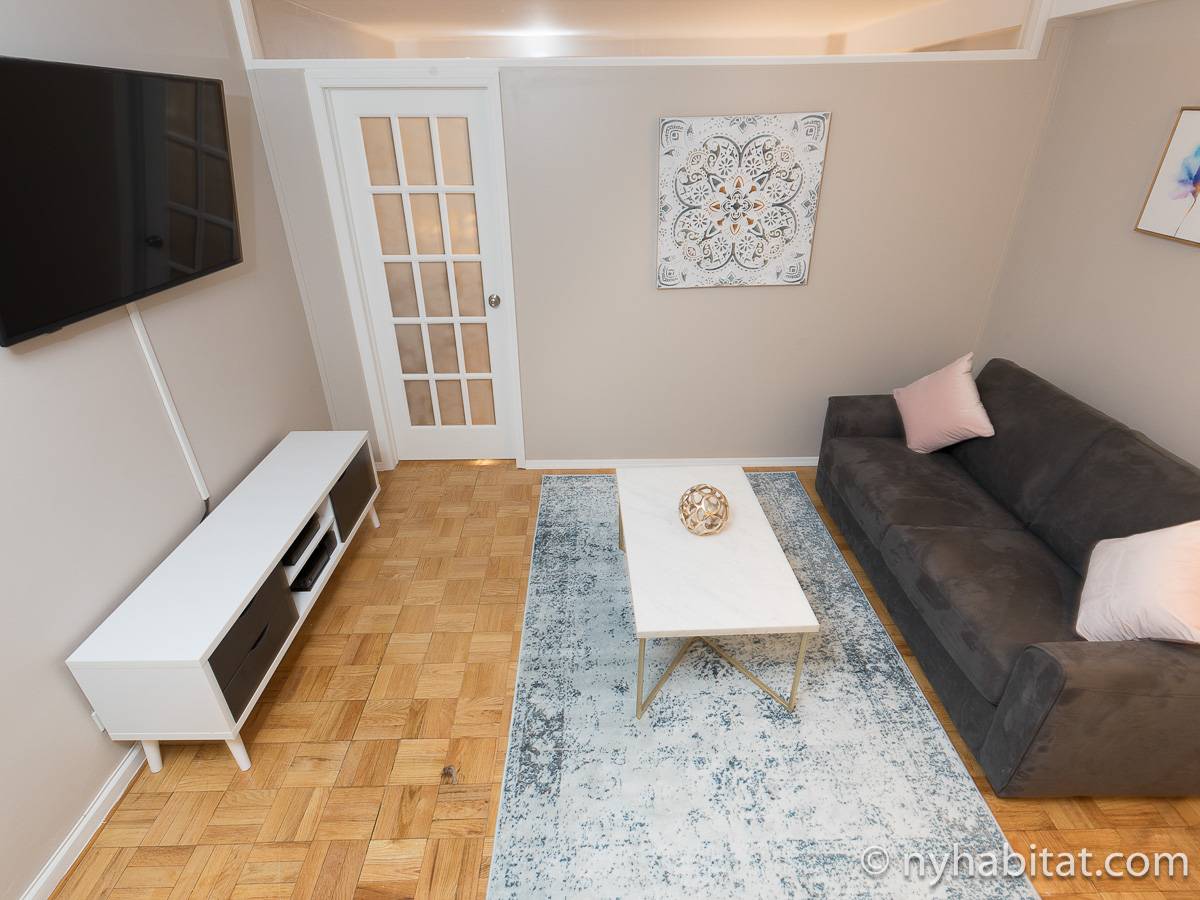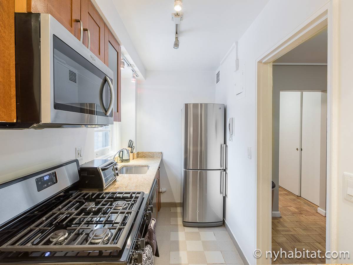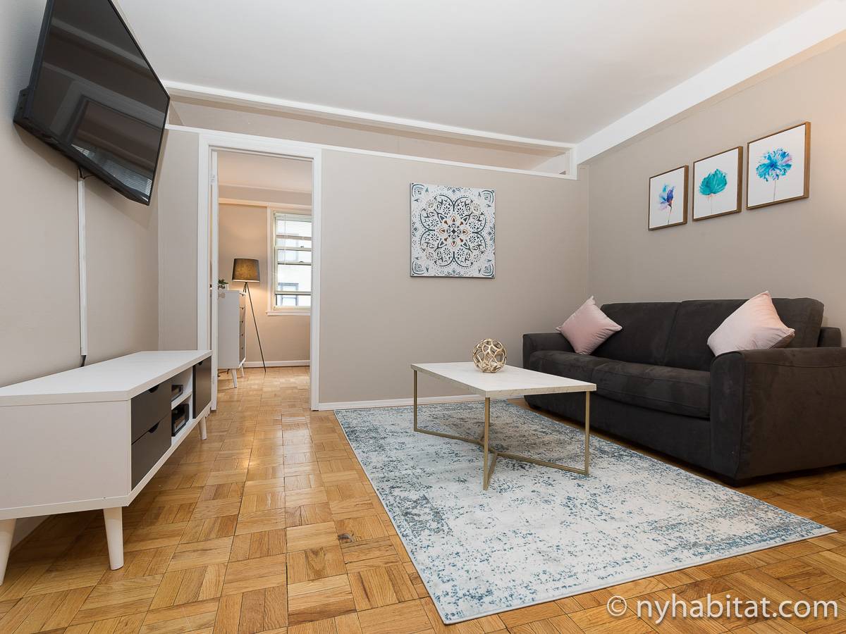 Diese 2-Zimmer-Wohnung befindet sich in der Upper East Side, nicht weit von Museen, Geschäften in der Madison Avenue und vielen Restaurants. Die Mietwohnung ist mit einem Hartholzboden und einer Klimaanlage ausgestattet. Das Wohnzimmer ist mit einem Sofa, das auch als Schlafsofa genutzt werden kann, Couchtisch auf einem Teppich und Flachbildfernseher ausgestattet. Essen Sie etwas am Esstisch mit zwei Stühlen. Die Küche ist mit Holzschränken und Elektrogeräten aus Edelstahl wie ein Kühlschrank, Gasherd und eine Spülmaschine ausgestattet. Das Schlafzimmer befindet sich hinter einer Glastür, wo Sie ein Queensize-Bett, Nachttische und eine Kommode für Stauraum finden. Bettwäsche und Handtücher werden gestellt. Das Badezimmer verfügt über eine Duschbadewanne, Toilette, ein Waschbecken und einen Spiegel.