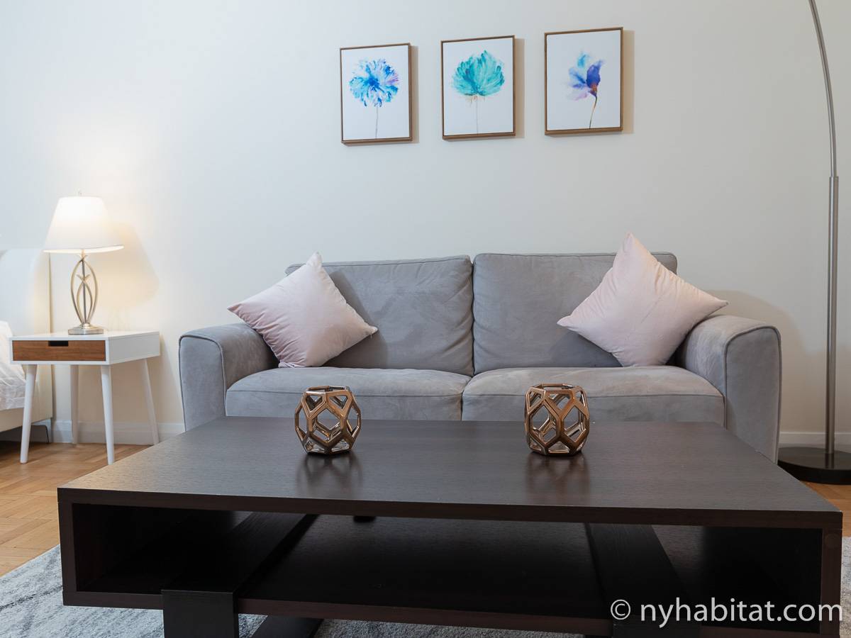 Diese möblierte Studiowohnung bietet einen Parkettboden, WLAN und Klimaanlagen. Der Wohnbereich verfügt über ein Sofa und einen Couchtisch, Teppich und wandmontierten Flachbildfernseher. Bei der Küche finden Sie einen Esstisch mit Stühlen, an dem Sie etwas essen können. Die Küche ist mit Schränken und Elektrogeräten aus Edelstahl wie einem Herd, Kühlschrank, einer Mikrowelle, Kaffeemaschine und Spülmaschine ausgestattet. Am anderen Ende der Mietwohnung finden Sie ein Queensize-Bett mit einem Nachttisch und eine Kommode für Stauraum. Das Badezimmer bietet eine Duschbadewanne, Toilette und einen Waschtisch.