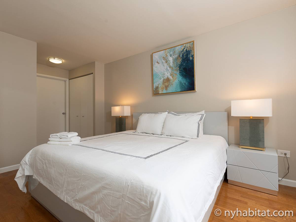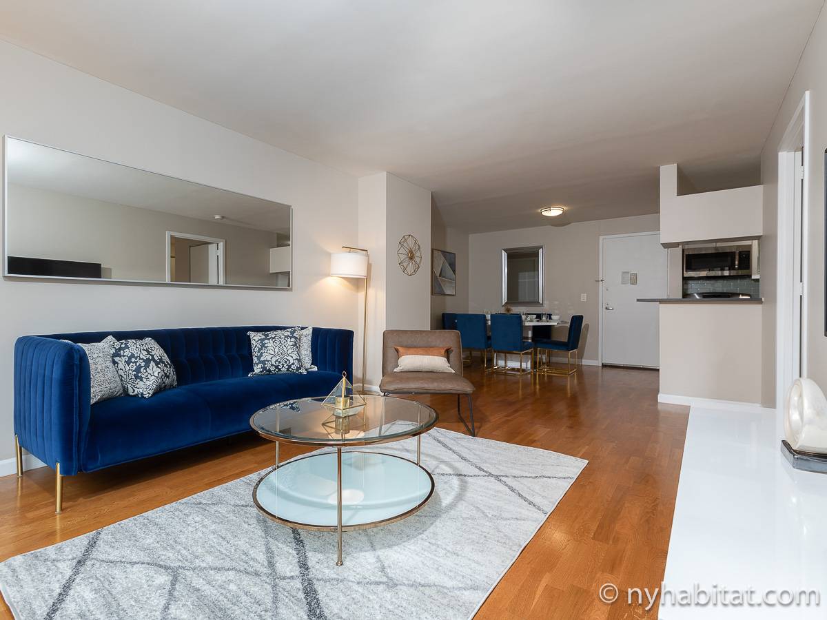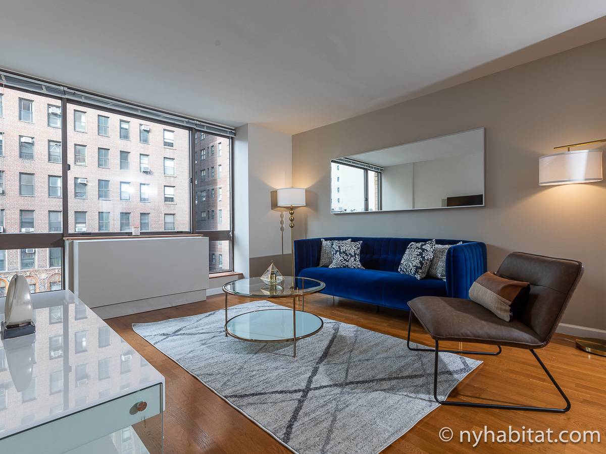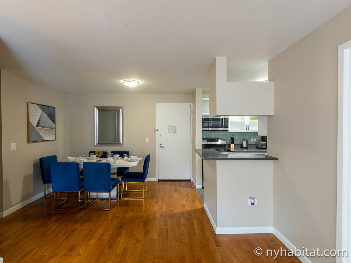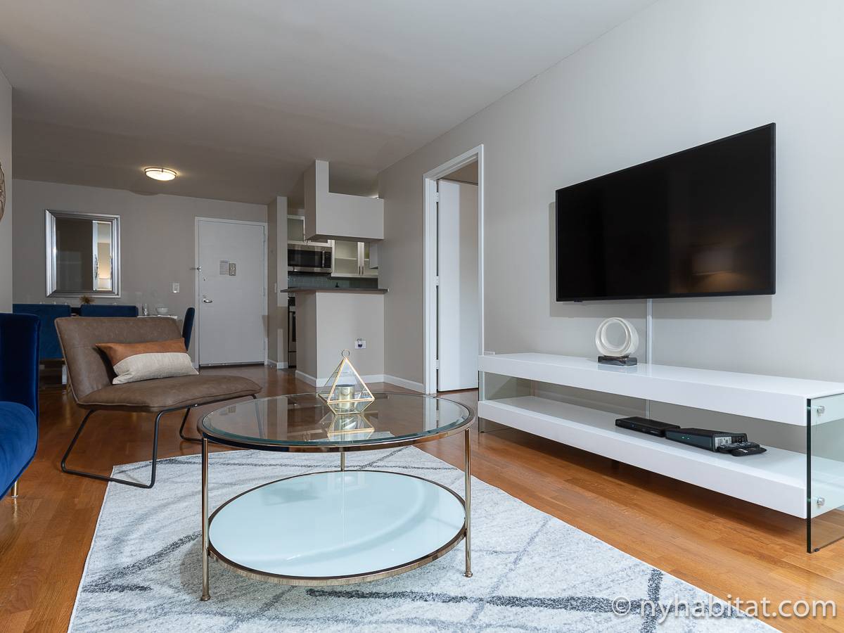 Die möblierte New Yorker Mietwohnung ist modern eingerichtet und bietet einen Hartholzboden. Die Fenster im Wohnzimmer bieten einen Blick auf die Stadt. Das Wohnzimmer ist mit einem Sofa, gepolsterten Stuhl, Couchtisch sowie wandmontierten Flachbildfernseher mit Kabelanschluss ausgestattet. Ein Esstisch mit sechs Stühlen befindet sich neben der offenen Küche. Die Küche ist mit Schränken samt Granitarbeitsflächen und Elektrogeräten aus Edelstahl einschließlich einem Herd, Toaster, Kühlschrank, Geschirrspüler und einer Mikrowelle ausgestattet. Beide Schlafzimmer verfügen über Queensize-Betten, Nachttische mit Lampen und Kommoden. Das Schlafzimmer 2 bietet zusätzlich einen Fernseher. In den beiden Badezimmern der 3-Zimmer-Wohnung sind jeweils eine Duschbadewanne, ein Spiegel und Waschtisch vorhanden. Möglichkeiten zum Waschen von Kleidung befinden sich im Gebäude.
